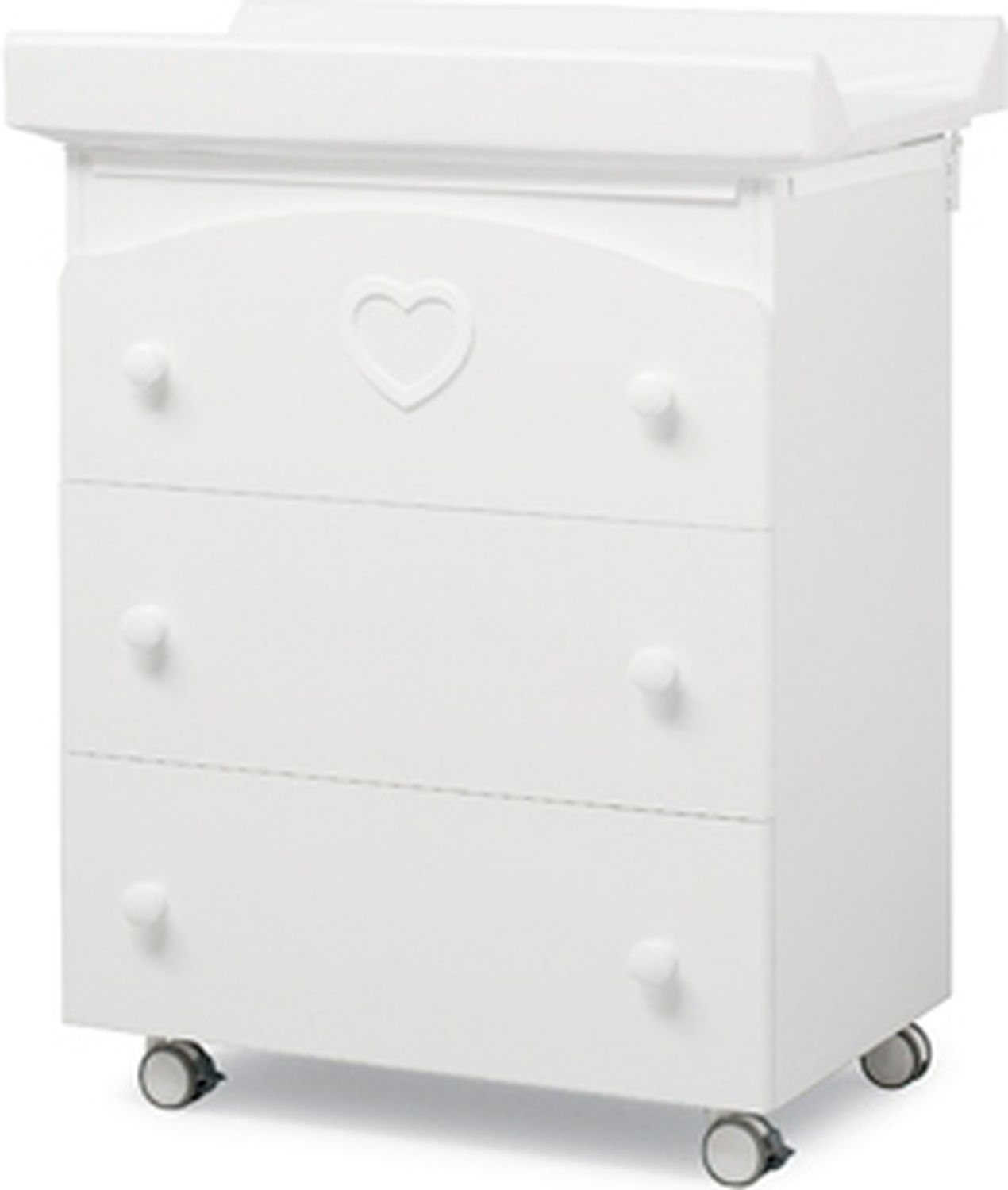Приятные особенности :классический образец итальянской мебели в современном осмыслении. Практичность, удобство и непревзойденный дизайн всегда выделяли продукцию итальянской компании Erbesi. Комод оснащен откидной пеленальной доской и ванночкой. Он состоит из трех вместительных выдвижных ящиков с бесшумным механизмом работы. Оснащен четырьмя колесиками со стопорной системой. Пеленальная доска и ванночка могут быть убраны, когда в них отпадет необходимость.