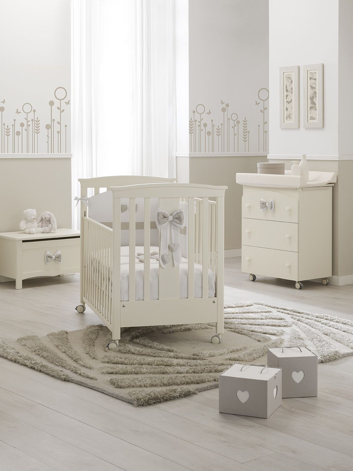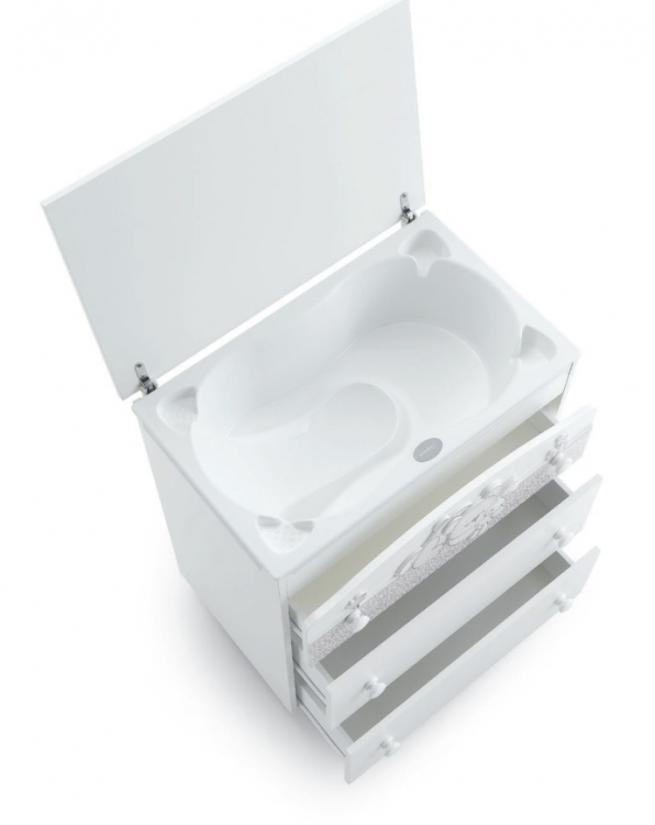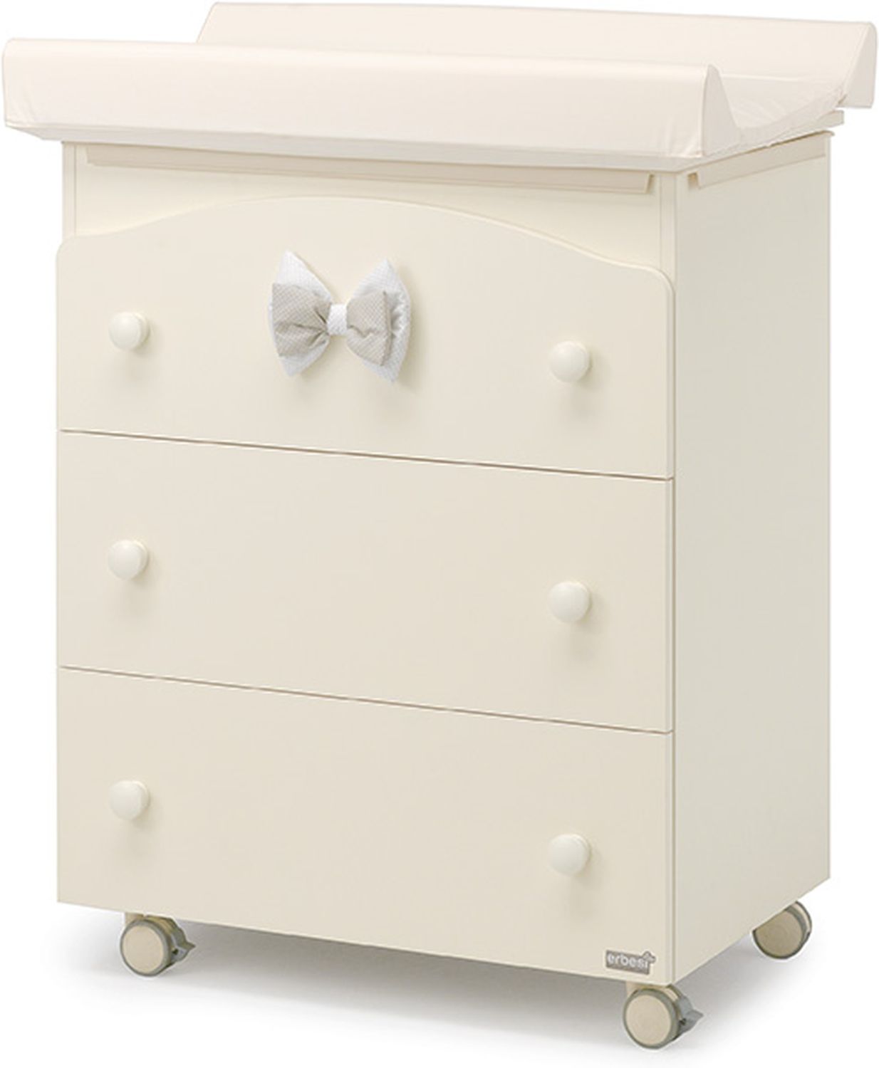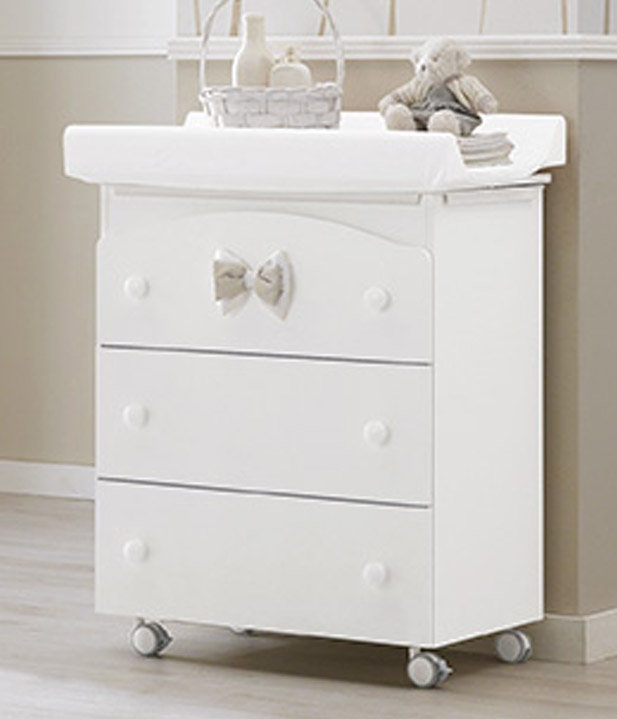 Приятные особенности комода : изысканный дизайн с необычным украшением в виде съемного текстильного бантика. Классическая конструкция белой или оттенка слоновой кости расцветок представляет собой специальный комод для новорожденного с анатомической ванночкой и пеленальной доской. С их помощью вы быстро завершите все гигиенические процедуры, помоете и переоденете кроху. В трех выдвижных ящиках хранится все самое необходимое для малыша: одежда, банные или постельные принадлежности, косметические средства, крема, подгузники и салфетки. Комод оборудован мобильными колесиками со стопором для свободного перемещение по дому. Фиксаторы не дадут изделию случайно сдвинуться с места без вашего ведома. Для детей постарше, когда необходимость в смене подгузника отпадет, демонтируйте ванночку и пеленальную доску. Такую модель можно использовать дальше, как полноценный взрослый комод.