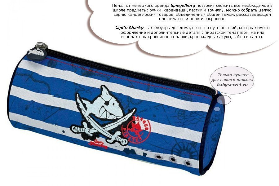 Приятные особенности пенала Spiegelburg Capt'n Sharky 30312/10876:стильный пенал на молнии. В такой пенал ребенок сможет сложить все необходимые ему предметы для рисования или же игрушки и прочие мелочи. Дизайн пенала выполнен в пиратском стиле, что непременно понравится мальчику. Компактный пенал удобно брать с собой в гости или в путешествие. Пенал станет отличным дополнением к целой серии канцелярских товаров Capt"n Sharky.