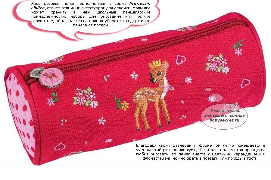 Приятные особенности пенала Prinzessin Lillifee 30355/10874/11852:ярко розовый пенал, выполненный в серии Prinzessin Lillifee, станет отличным аксессуаром для девочки. Малышка может хранить в нем школьные канцелярские принадлежности, наборы для рисования или мелкие игрушки. Удобная застежка-молния убережет содержимое пенала от потери.Благодаря своим размерам и форме, он легко помещается в ученический рюкзак или сумку. Если ваша маленькая принцесса любит рисовать, то пенал вместе с цветными карандашами и фломастерами можно брать в поездки или походы в гости.