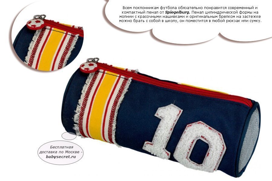 Приятные особенности пенала Spiegelburg Soccer 10882:всем поклонникам футбола обязательно понравится современный и компактный пенал от Spiegelburg. Пенал цилиндрической формы на молнии с красочными нашивками и оригинальным брелком на застежке можно брать с собой в школу, он поместится в любой рюкзак или сумку.