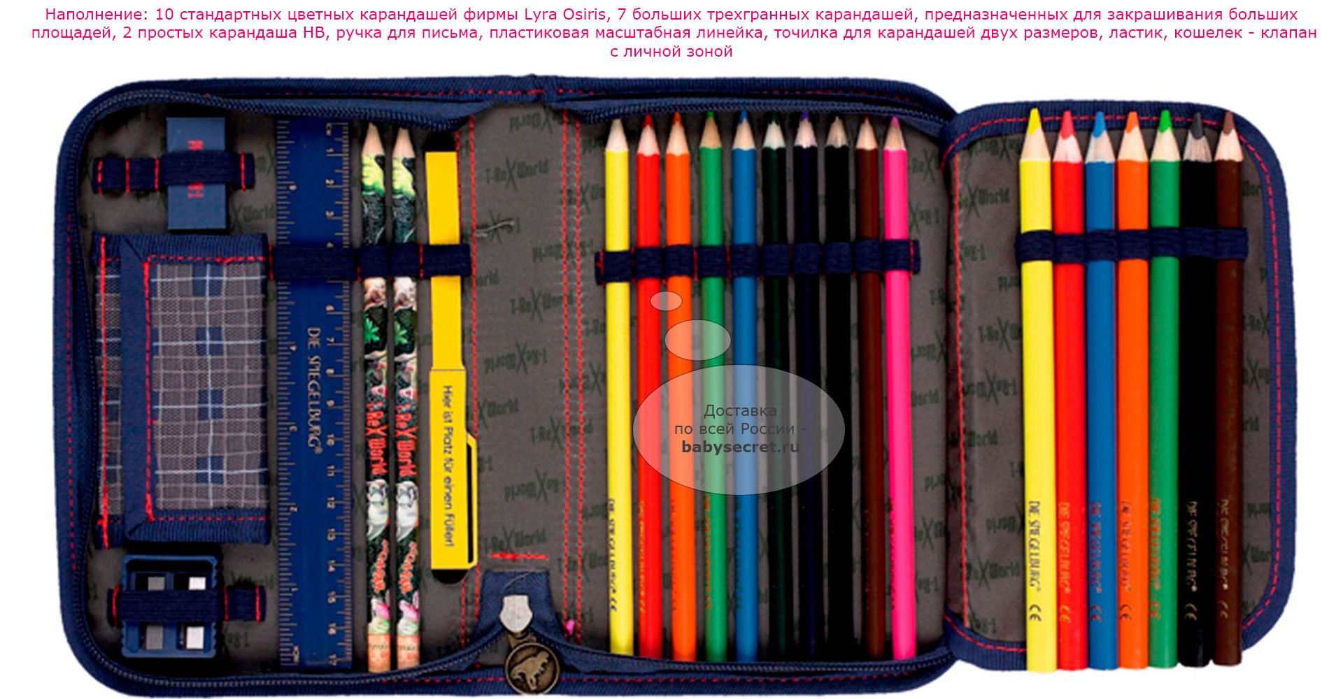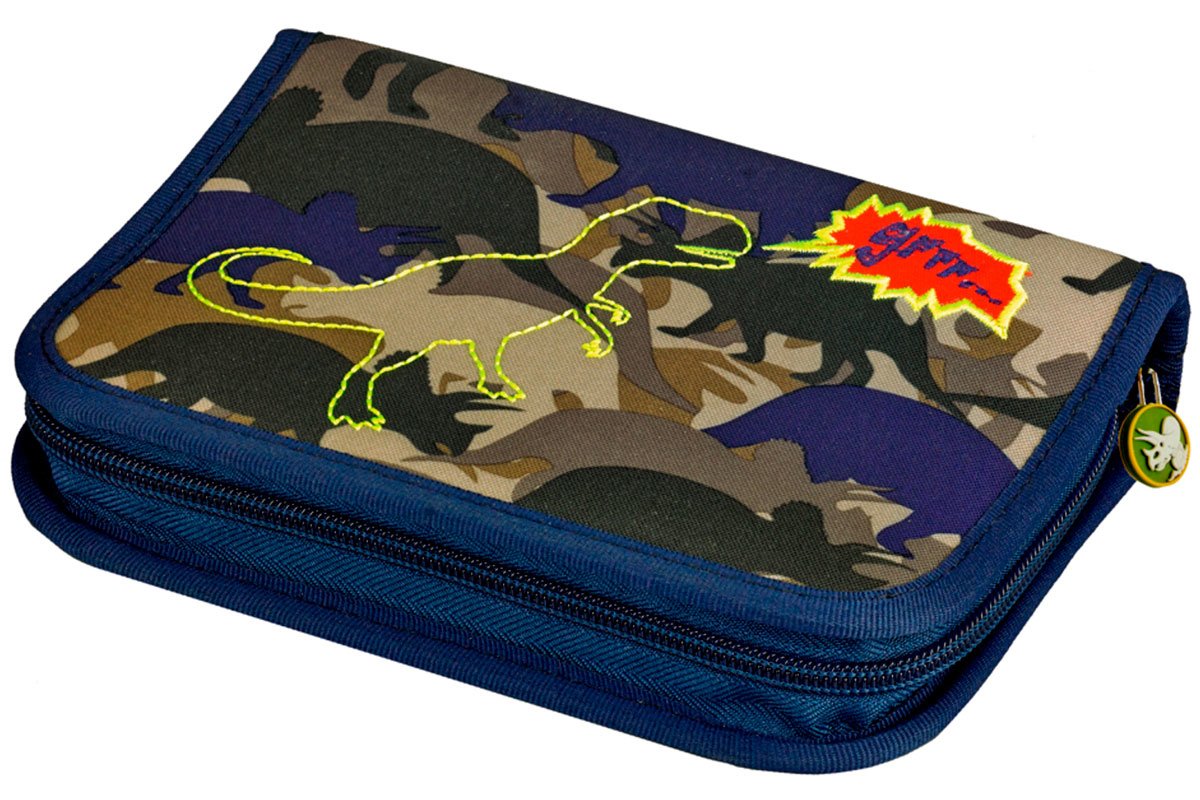 Приятные особенности пенала Spiegelburg T-Rex World с наполнением 11836:корпус пенала украшен принтами в виде силуэтов разнообразных динозавров. Самый опасный и страшный динозавр - Тираннозавр, рычит. Сам пенал окрашен в синий цвет. Он сделан из прочного и качественного полиэстера. Пенал закрывается на молнию.Форма пенала позволяется складывать в него расписание и учебные карточки, карандаши и ручки, точилку для карандашей и ластик, линейку и замазку. Пенал прекрасно разместится среди учебников в портфеле.