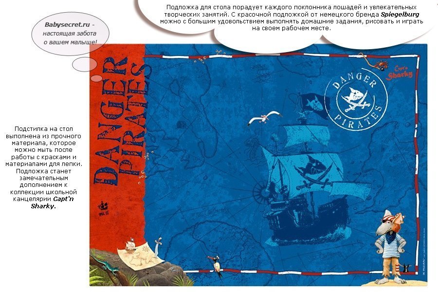 Приятные особенности подложки для письменного стола Spiegelburg Capt'n Sharky 21395/11115:красочная подложка убережет стол от следов карандашей, фломастеров, ручек, пролитых жидкостей, царапин. Подложка изготовлена из прочного материала с нескользящей поверхностью, сбоку дополнена прозрачными карманами. Дизайн выполнен в пиратском стиле, что непременно понравится мальчикам. Подложка станет отличным дополнением к целой серии канцелярских товаров "Capt"n Sharky".