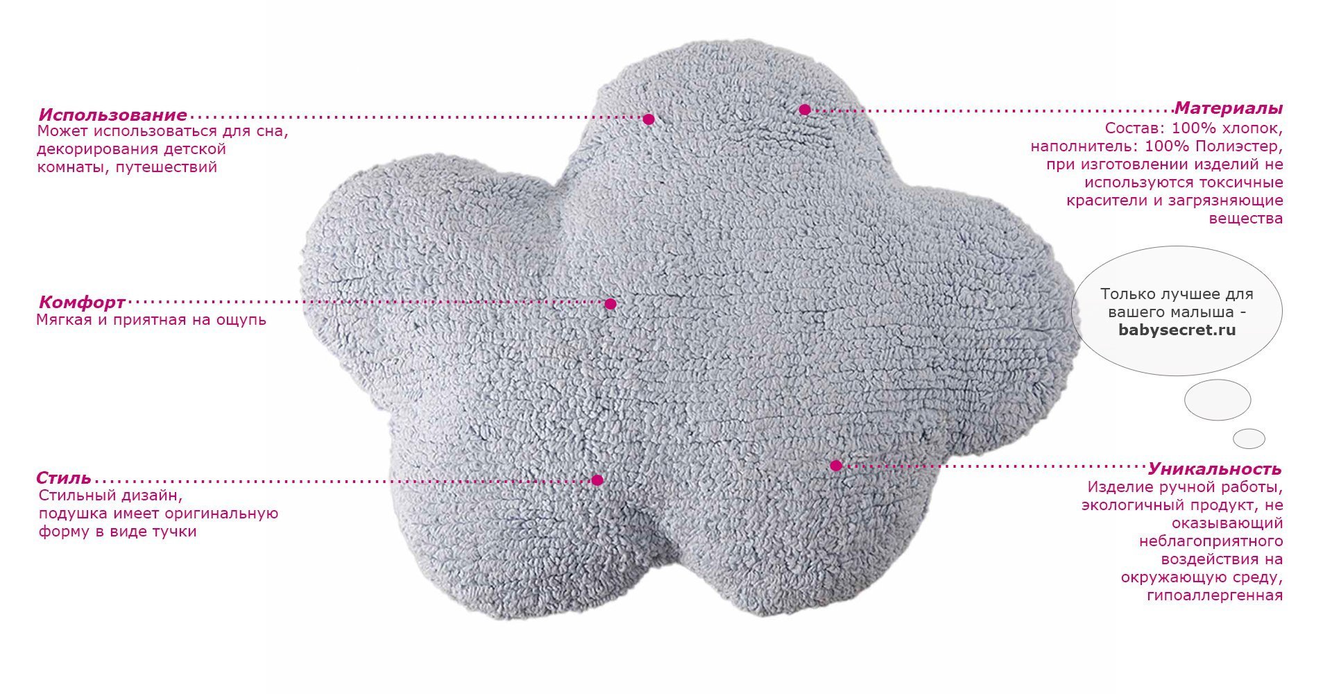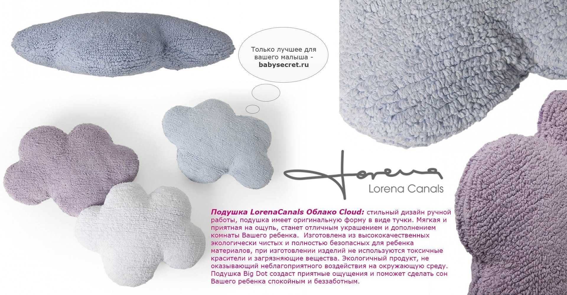 Приятные особенности подушкиLorenaCanalsОблако Cloud:стильный дизайн ручной работы, подушка имеет оригинальную форму в виде тучки. Мягкая и приятная на ощупь, станет отличным украшением и дополнением комнаты Вашего ребенка. Изготовлена из высококачественных экологически чистых и полностью безопасных для ребенка материалов, при изготовлении изделий не используются токсичные красители и загрязняющие вещества. Экологичный продукт, не оказывающий неблагоприятного воздействия на окружающую среду. Подушка Big Dot создаст приятные ощущения и поможет сделать сон Вашего ребенка спокойным и беззаботным.