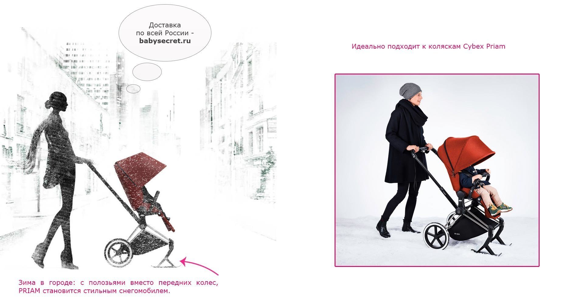 Приятные особенности полозьев для коляски Cybex Priam : заменив передние колеса на полозья, Priam превращается в стильный снегоход.