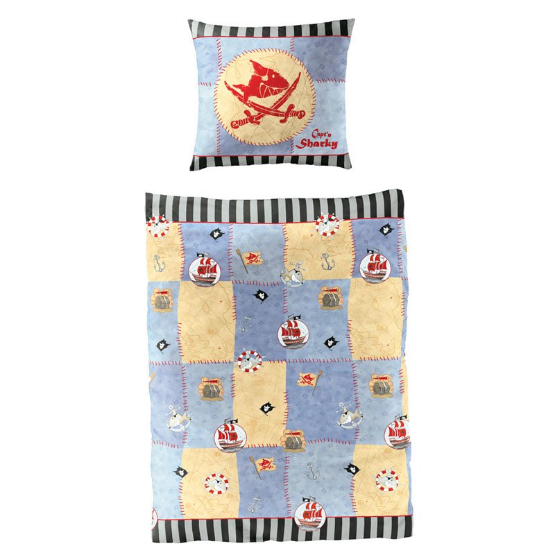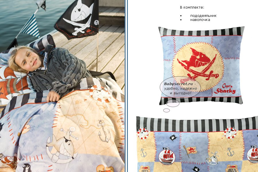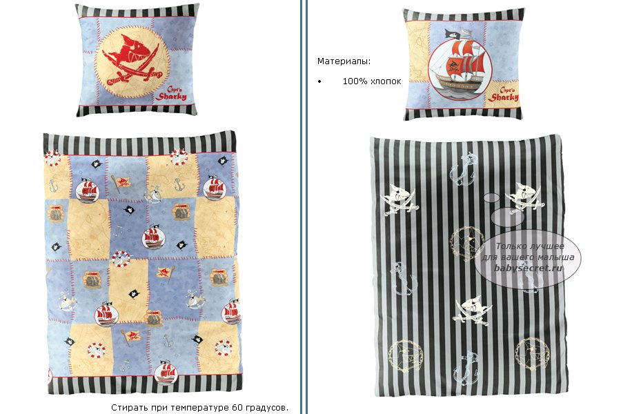 Приятные особенности постельного белья Spiegelburg Capt'n Sharky Акула:на палубу, и полный вперед! Великолепное постельное белье из коллекции Capt'n Sharky, посвященное любимому детскому герою – пирату, авантюристу и искателю сокровищ. Постельное белье Акула станет отличным украшением комнаты Вашего ребенка и создаст в детской удивительную атмосферу дальних странствий и захватывающих приключений. Яркий рисунок, натуральный хлопок, прекрасно сочетается с предметами мебели коллекции.