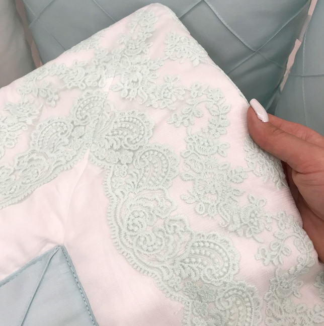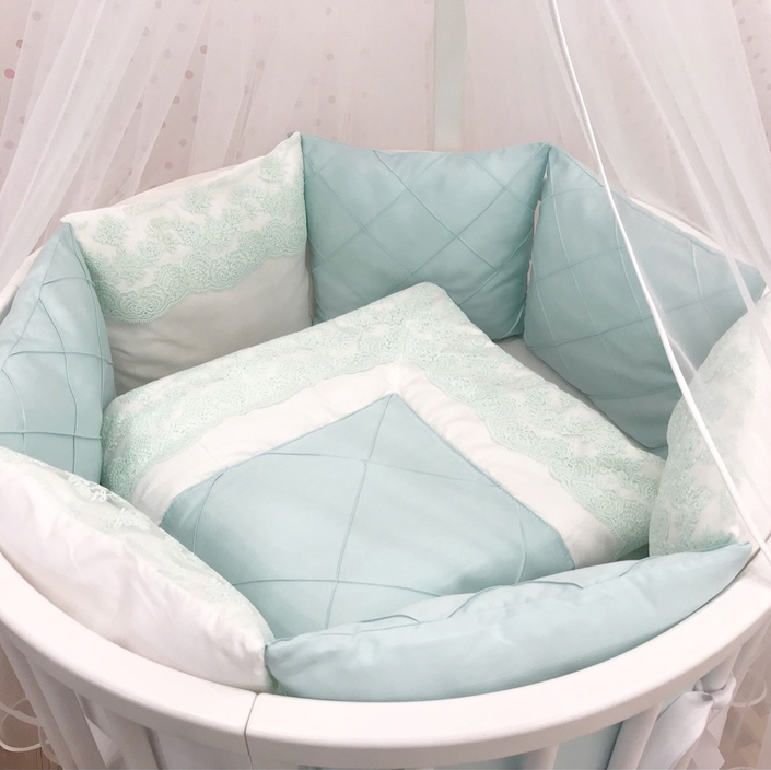 Приятные особенности:Кружевной мятный комплект из премиального мерсинизированного сатина погружает в атмосферу роскоши и красоты с рождения. Прикоснитесь и вы точно влюбитесь в этот нежный комплект цвета тиффани!