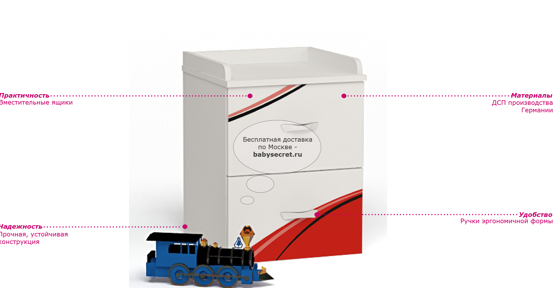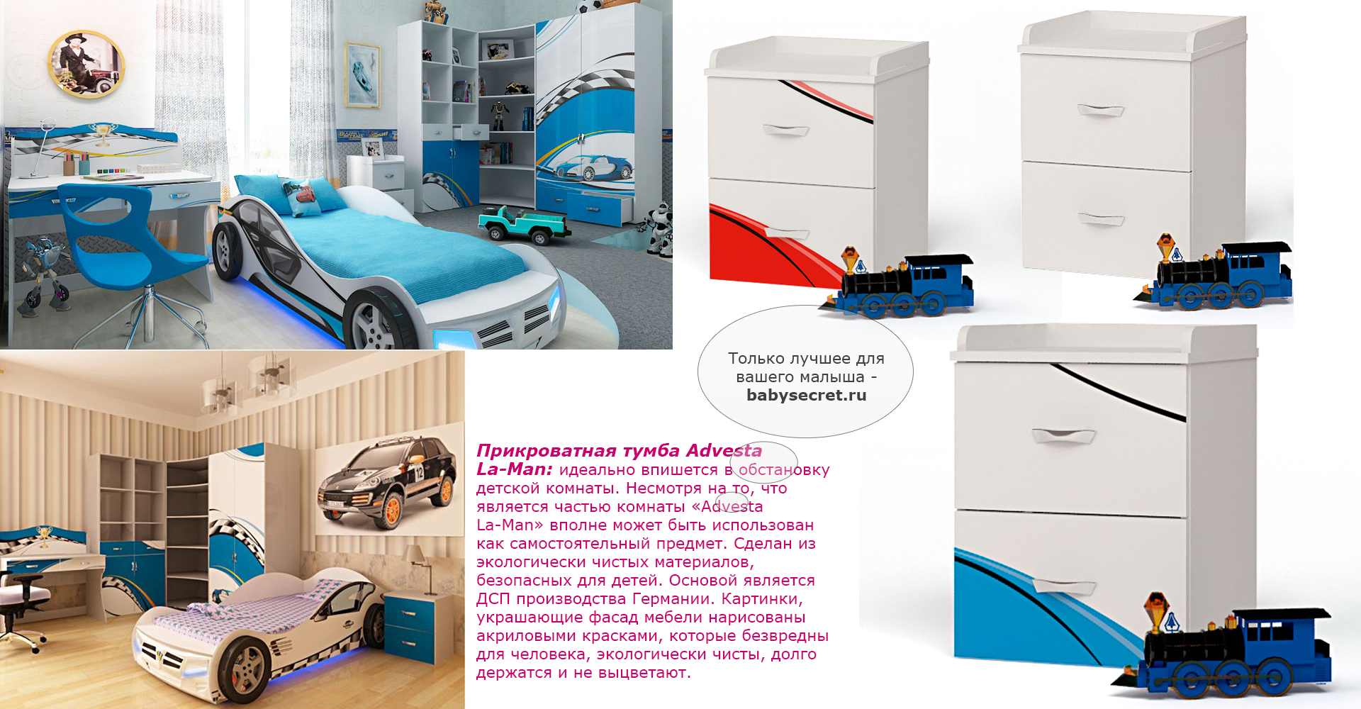 Приятные особенности прикроватной тумбы La-Man: тумба сделана из экологически чистых материалов, безопасных для детей. Основой является ДСП производства Германии, где предъявляются самые строгие требования к качеству.У мебели есть преимущество, которое понравится, как детям, так и взрослым. Детскую мебель можно красиво оформить специальными картинками, которые изготовлены из прочных и долговечных материалов, позволяющих проводить влажную уборку. Картинки, украшающие фасады мебели нарисованы акриловыми красками, которые безвредны для человека, экологически чисты, долго держатся и не выцветают.