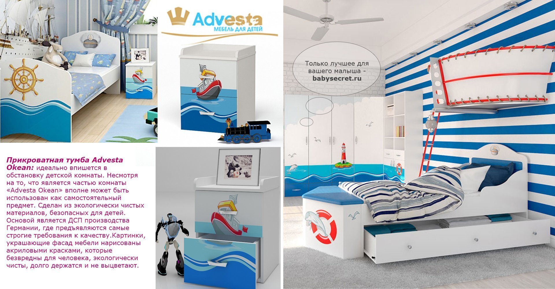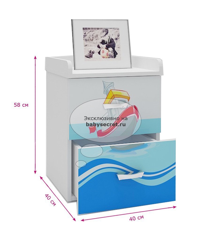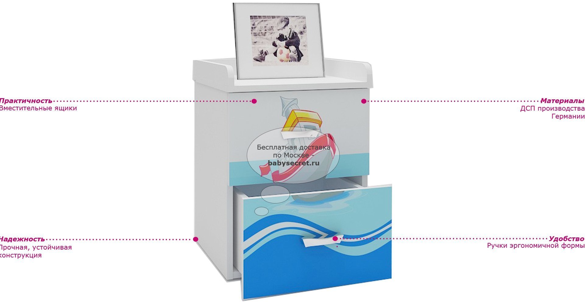 Производитель: ABC King Материалы: Основные характеристики: Приятные особенности прикроватной тумбы Океан:тумба сделана из экологически чистых материалов, безопасных для детей.Основой является ДСП производства Германии, где предъявляются самые строгие требования к качеству. У мебели есть преимущество, которое понравится, как детям, так и взрослым. Детскую мебель можно красиво оформить специальными картинками, которые изготовлены из прочных и долговечных материалов, позволяющих проводить влажную уборку. Картинки, украшающие фасады мебели нарисованы акриловыми красками, которые безвредны для человека, экологически чисты, долго держатся и не выцветают. Общие размеры:прикроватная тумба: 40x58x40 смГабариты в упаковке (ШxДxВ):Общий объём коробок: 0.04 м3 21 кг Коробка 3: 16x17x50 см 7 кг Коробка 2: 50x40x14 см 7 кг Коробка 1: 42x2x42 см 7 кгГарантия: 6 мес.