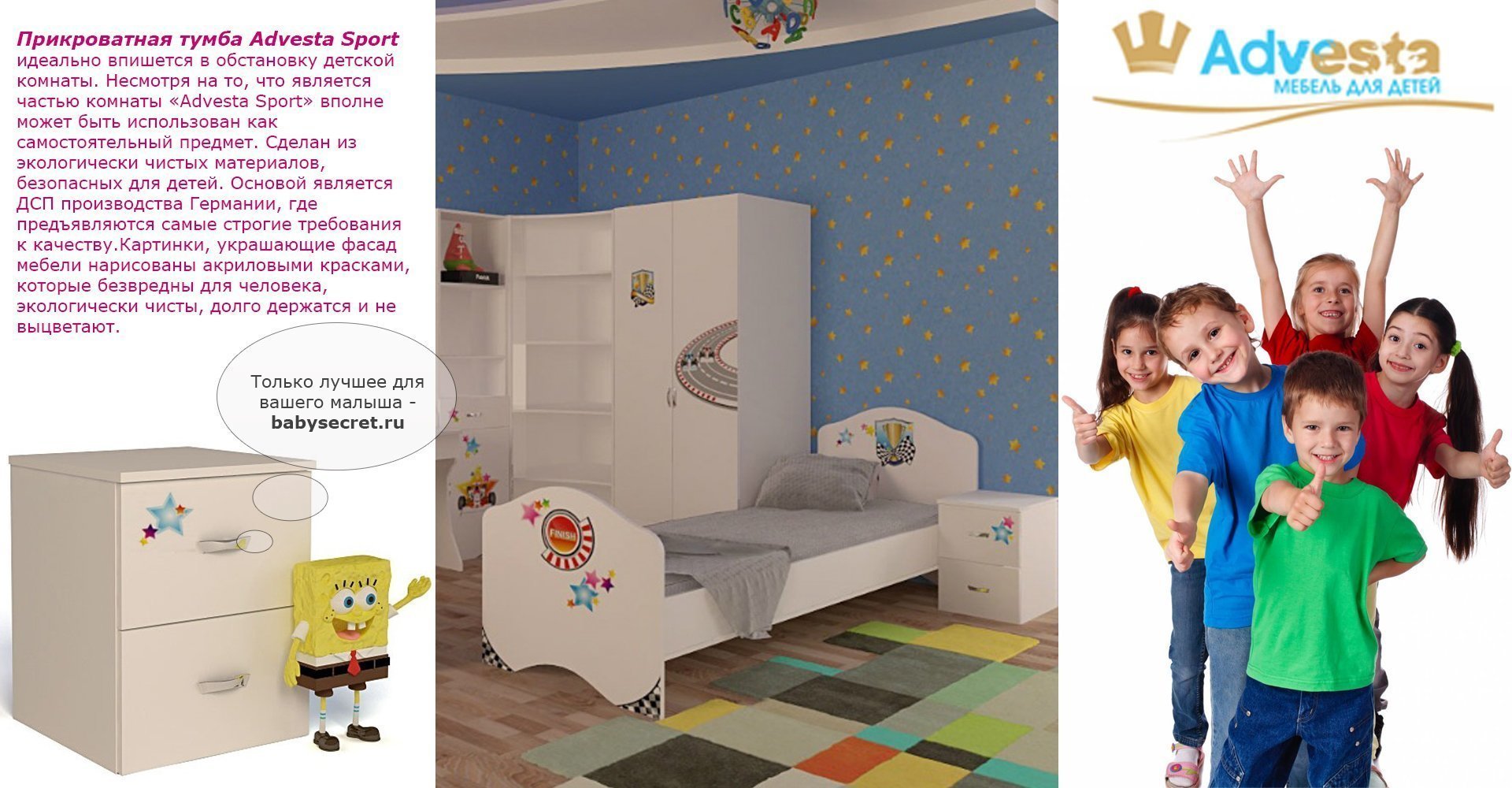 Приятные особенности прикроватной тумбы Sport: тумба сделана из экологически чистых материалов, безопасных для детей. Основой является ДСП производства Германии, где предъявляются самые строгие требования к качеству. У мебели есть преимущество, которое понравится, как детям, так и взрослым. Детскую мебель можно красиво оформить специальными картинками, которые изготовлены из прочных и долговечных материалов, позволяющих проводить влажную уборку. Картинки, украшающие фасады мебели нарисованы акриловыми красками, которые безвредны для человека, экологически чисты, долго держатся и не выцветают.