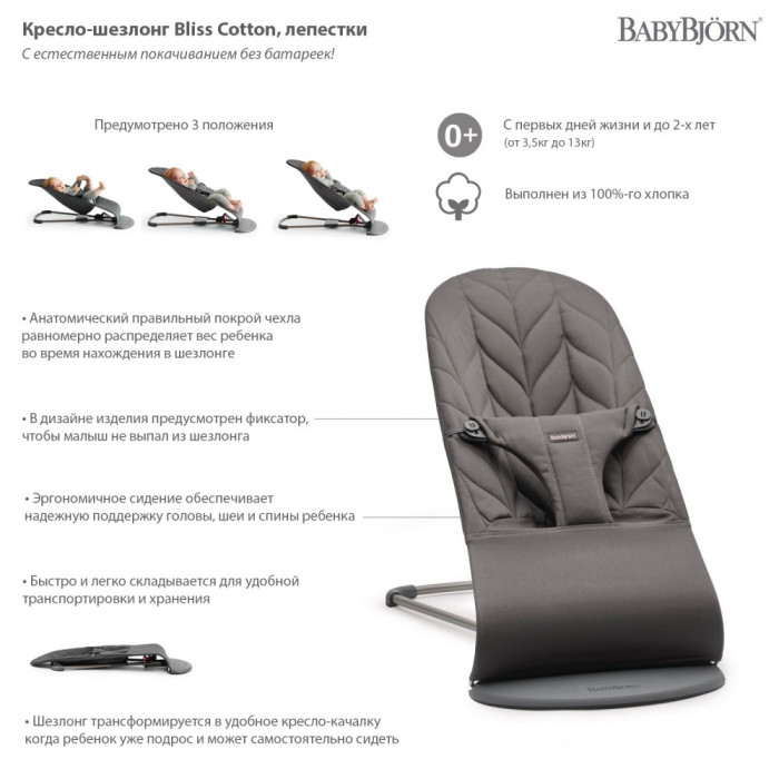 Приятные особенности: Сдержанные цветовые решения вызывают ассоциации легкости, спокойствия и блаженства. Эргономичное сидение обеспечивает надежную поддержку головы, шеи и спины ребенка. Предусмотрено три положения: для игры, отдыха и сна. Легким движением можно поменять верхнее положение на нижнее, в котором малышу будет комфортнее заснуть. Анатомический правильный покрой чехла равномерно распределяет вес ребенка во время нахождения в шезлонге. Этот фактор очень важен для маленьких детей, чьи мышцы еще не развиты. Ребенок своими движениями сам приводит кресло – шезлонг в действие. Для работы шезлонга не требуются ни батареек, ни электричества. В дизайне изделия предусмотрен фиксатор для малыша, чтобы ребенок не выпал из шезлонга. Когда ребенок становится уже более самостоятельным чехол можно снять и перевернуть его другой стороной. Таким образом, шезлонг трансформируется в удобное кресло-качалку. Быстро и легко складывается для удобной транспортировки и хранения.