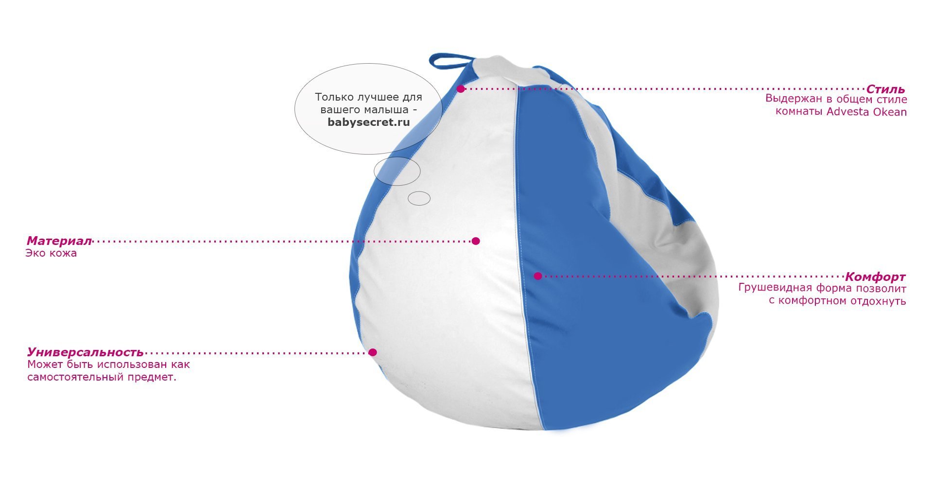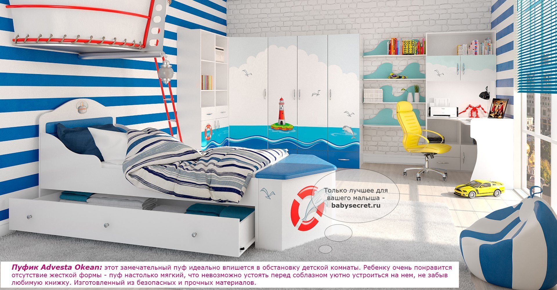 Приятные особенности пуфика Okean: этот замечательный пуф идеально впишется в обстановку детской комнаты. Несмотря на то, что пуф является частью комнаты «Okean» он вполне может быть использован как самостоятельный предмет. Прежде всего, ребенку очень понравится отсутствие жесткой формы - пуф настолько мягкий, что невозможно устоять перед соблазном уютно устроиться на нем, не забыв любимую книжку. Изготовленный из безопасных и прочных материалов, пуф не требует каких-то особых ухищрений в вопросе ухода, так что мама так же оценит эту новинку по достоинству.