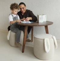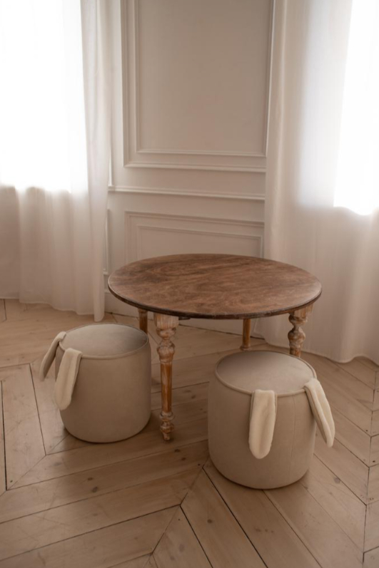 Приятные особенности: Пуф Amari с декором ушки зайка. Моющаяся обивка светлый велюр с ушками иск. мех кролик светлого цвета
