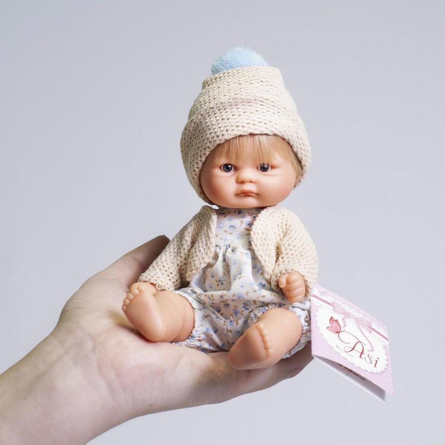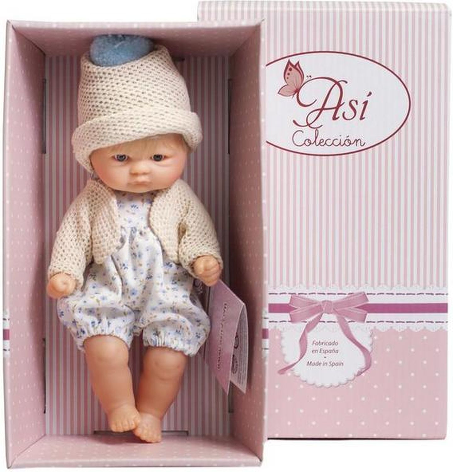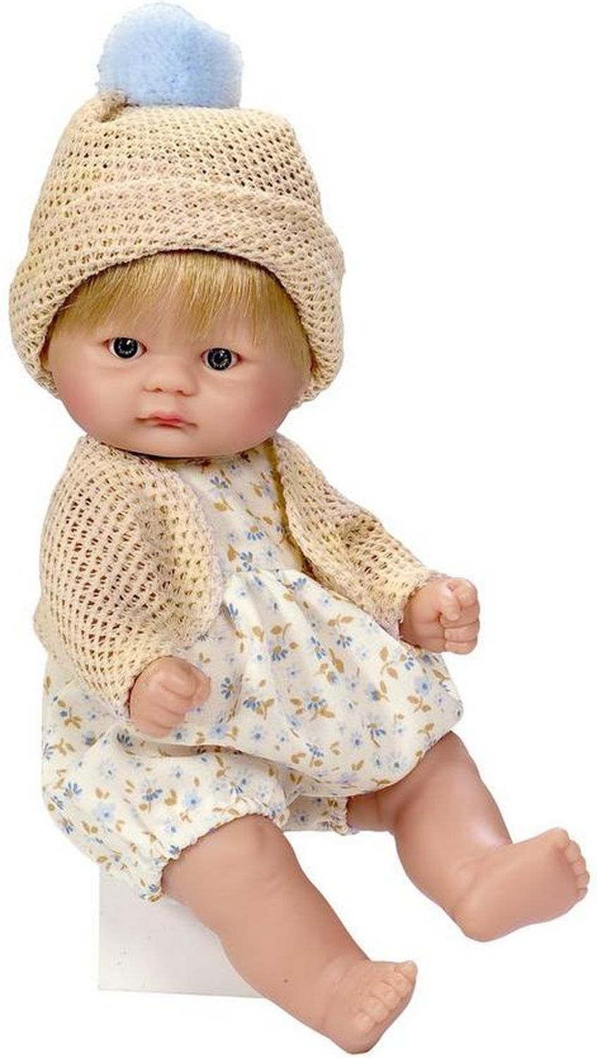 Приятные особенности :Очаровательный пупсик из новой коллекции Испанского кукольного дома ASI совсем крошка, всего 20 см, так и хочется взять его на ручки.У пупсика светлые короткие прошитые волосики, милое личико, выполнен полностью из винила, что позволяет его купать.Одет в комбинезончик, кофточку и шапочку с помпоном.Пупсик упакован в красивую подарочную коробочку!