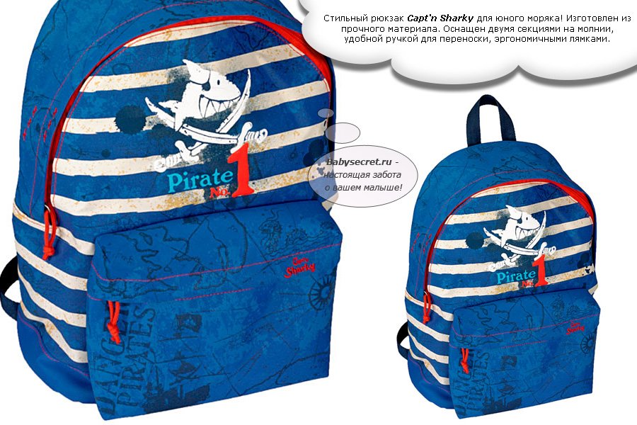 Приятные особенностирюкзака SpiegelburgCapt'n Sharky 10530:стильный рюкзак Capt'n Sharky для юного моряка! Изготовлен из прочного материала.Оснащен двумя секциями на молнии, удобной ручкой для переноски, эргономичными лямками.
