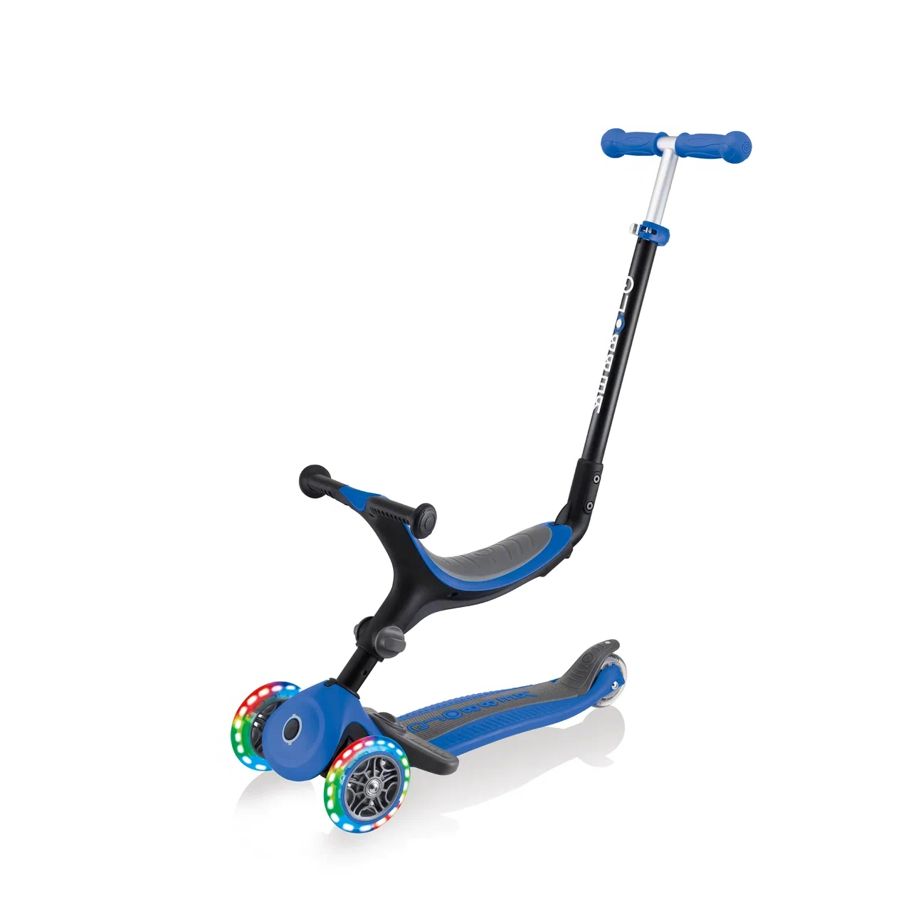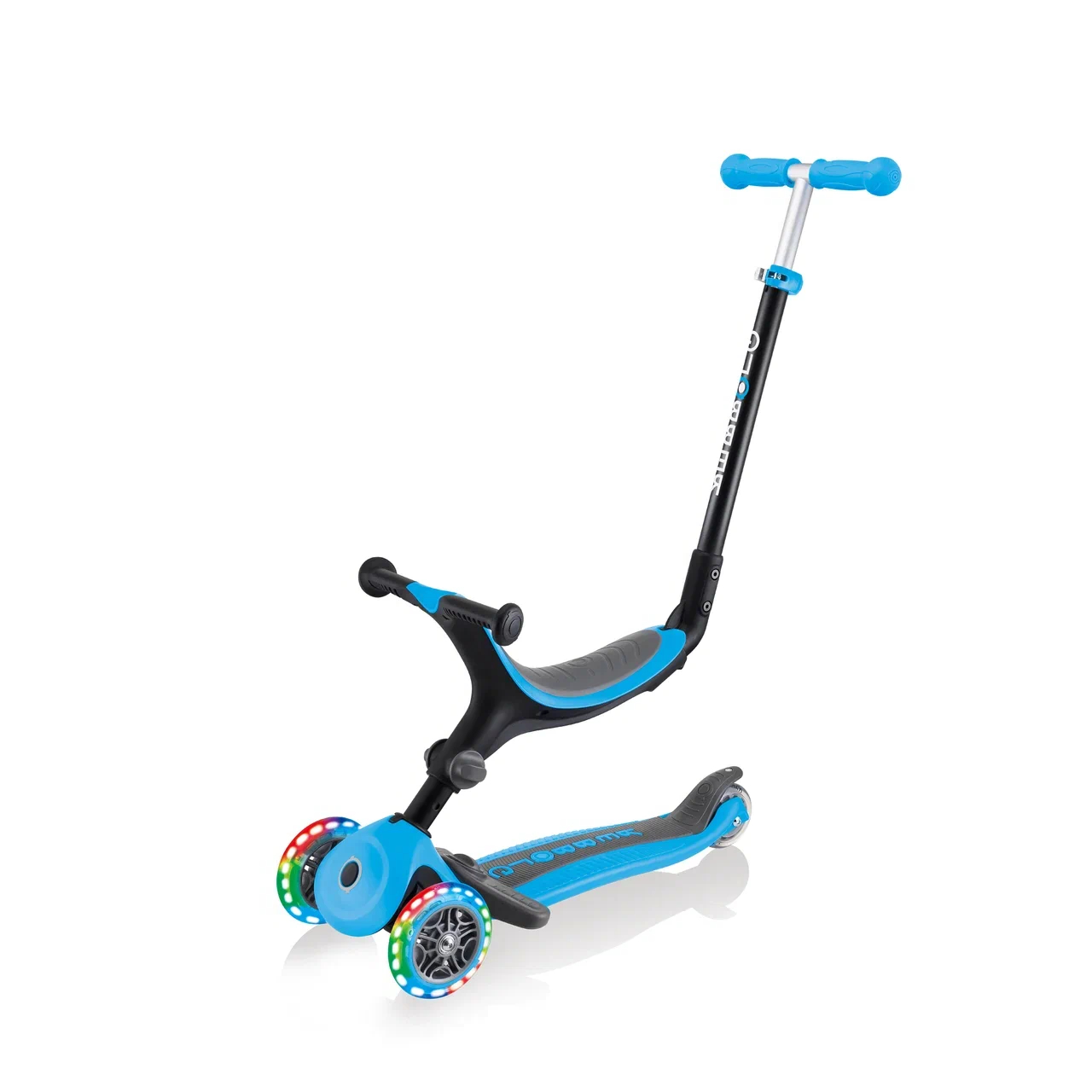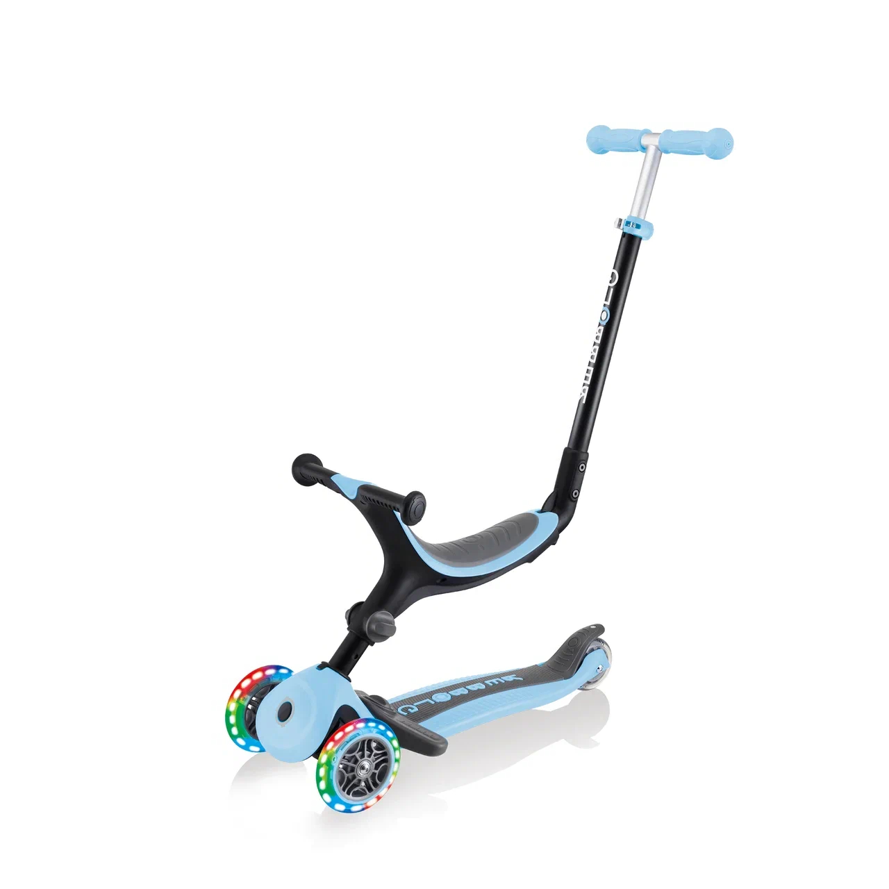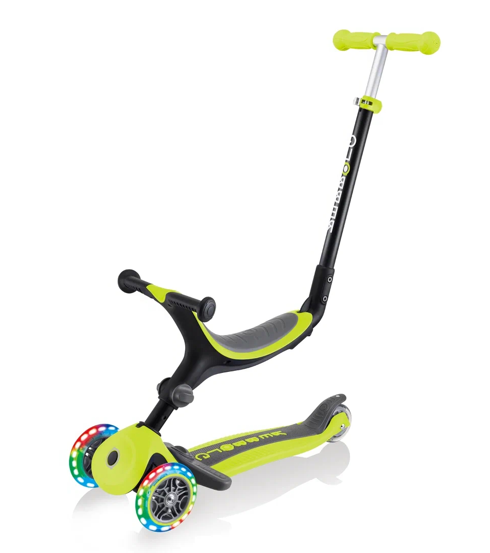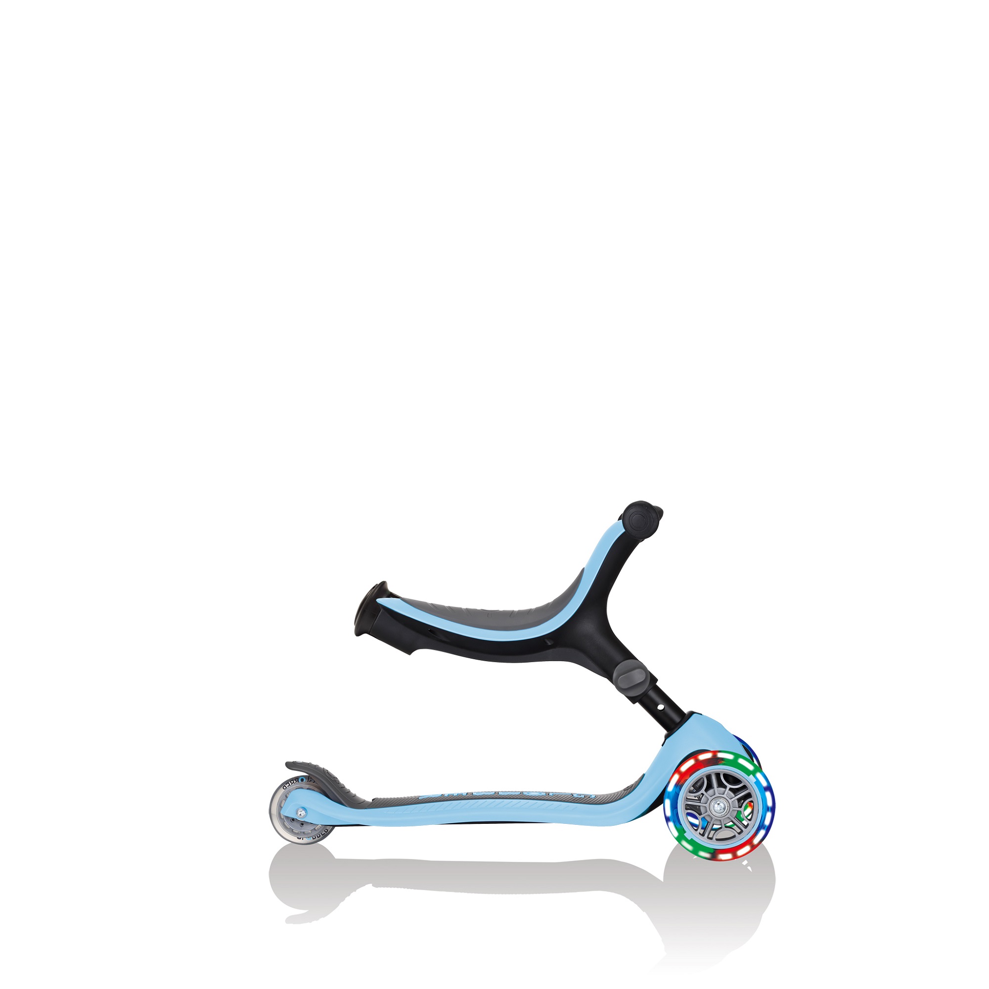 Приятные особенности:СамокатGo Up Foldable Lights — стильный и практичный безвинтовой трансформер, который без дополнительных инструментов может превратиться в 3 разных средства передвижения: каталку, беговел и самокат. Мягкое сидение регулируется по высоте для максимального комфорта. Удлиненный и широкий задний тормоз обеспечивает эффективность торможения и продлевает срок службы колес. Есть длинная и широкая съемная подставка для ног с легко откручиваемой ручкой. Запатентованная кнопка блокировки рулевого управления фиксирует рулевую систему двух передних колес только для движения вперед и назад, чтобы ребенок не упал. Передние литые колеса оснащены двумя безбатарейными светодиодными фонарями, которые мигают красным, синим и зеленым цветами. Конструкция в виде каталки или беговела рассчитана для детей от 15-ти месяцев до 3-х лет весом до 20 кг. Самокат с Т-образной рулевой стойкой, регулируемой по высоте, и эргономичными ручками подходит для детей 3-7 лет до 50 кг.