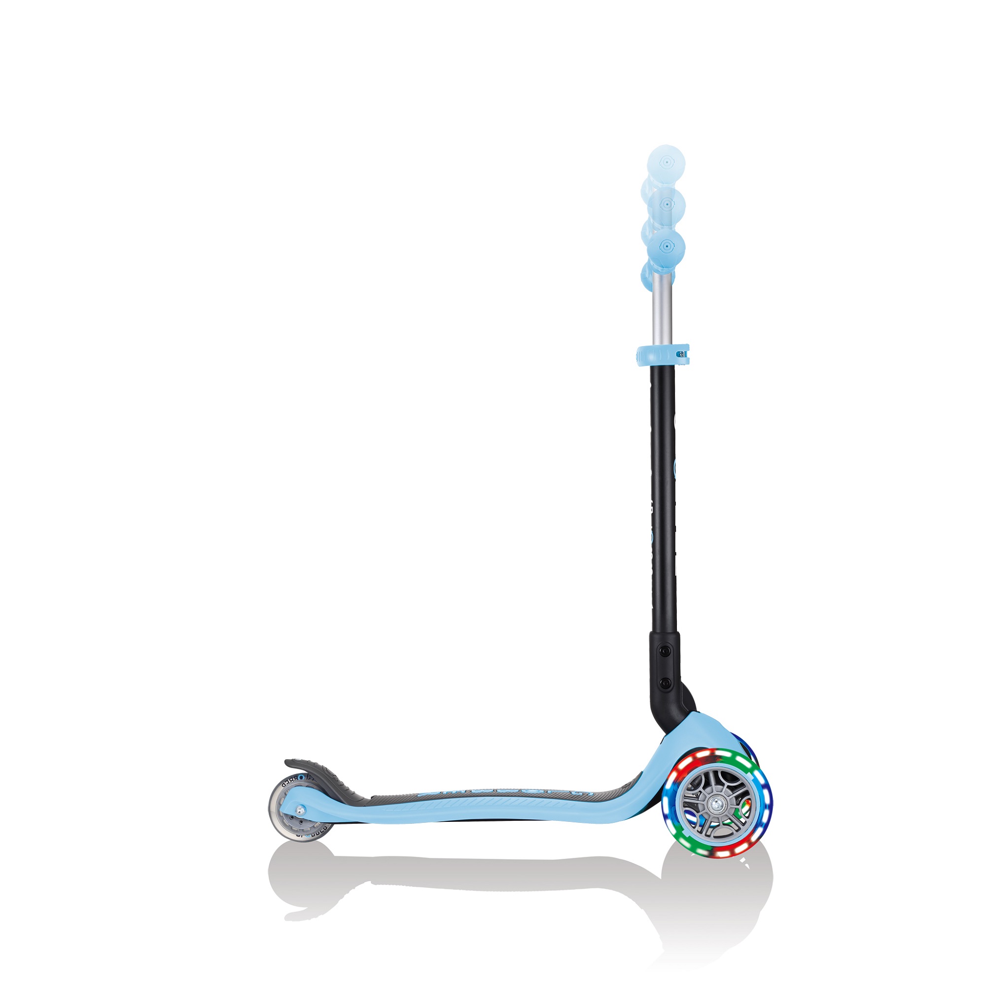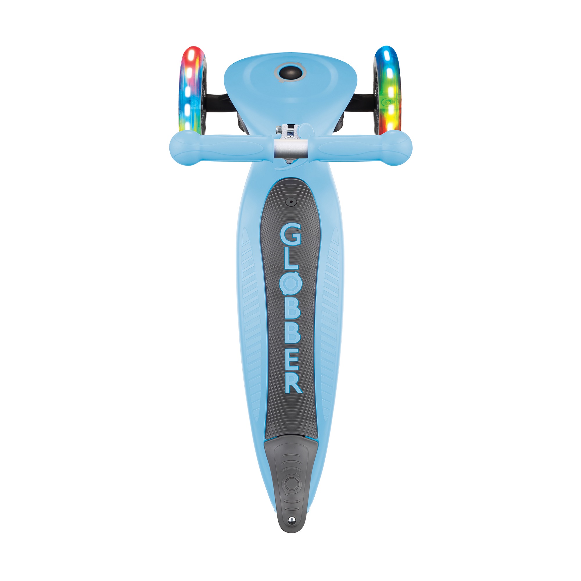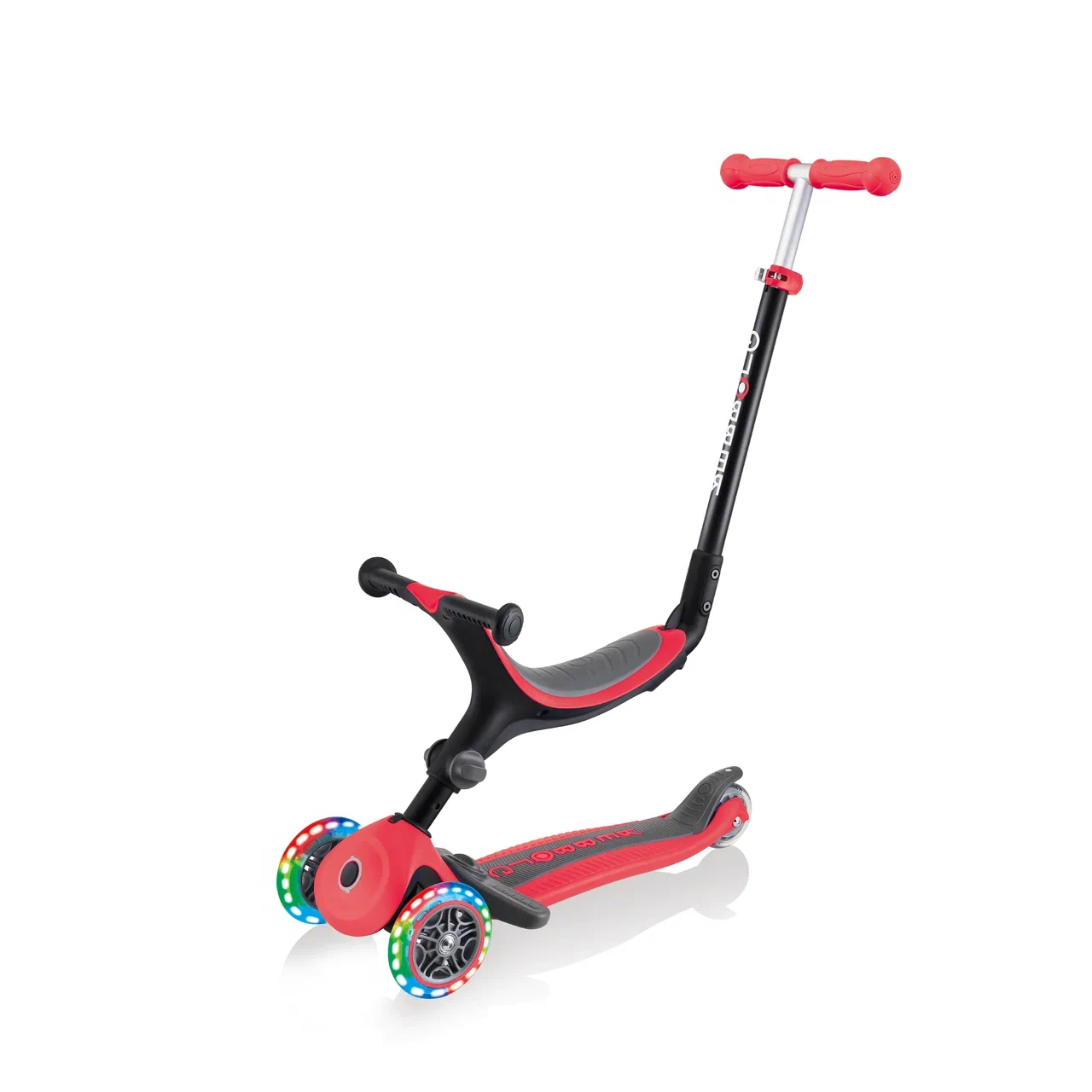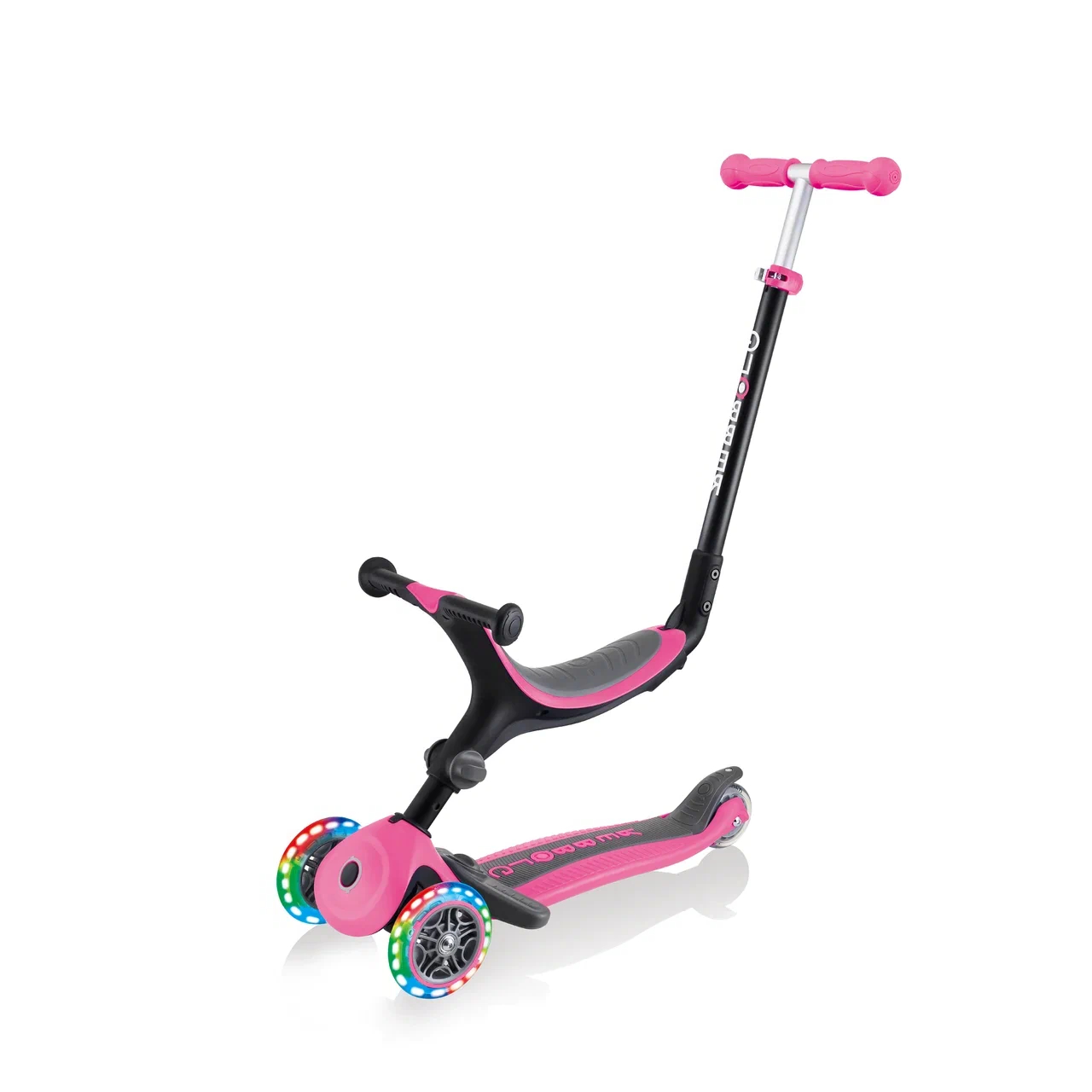 Приятные особенности:СамокатGo Up Foldable Lights — стильный и практичный безвинтовой трансформер, который без дополнительных инструментов может превратиться в 3 разных средства передвижения: каталку, беговел и самокат. Мягкое сидение регулируется по высоте для максимального комфорта. Удлиненный и широкий задний тормоз обеспечивает эффективность торможения и продлевает срок службы колес. Есть длинная и широкая съемная подставка для ног с легко откручиваемой ручкой. Запатентованная кнопка блокировки рулевого управления фиксирует рулевую систему двух передних колес только для движения вперед и назад, чтобы ребенок не упал. Передние литые колеса оснащены двумя безбатарейными светодиодными фонарями, которые мигают красным, синим и зеленым цветами. Конструкция в виде каталки или беговела рассчитана для детей от 15-ти месяцев до 3-х лет весом до 20 кг. Самокат с Т-образной рулевой стойкой, регулируемой по высоте, и эргономичными ручками подходит для детей 3-7 лет до 50 кг.