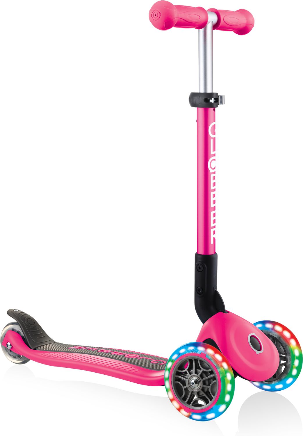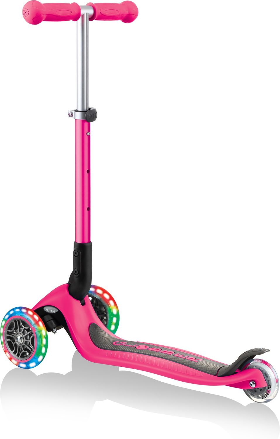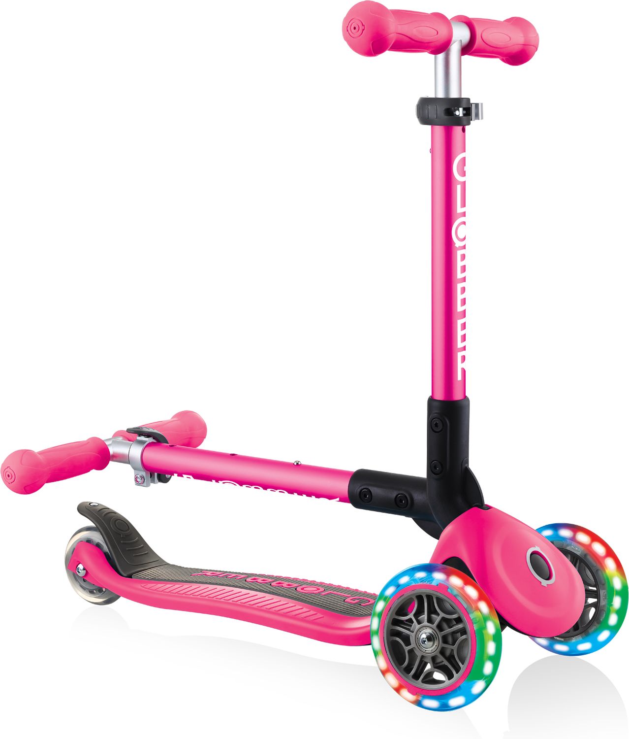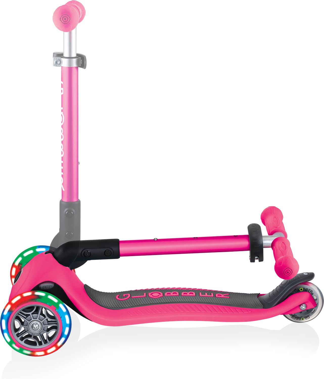 Самокат оснащен запатентованной системой складывания с помощью кнопки.