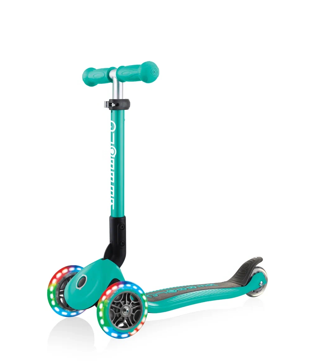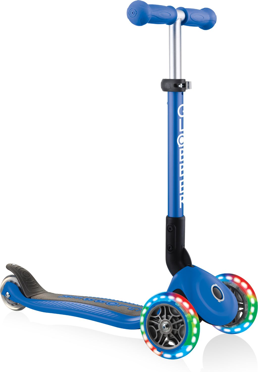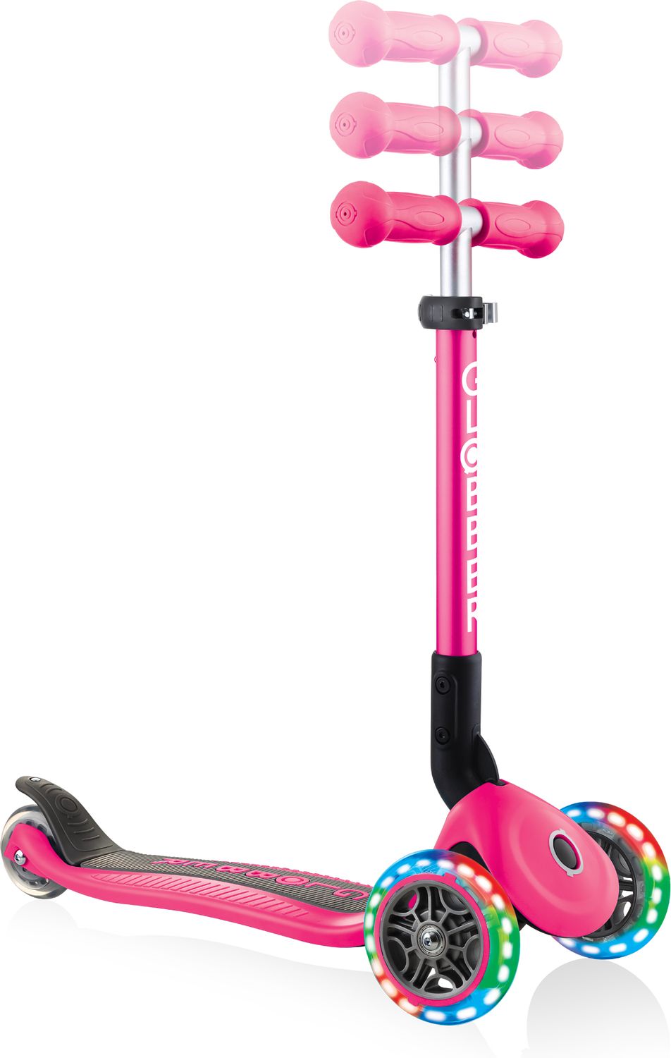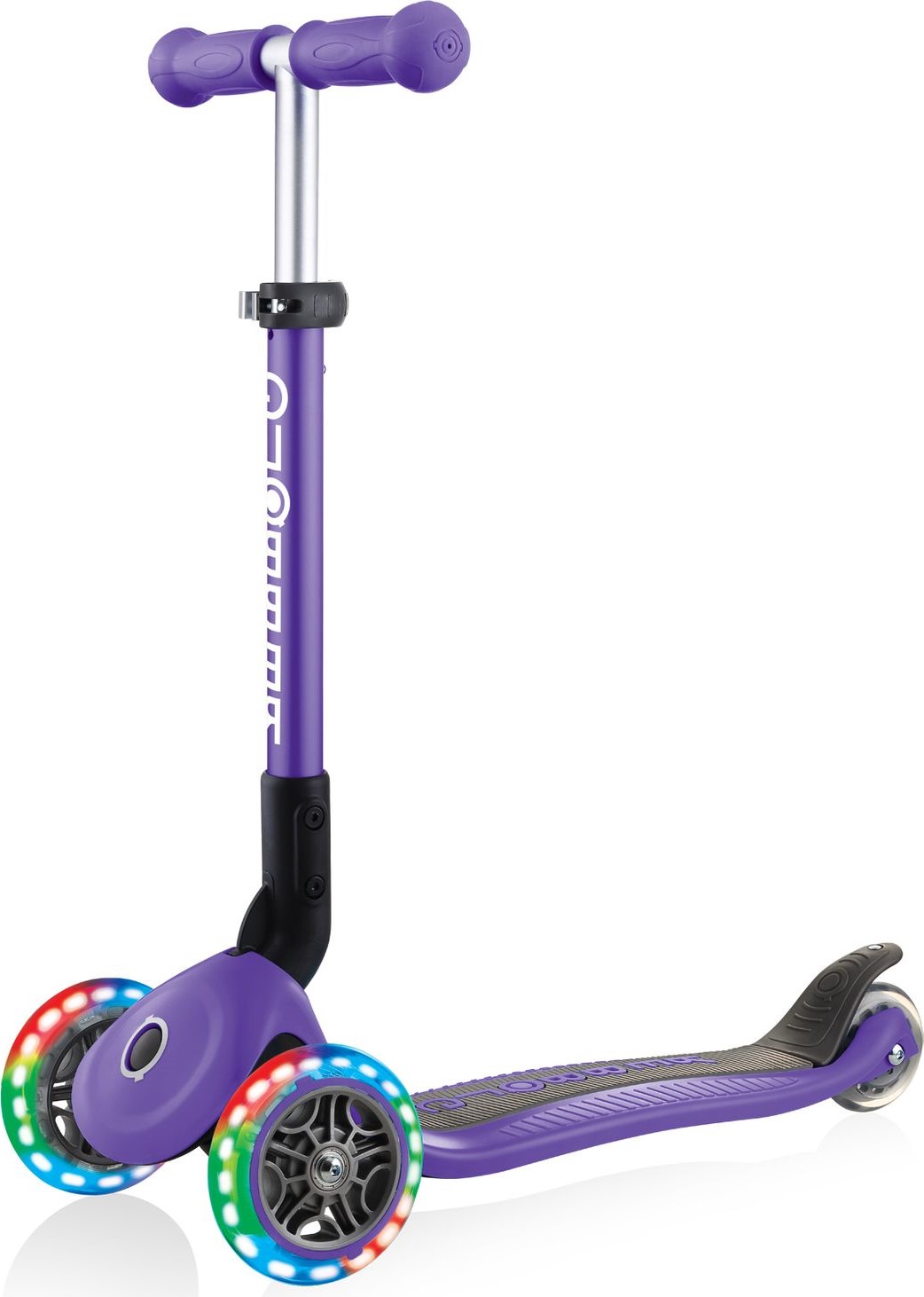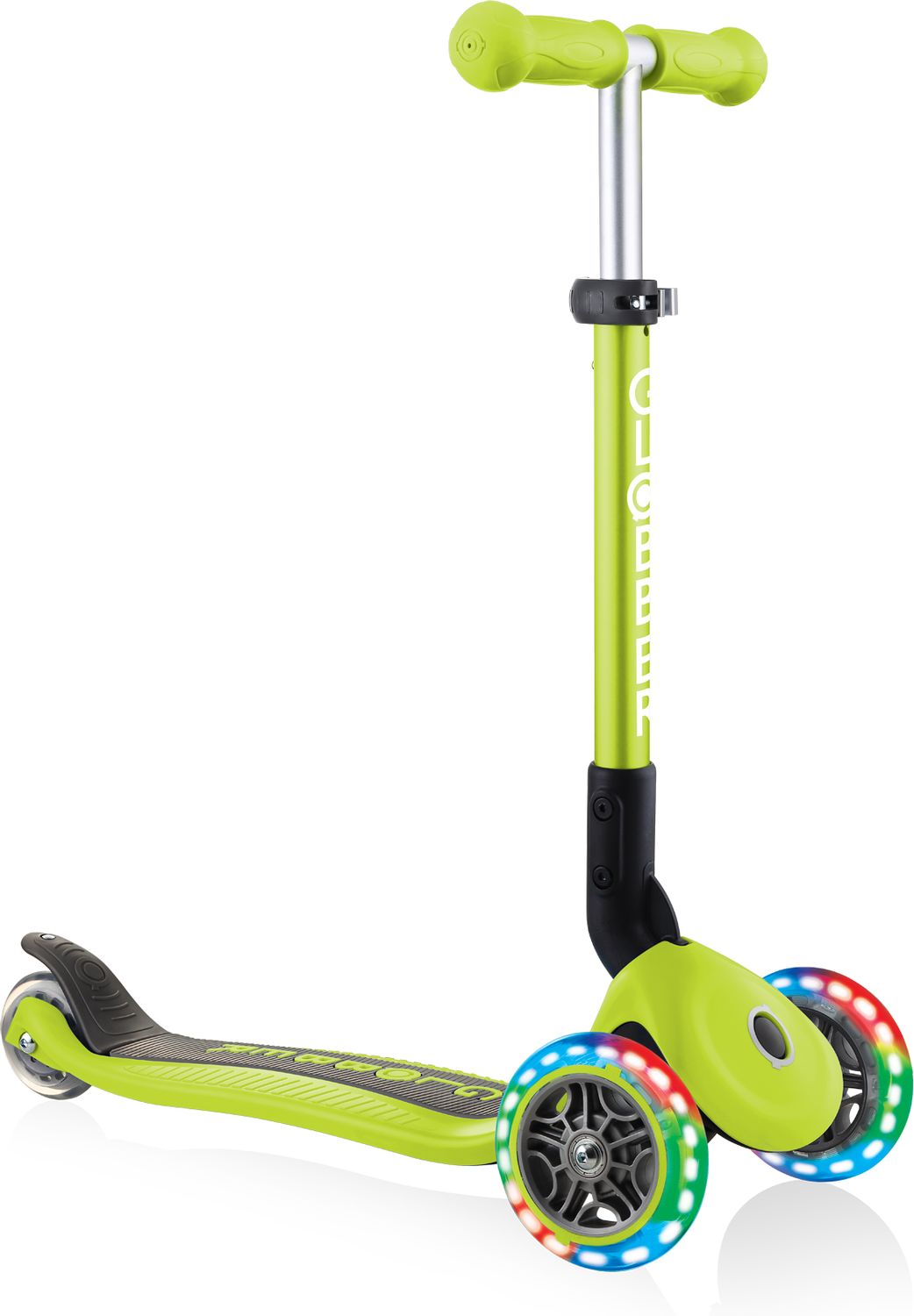 Самокат оснащен запатентованной системой складывания с помощью кнопки.