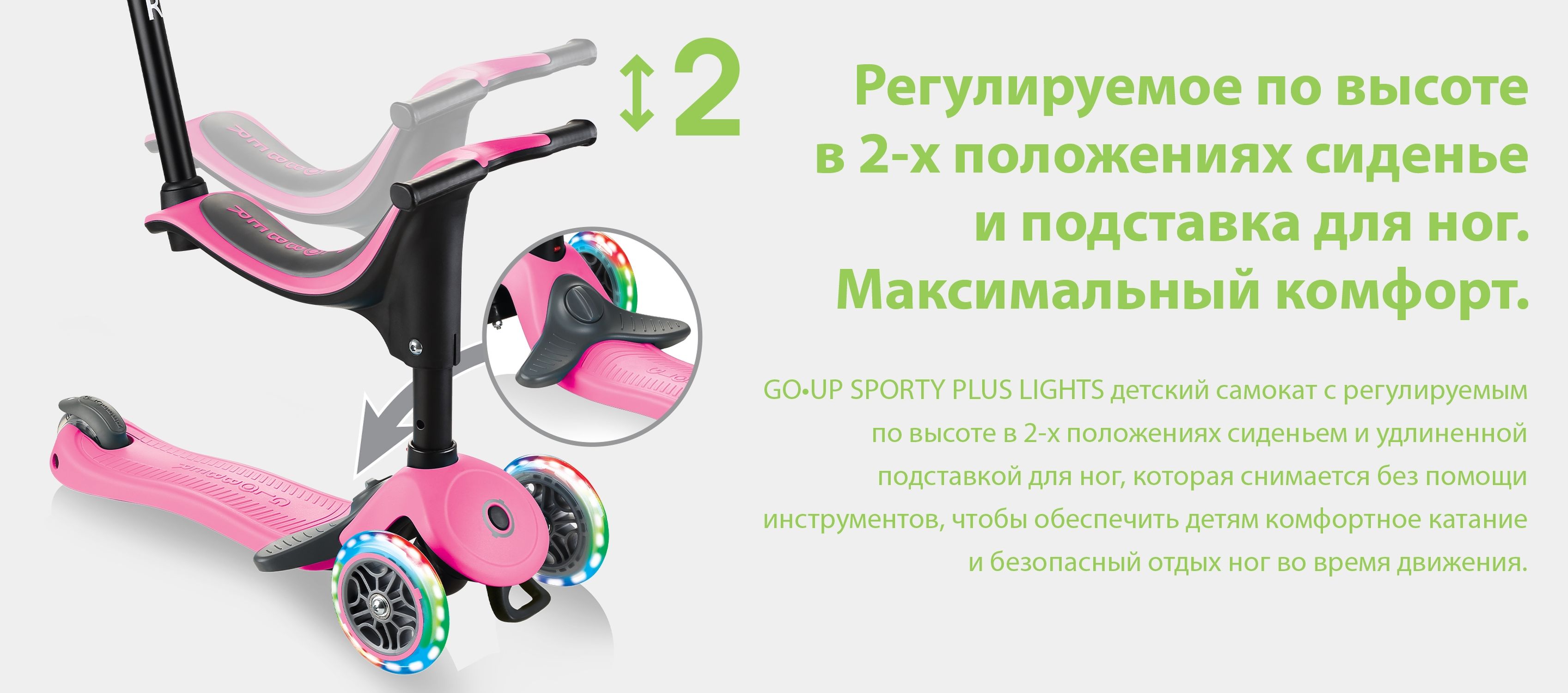 Детский самокат с регулируемым сиденьем для езды в режиме каталки или беговела. Мягкое, удобное сиденье TPR с 2 уровнями регулировки по высоте. GO•UP SPORTY PLUS LIGHTS-это так же детский самокат с 3 уровнями регулировки T-образного руля.