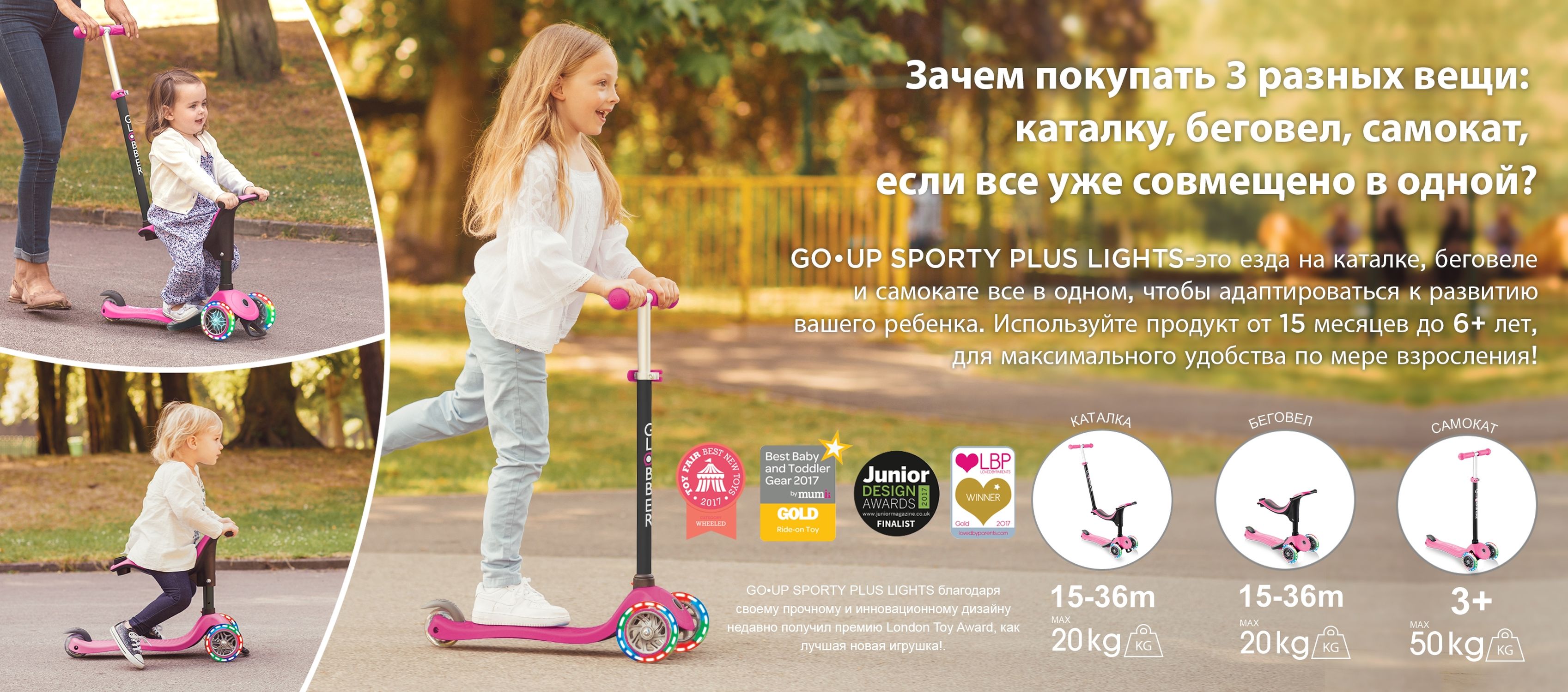 Все-в-одном детский самокат с сиденьем превращается в беговел и легкий самокат для малышей в возрасте от 15 м до 6+ (3+ для режима самоката). GO•UP SPORTY PLUS LIGHTS оснащен удлиненной съемной подставкой для ног для дополнительного комфорта в режиме каталки.