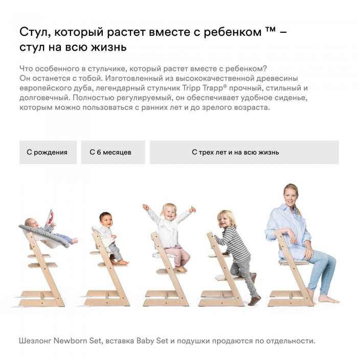 Приятные особенности:Задумывались ли Вы когда-нибудь, насколько важно для малыша в первые годы его жизни чувствовать себя полноправным членом семьи? В современной жизни с её сумасшедшим ритмом порой очень сложно сохранить прекрасные семейные традиции, такие как пышное семейное торжество или повседневный семейный обед.В такие важные моменты нельзя лишать маленького ребёнка возможности находиться рядом со всей семьёй и ощущать себя её неотъемлемой частью. Как же разместить малыша за столом так, чтобы ему было приятно и комфортно?Обычные стульчики для кормления, как правило, не соотносятся по высоте с высотой стандартного обеденного стола. Известный норвежский дизайнер Питер Опсвик, наблюдая за своим сыном, задумал решить эту проблему – так появился на свет уникальный в своём роде стульчик Stokke Tripp Trapp.