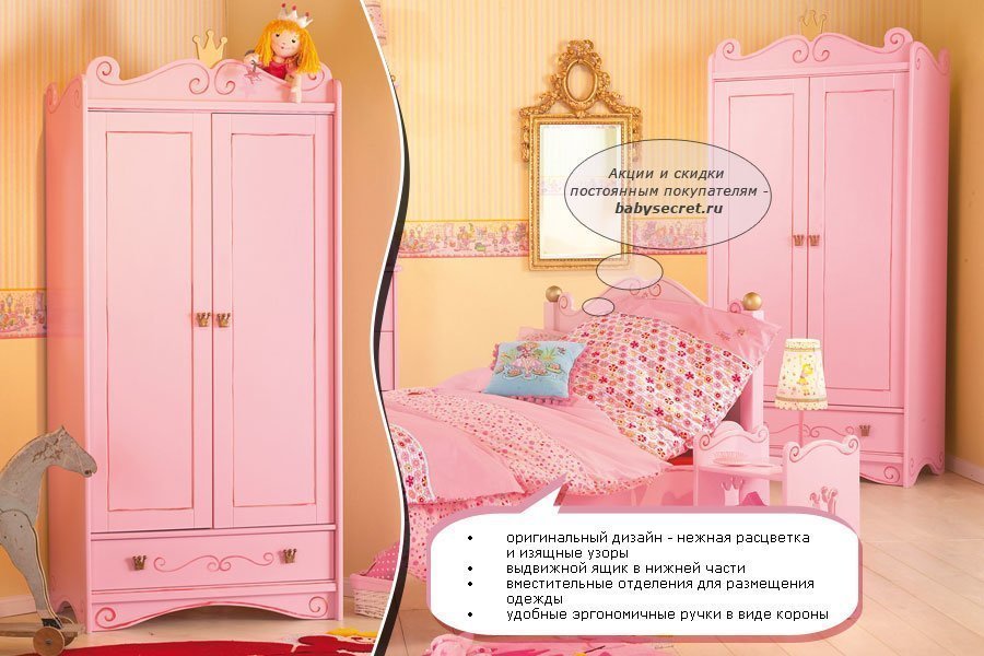 Приятные особенности двустворчатого шкафа Spiegelburg Prinzessin Lillifee:настоящие принцессы достойны только самого лучшего! Например, жить в сказочном королевском замке! Но как сделать его в своей простой квартире? Очень просто. Компания Spiegelburg предлагает товары для настоящих принцесс. Идеальная мебель для маленькой принцессы! Нежная расцветка и изящные узоры создадут в детской неповторимую атмосферу волшебства и сказки. Светлый и позитивный, скромно декорированный яркими, но неброскими элементами, шкаф будет способствовать сохранению хорошего и позитивного настроения у вашего ребенка. Шкаф Prinzessin Lillifee представляет собой двухдверный шкаф с выдвижным ящиком в нижней части, вместительными отделениями для размещения одежды. Игрушки и детская мебель Spiegelburg отвечают всем требованиям европейских стандартов безопасности, радуют и восхищают детей и их родителей не только в Европе, но и во всем мире.