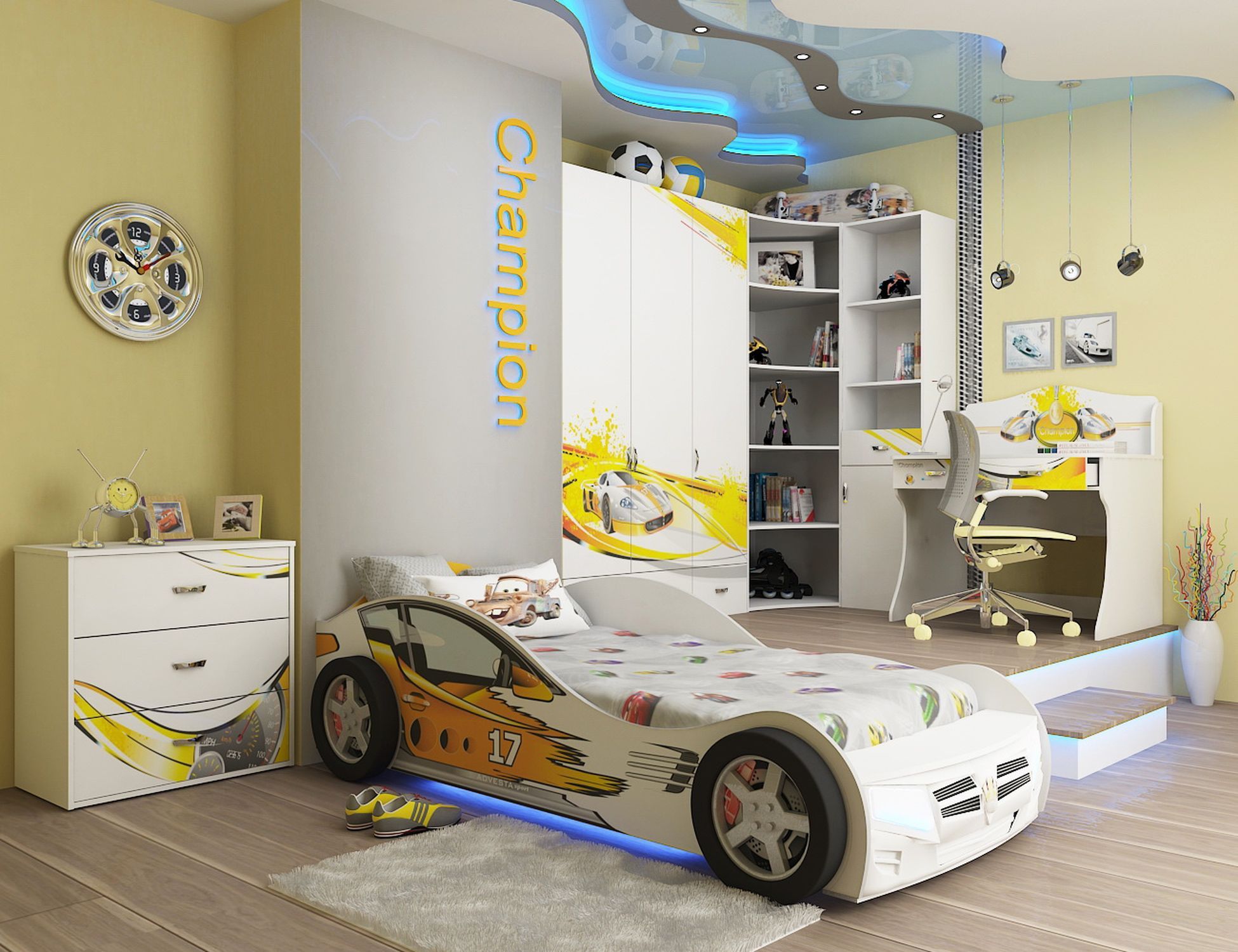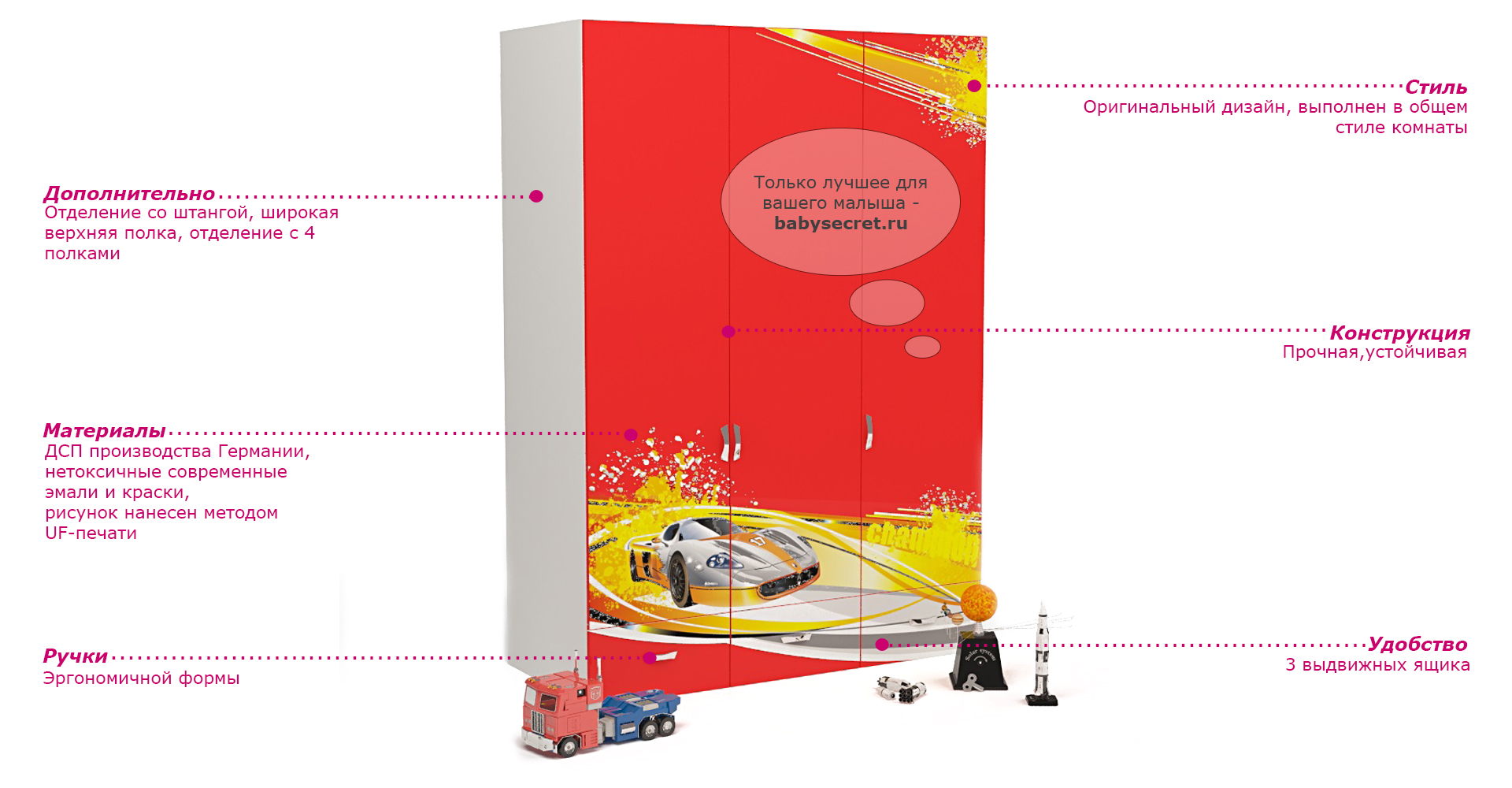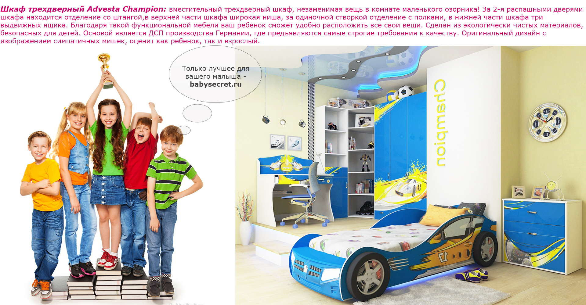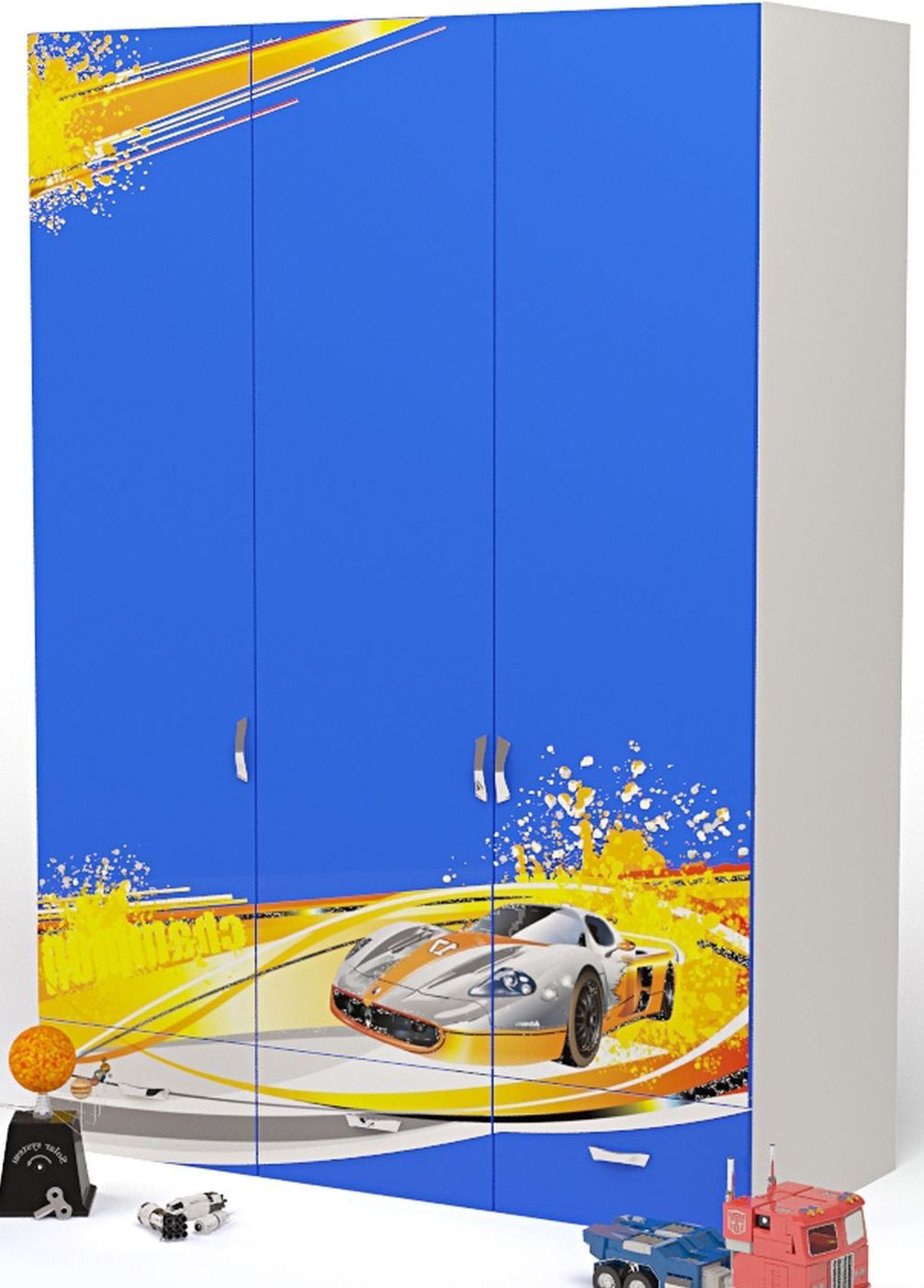 Приятные особенности трехдверного шкафа Advesta Champion: вместительный трехдверный шкаф, незаменимая вещь в комнате маленького озорника! За 2-я распашными дверями шкафа находится отделение со штангой,в верхней части шкафа широкая ниша, за одиночной створкой отделение с полками, в нижней части шкафа три выдвижных ящика. Благодаря такой функциональной мебели ваш ребенок сможет удобно расположить все свои вещи. Сделан из экологически чистых материалов, безопасных для детей. Основой является ДСП производства Германии, где предъявляются самые строгие требования к качеству. Оригинальный дизайн выполнен в общем стиле комнаты, оценит как ребенок, так и взрослый.