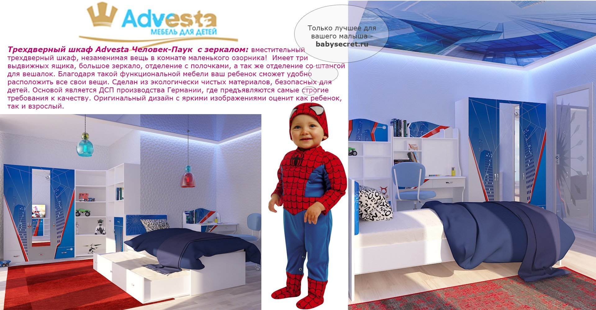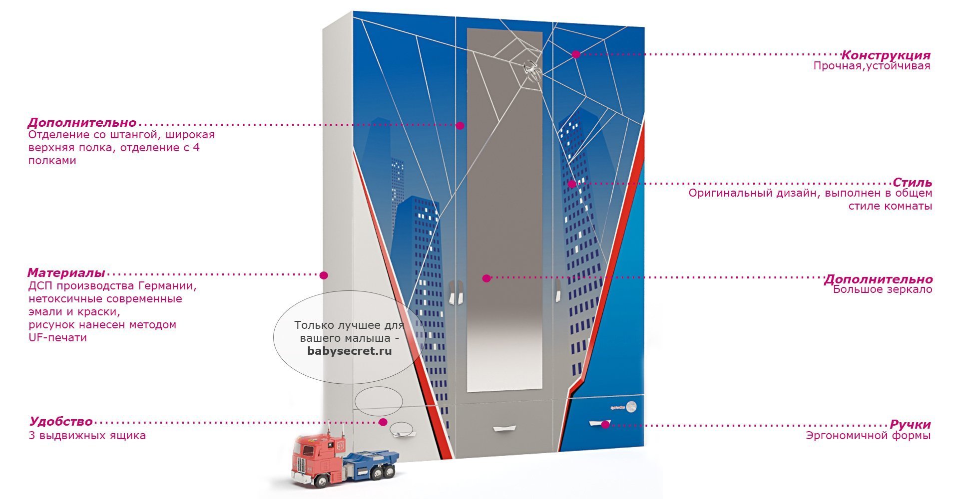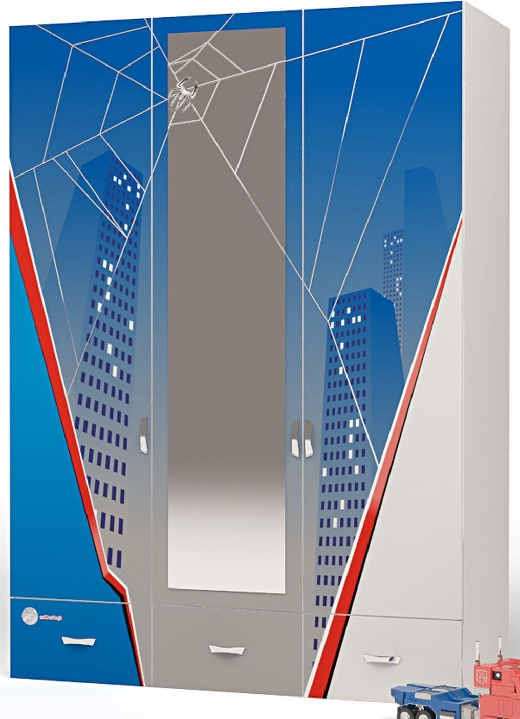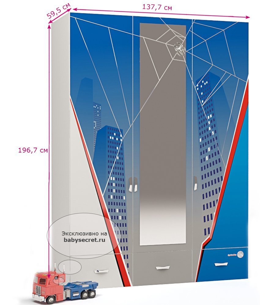 Приятные особенности трехдверного шкафа Человек-Паук с зеркалом: вместительный трехдверный шкаф, незаменимая вещь в комнате маленького озорника! Имеет три выдвижных ящика, большое зеркало, отделение с полочками, а так же отделение со штангой для вешалок. Благодаря такой функциональной мебели ваш ребенок сможет удобно расположить все свои вещи. Сделан из экологически чистых материалов, безопасных для детей. Основой является ДСП производства Германии, где предъявляются самые строгие требования к качеству. Оригинальный дизайн с яркими изображениями оценит как ребенок, так и взрослый.