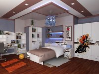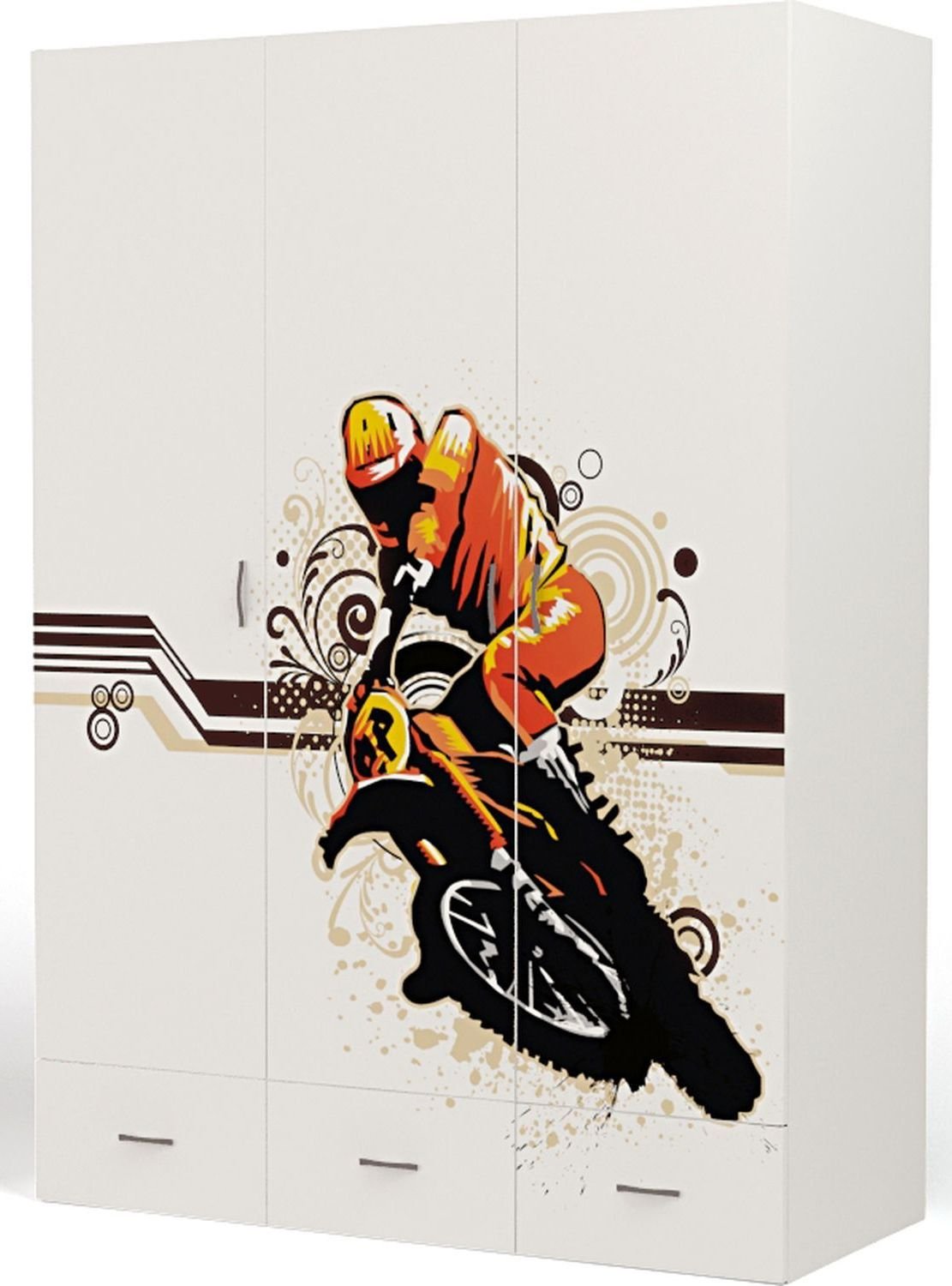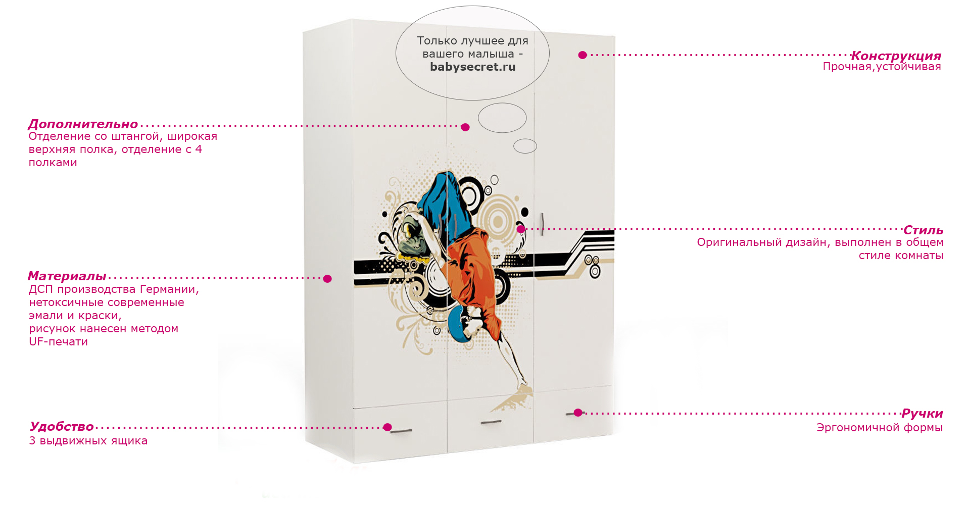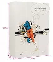 Приятные особенности трехдверного шкафа Extreme: вместительный трехдверный шкаф, незаменимая вещь в комнате маленького озорника! За 2-я распашными дверями шкафа находится отделение со штангой,в верхней части шкафа широкая ниша, за одиночной створкой отделение с полками, в нижней части шкафа три выдвижных ящика. Благодаря такой функциональной мебели ваш ребенок сможет удобно расположить все свои вещи. Сделан из экологически чистых материалов, безопасных для детей. Основой является ДСП производства Германии, где предъявляются самые строгие требования к качеству. Оригинальный дизайн выполнен в общем стиле комнаты, оценит как ребенок, так и взрослый.