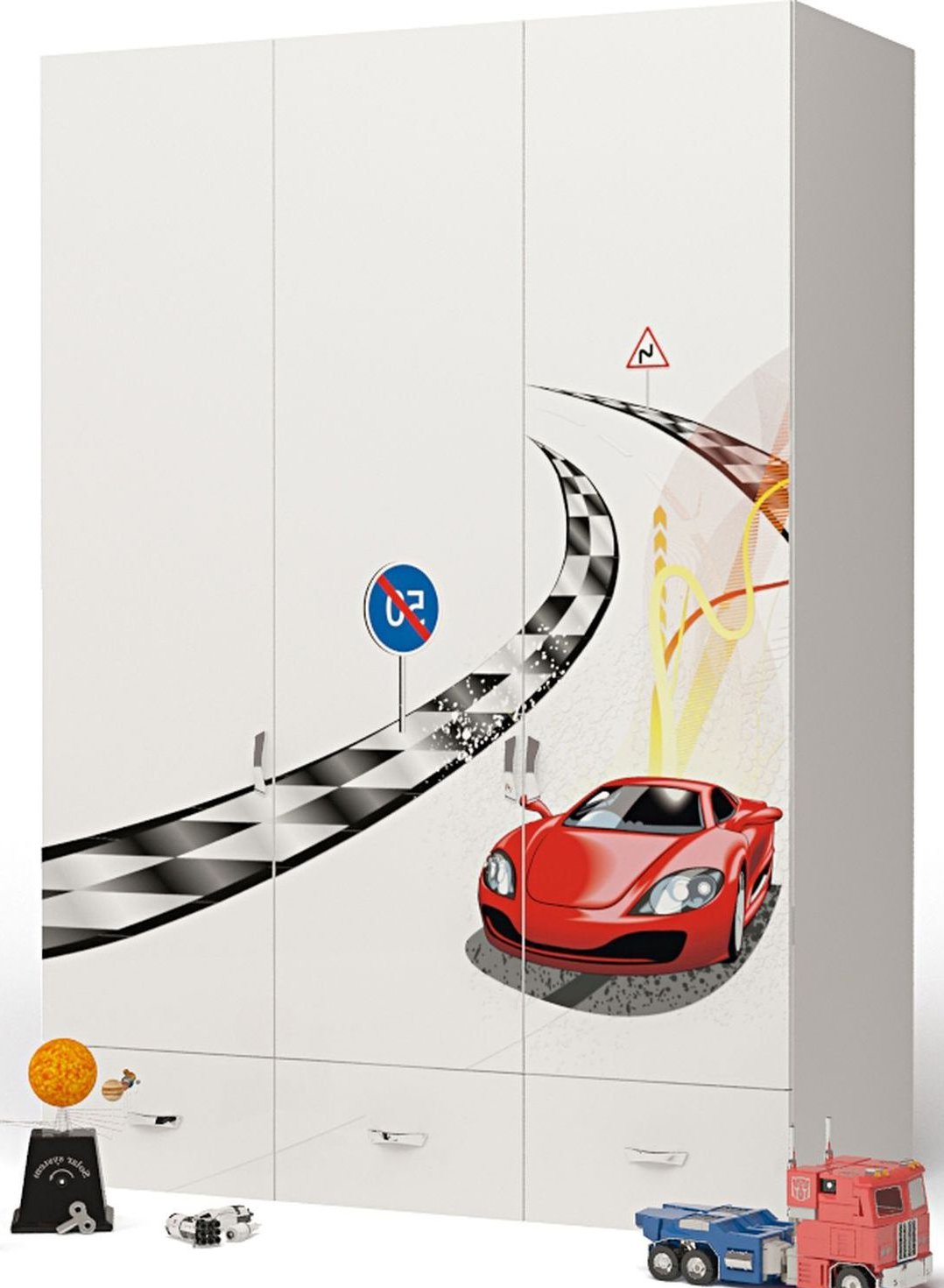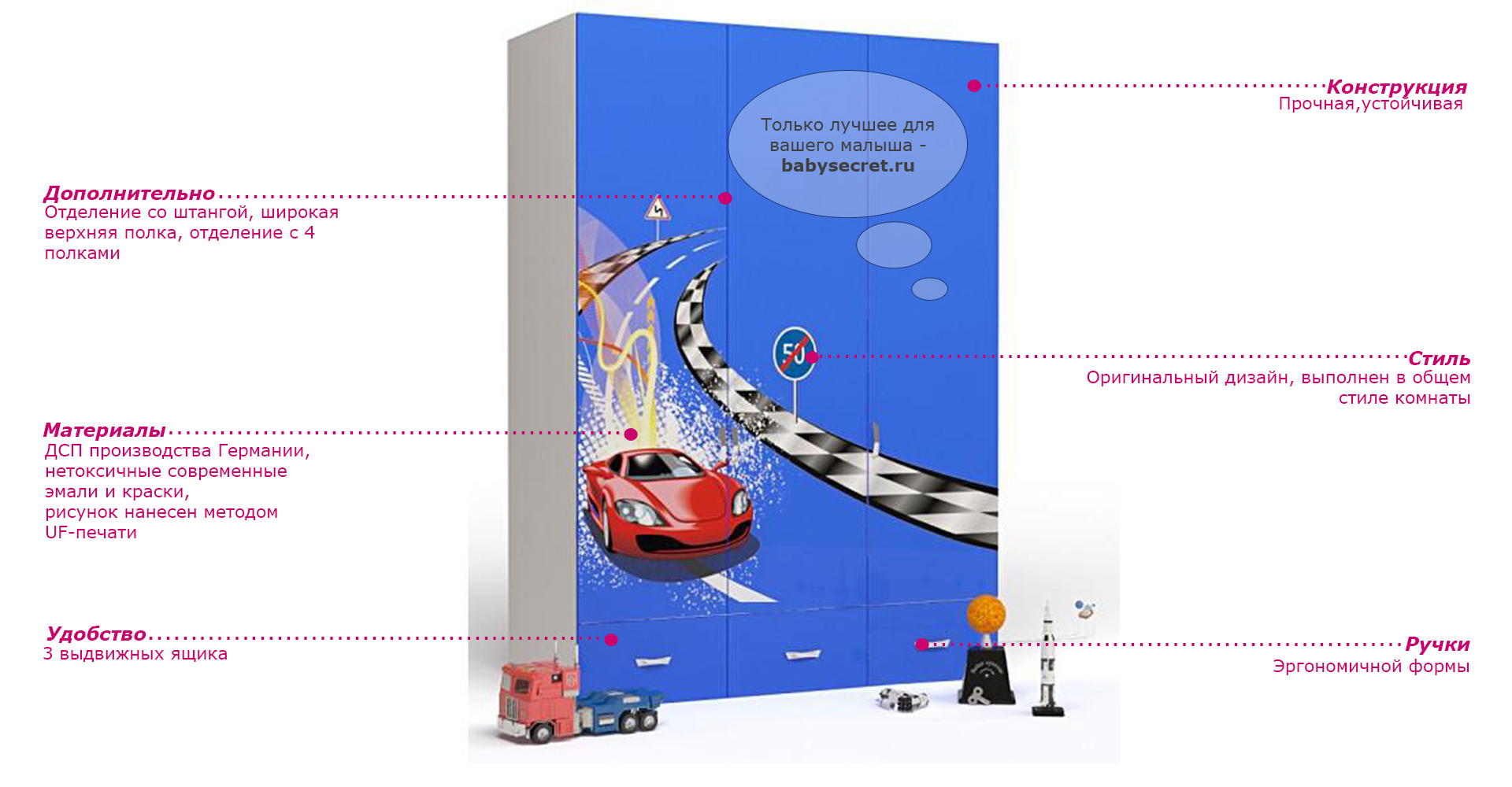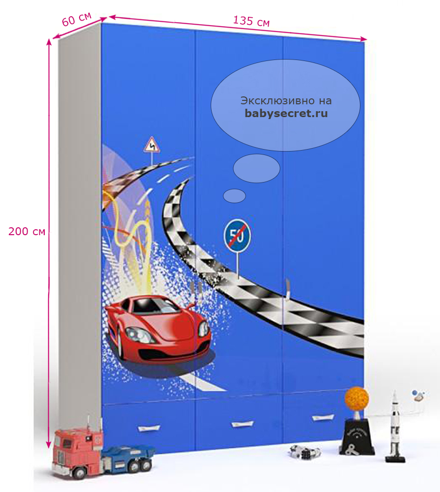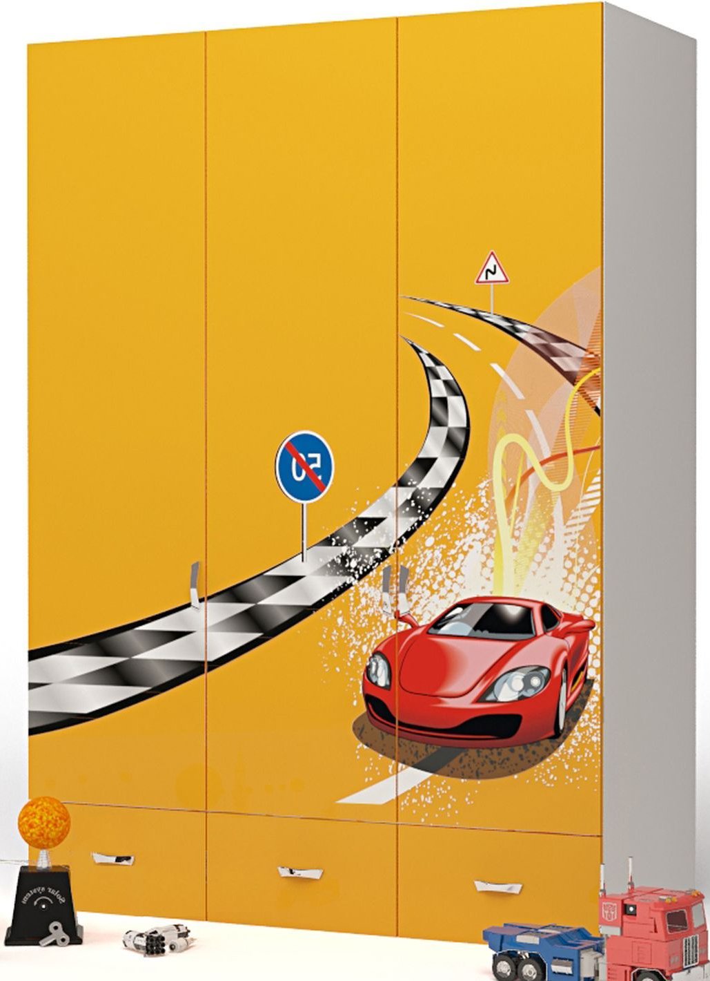 Приятные особенности трехдверного шкафа Formula: вместительный трехдверный шкаф, незаменимая вещь в комнате маленького озорника! За 2-я распашными дверями шкафа находится отделение со штангой,в верхней части шкафа широкая ниша, за одиночной створкой отделение с полками, в нижней части шкафа три выдвижных ящика. Благодаря такой функциональной мебели ваш ребенок сможет удобно расположить все свои вещи. Сделан из экологически чистых материалов, безопасных для детей. Основой является ДСП производства Германии, где предъявляются самые строгие требования к качеству. Оригинальный дизайн,выполнен в общем стиле комнаты , оценит как ребенок, так и взрослый.