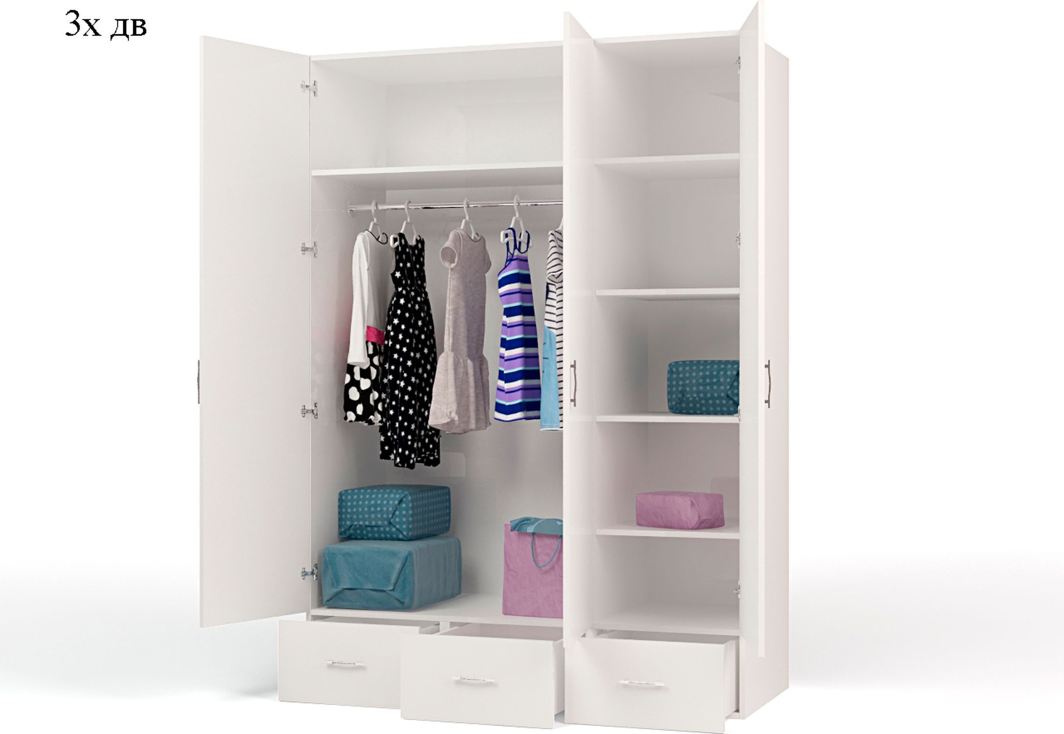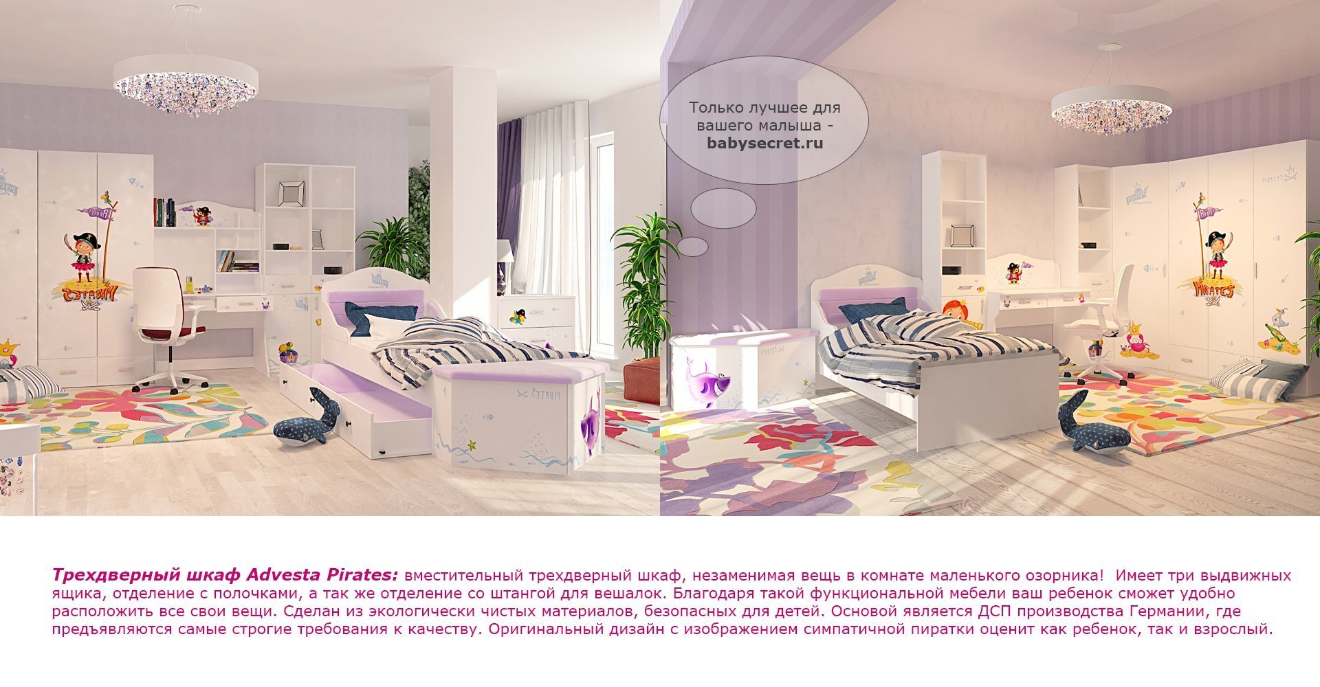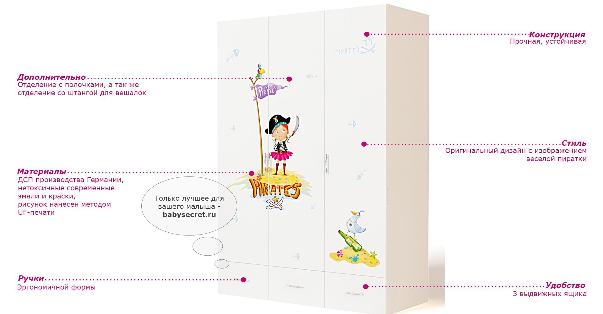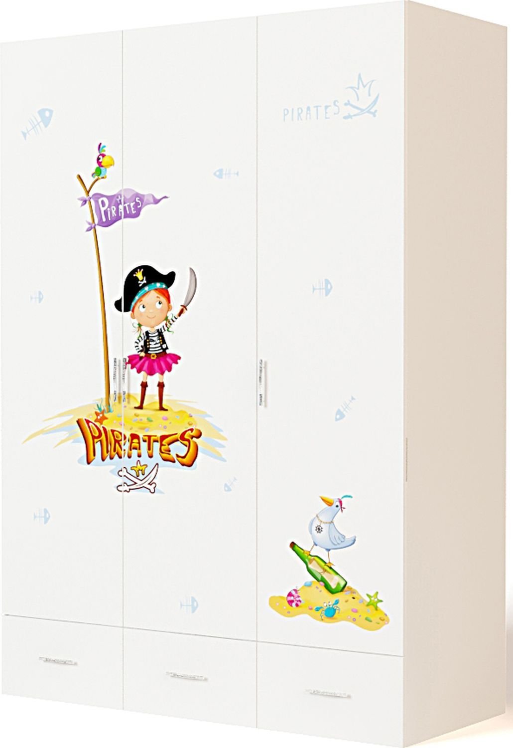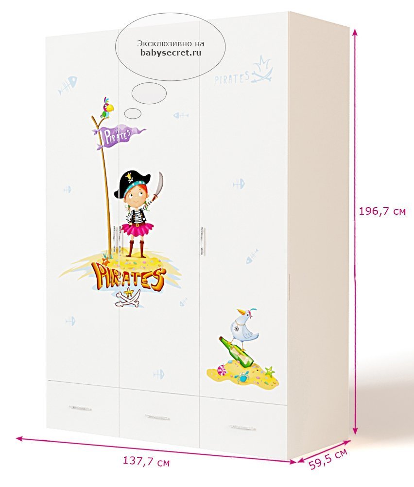 Приятные особенности трехдверного шкафа Pirates:вместительный трехдверный шкаф, незаменимая вещь в комнате маленького озорника! Имеет три выдвижных ящика, отделение с полочками, а так же отделение со штангой для вешалок. Благодаря такой функциональной мебели ваш ребенок сможет удобно расположить все свои вещи. Сделан из экологически чистых материалов, безопасных для детей. Основой является ДСП производства Германии, где предъявляются самые строгие требования к качеству. Оригинальный дизайн с изображением симпатичной пиратки оценит как ребенок, так и взрослый.