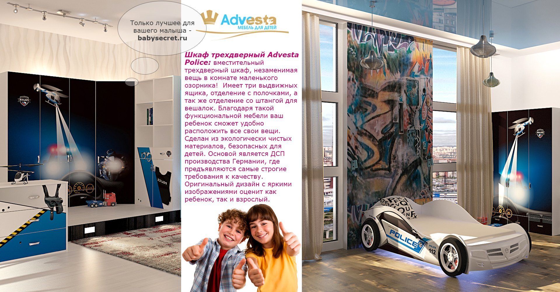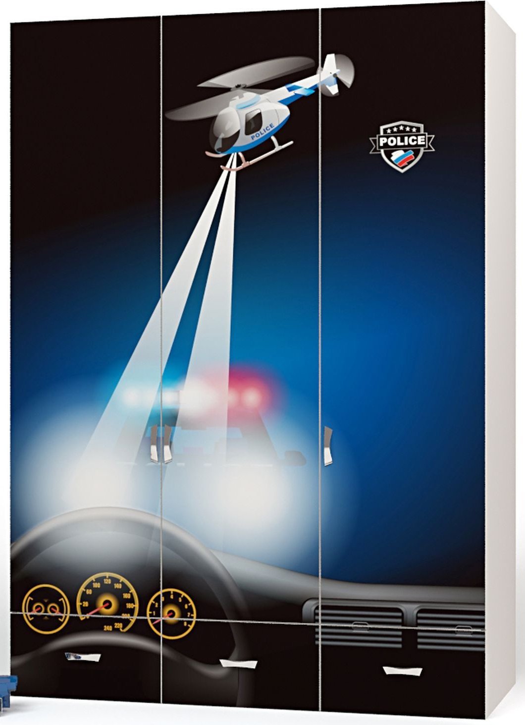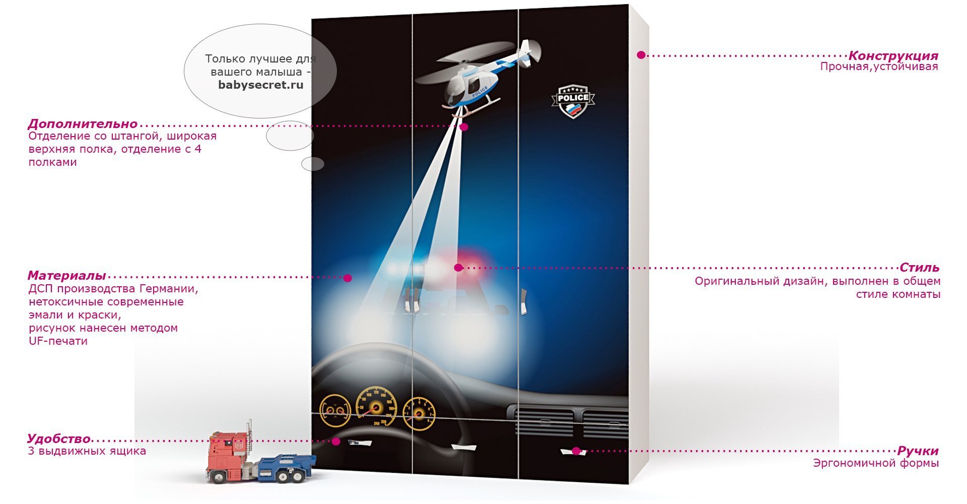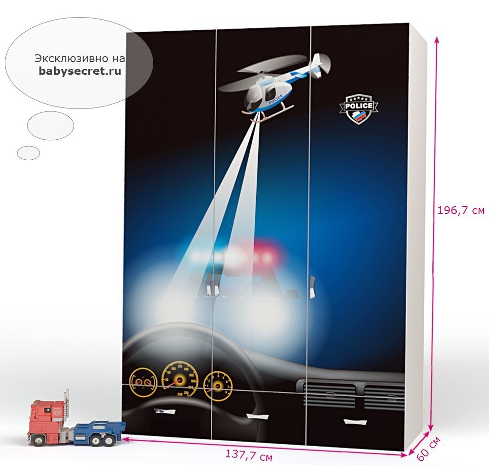 Приятные особенности трехдверного шкафа Police: вместительный трехдверный шкаф, незаменимая вещь в комнате маленького озорника! Имеет три выдвижных ящика, отделение с полочками, а так же отделение со штангой для вешалок. Благодаря такой функциональной мебели ваш ребенок сможет удобно расположить все свои вещи. Сделан из экологически чистых материалов, безопасных для детей. Основой является ДСП производства Германии, где предъявляются самые строгие требования к качеству. Оригинальный дизайн с яркими изображениями оценит как ребенок, так и взрослый.