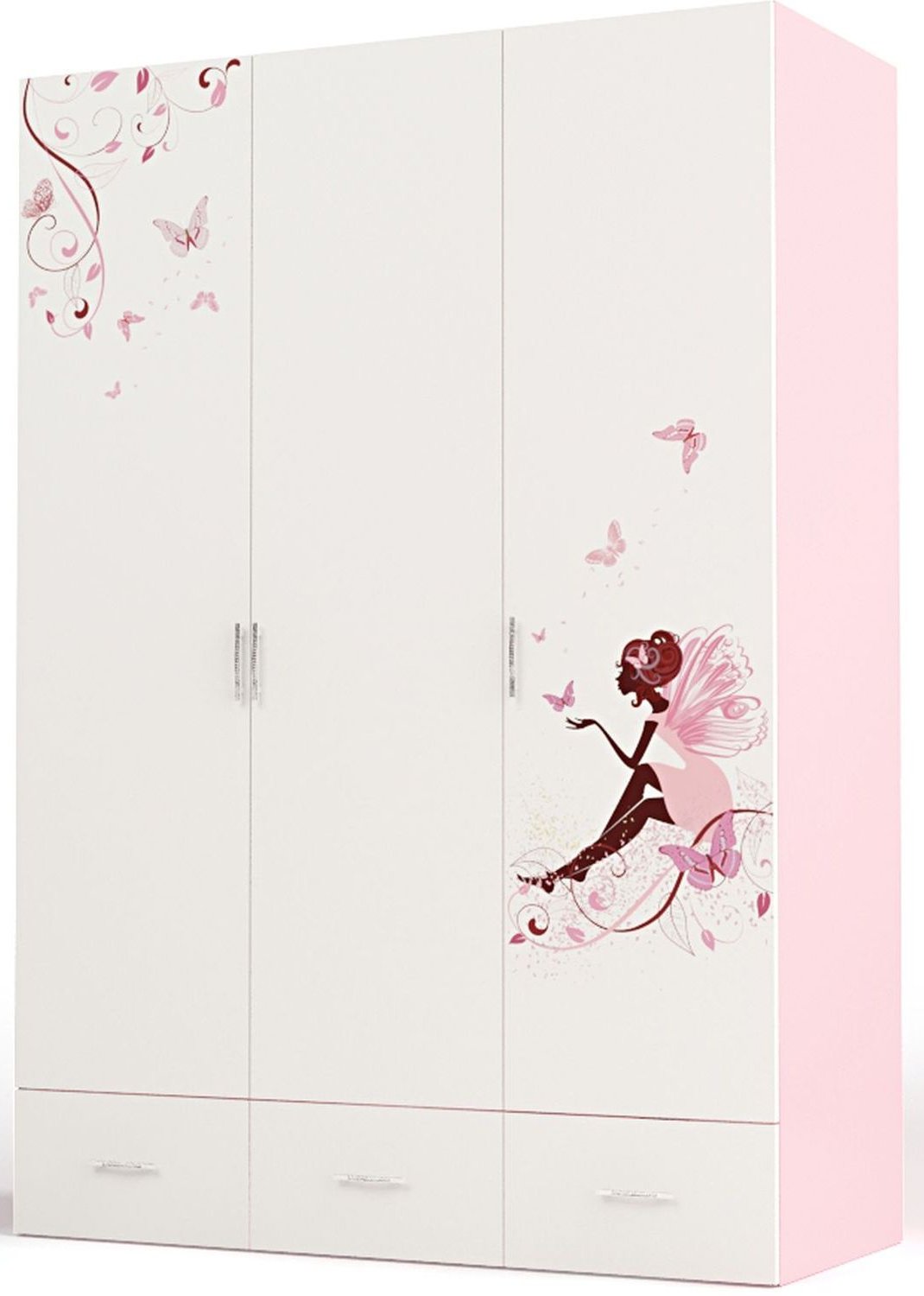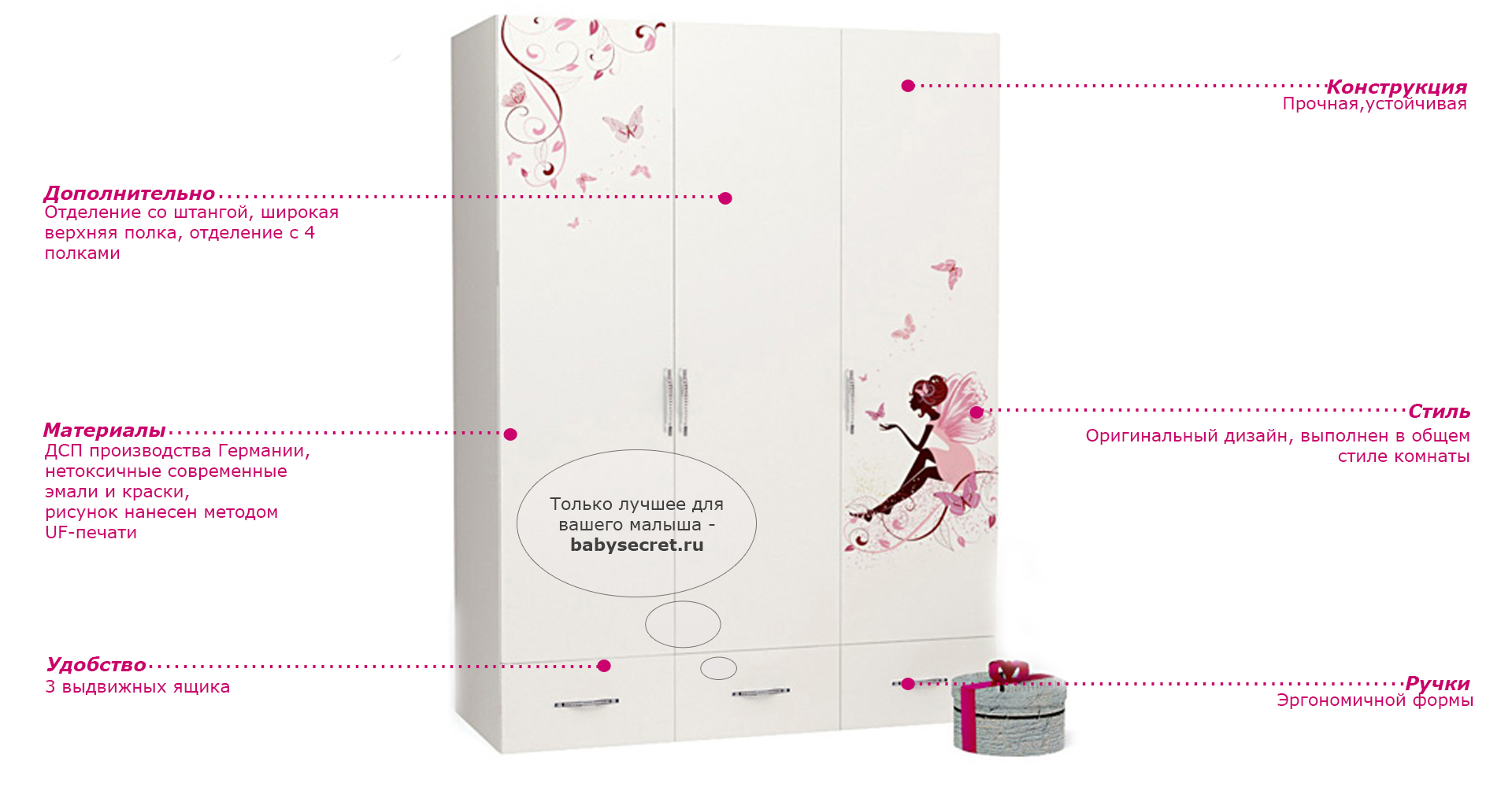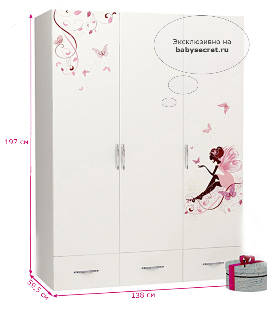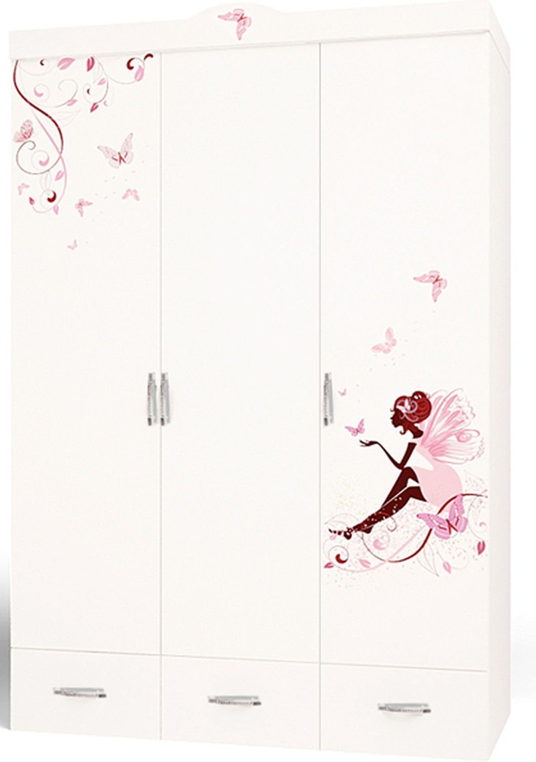 Приятные особенности трехдверного шкафа Swarovski Fairy: вместительный трехдверный шкаф, незаменимая вещь в комнате маленького озорника! За 2-я распашными дверями шкафа находится отделение со штангой,в верхней части шкафа широкая ниша, за одиночной створкой отделение с полками, в нижней части шкафа три выдвижных ящика. Благодаря такой функциональной мебели ваш ребенок сможет удобно расположить все свои вещи. Сделан из экологически чистых материалов, безопасных для детей. Основой является ДСП производства Германии, где предъявляются самые строгие требования к качеству. Оригинальный дизайн, выполнен в общем стиле комнаты, оценит как ребенок, так и взрослый.