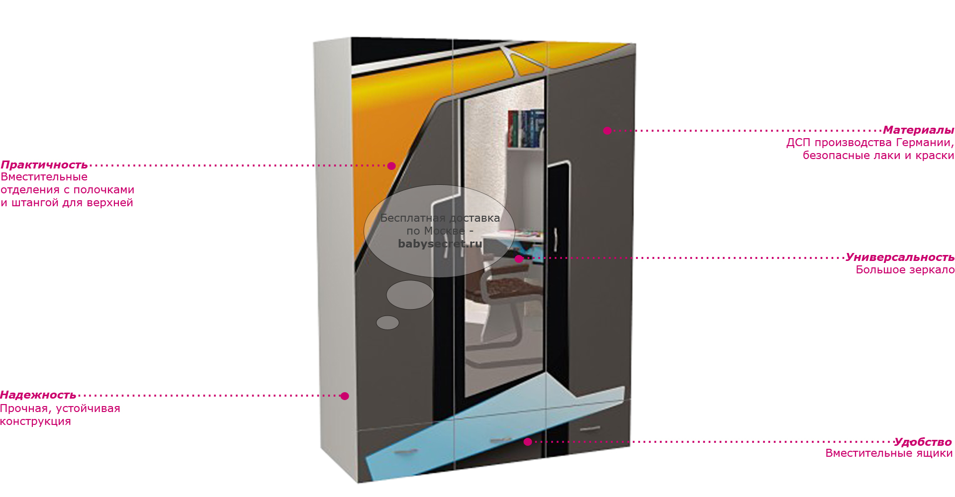 Приятные особенности шкафа Pilot: сделан из экологически чистых материалов, безопасных для детей. Основой является ДСП производства Германии, где предъявляются самые строгие требования к качеству. У мебели есть преимущество, которое понравится, как детям, так и взрослым. Детскую мебель можно красиво оформить специальными картинками, которые изготовлены из прочных и долговечных материалов, позволяющих проводить влажную уборку. Картинки, украшающие фасады мебели нарисованы акриловыми красками, которые безвредны для человека, экологически чисты, долго держатся и не выцветают.