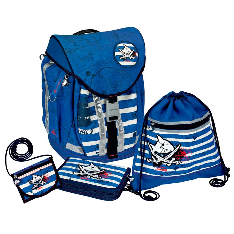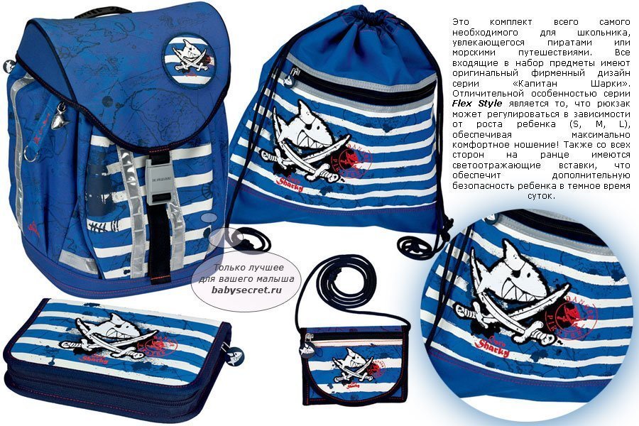 Приятные особенности школьного рюкзака Spiegelburg Capt'n Sharky Flex Style с наполнением 10600:это комплект всего самого необходимого для школьника, увлекающегося пиратами или морскими путешествиями. Все входящие в набор предметы имеют оригинальный фирменный дизайн серии «Капитан Шарки». Отличительной особенностью серии Flex Style является то, что рюкзак может регулироваться в зависимости от роста ребенка (S, M, L), обеспечивая максимально комфортное ношение!Также со всех сторон на ранце имеются светоотражающие вставки, что обеспечит дополнительную безопасность ребенка в темное время суток. Рюкзак произведен в Германии, что говорит о высочайшем уровне качества продукта. Он сделан из водоотталкивающей износостойкой ткани, благодаря чему очень прочен и долго сохраняет отличный внешний вид!