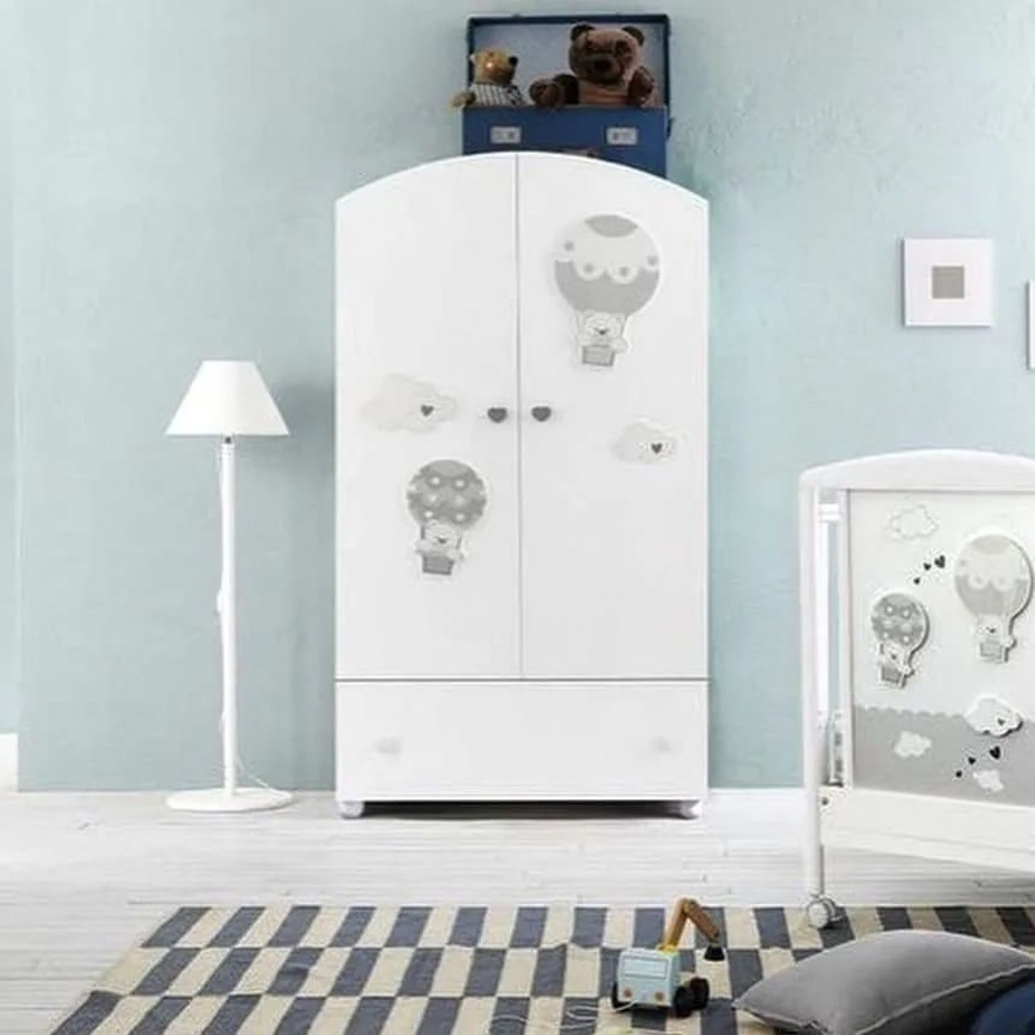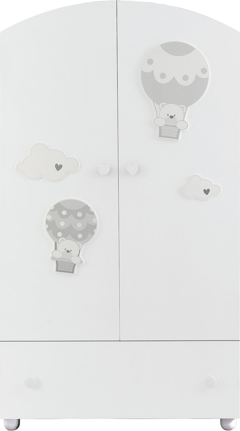 Приятные особенности: вместительный двустворчатый шкаф с нижним ящиком для одежды и белья является частью детской коллекции Bonnie. Выдвижной ящик на металлических направляющих открывается плавно и бесшумно. Центральную часть занимает штанга для вешалок и две полки. Белые распашные дверцы с изогнутым дугой верхом декорированы летящими на воздушных шарах мишками. Эргономичные ручки выполнены в форме сердечек. Шкаф устойчиво стоит на 4-х низких широких ножках. Благодаря высококачественным материалам и фурнитуре изделие прослужит долгие годы.
