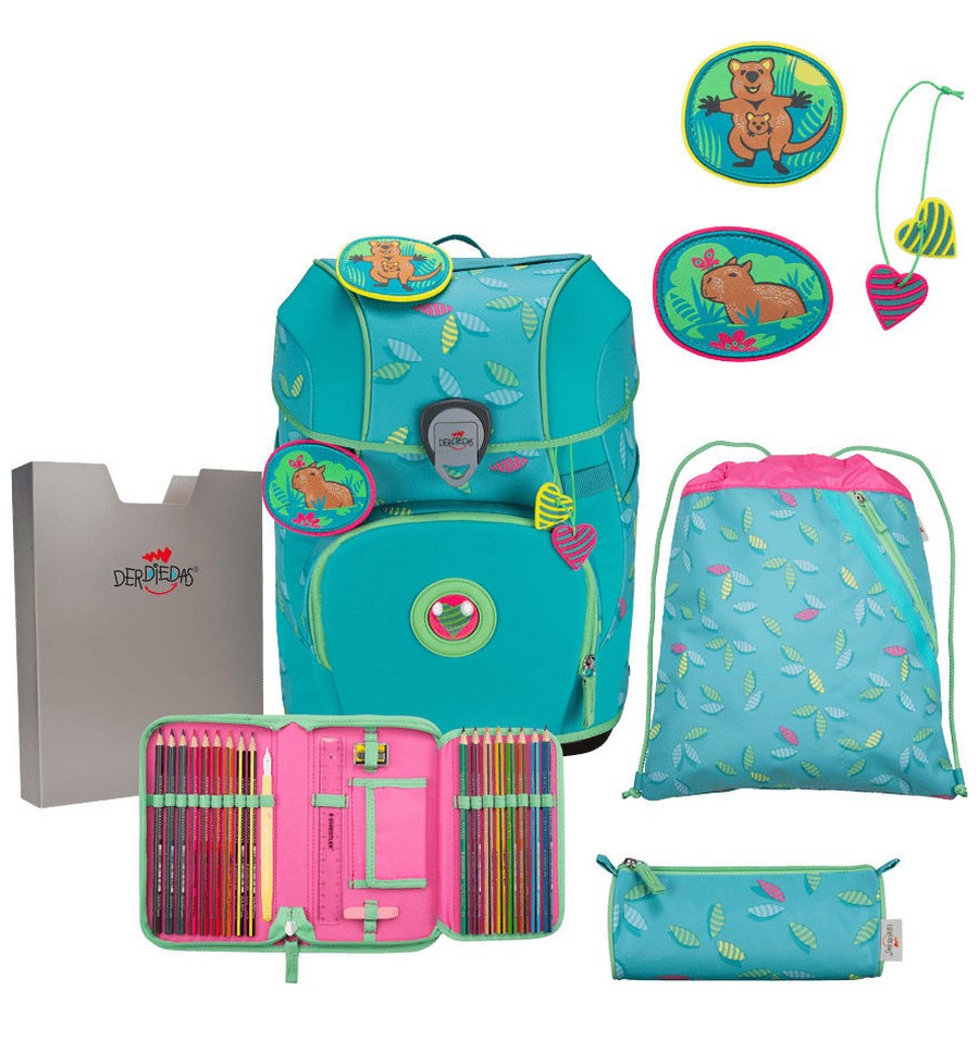 • Комплектация: ранец, мешок-сумка для обуви, пенал с высококачественным немецким наполнением 20 предметов , мягкий пенал без наполнения, бокс для тетрадей, комплект украшений