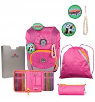 • Комплектация: ранец, мешок-сумка для обуви, пенал с высококачественным немецким наполнением 20 предметов , мягкий пенал без наполнения, бокс для тетрадей, комплект украшений