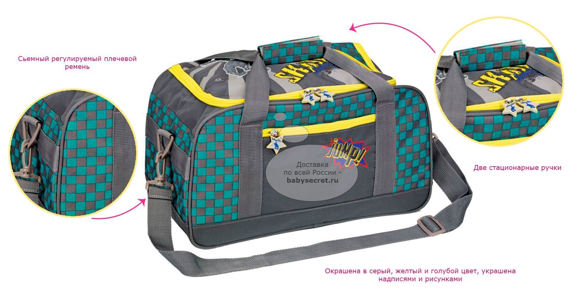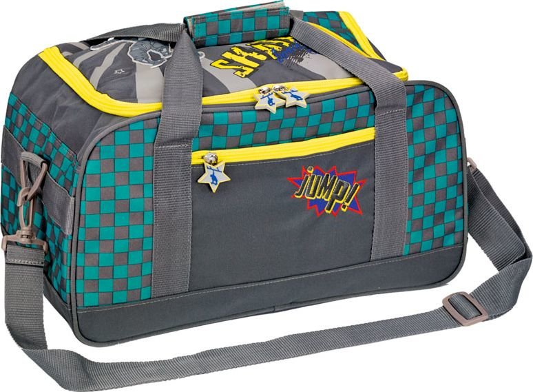 Приятные особенностиспортивной сумки Spiegelburg Skateboarding 11857:если ваш ребенок любит экстремальные виды спорта, к примеру, скейтбординг, то ему сразу понравится эта сумка.Спортивная сумка окрашена в серый, желтый и голубой цвет. Она украшена надписями и рисунками. На ее передней части есть карман, в котором можно хранить небольшие вещи. Основной отдел имеет два отсека - один для обуви, другой для одежды. В сумку также можно сложить бутылку с водой и другие вещи. Сверху есть две удобные ручки, которые можно соединить липучкой.Длину наплечного ремня можно поменять в зависимости от роста мальчика. При желании ремень можно отсоединить.