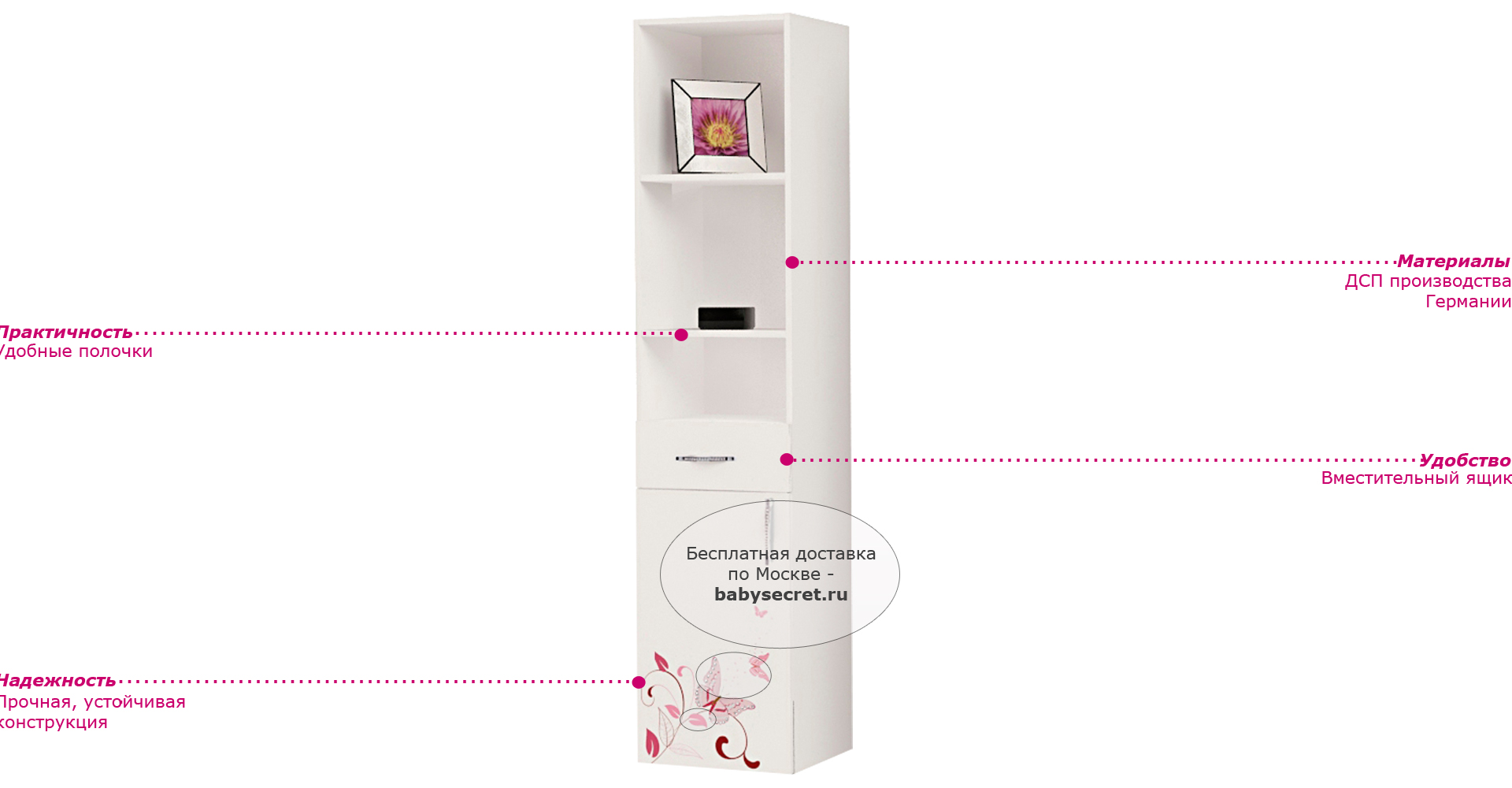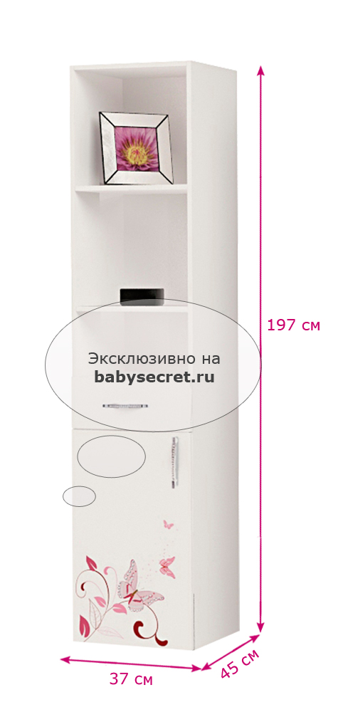 Приятные особенности стеллажаABC King Фея без страз: сделан из экологически чистых материалов, безопасных для детей. Основой является ДСП производства Германии, где предъявляются самые строгие требования к качеству. Стеллаж сделан в двух вариантах на выбор: правый или левый (правостороннее открытие двери или левостороннее).