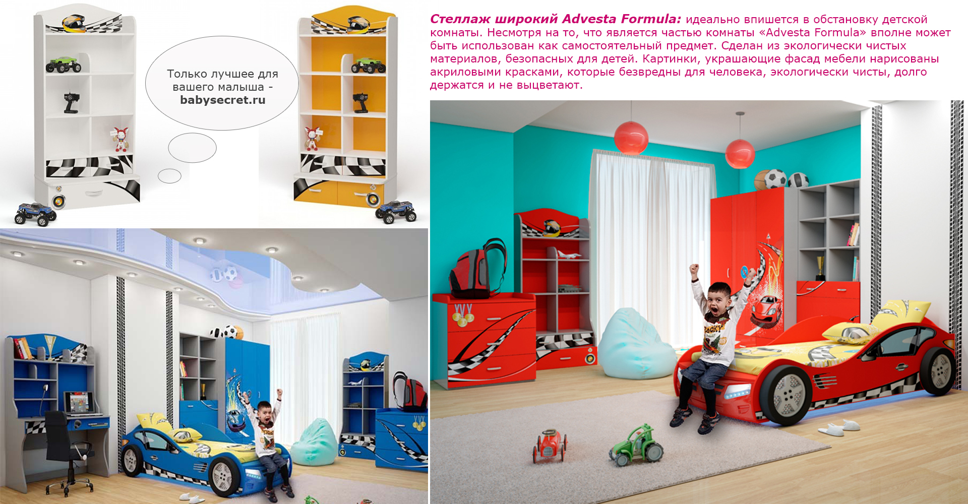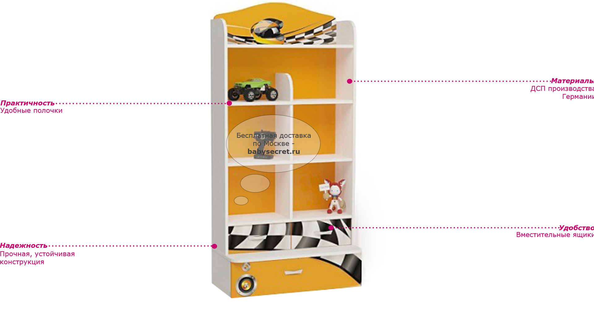 Приятные стеллажа Formula: сделан из экологически чистых материалов, безопасных для детей. Основой является ДСП производства Германии, где предъявляются самые строгие требования к качеству.У мебели есть преимущество, которое понравится, как детям, так и взрослым. Детскую мебель можно красиво оформить специальными картинками, которые изготовлены из прочных и долговечных материалов, позволяющих проводить влажную уборку. Картинки, украшающие фасады мебели нарисованы акриловыми красками, которые безвредны для человека, экологически чисты, долго держатся и не выцветают.