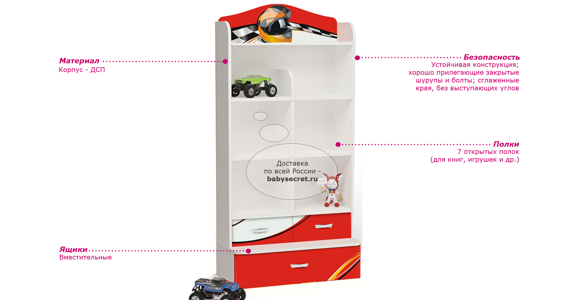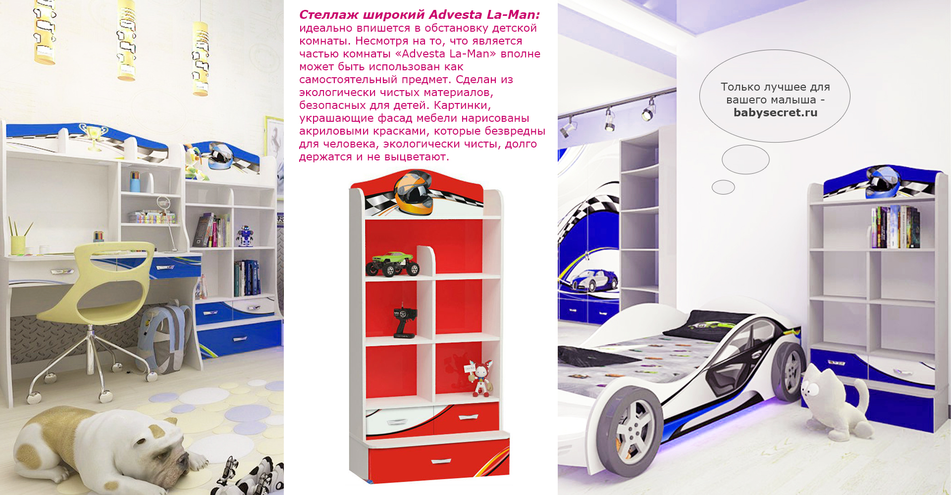 Приятные стеллажа La-Man: сделан из экологически чистых материалов, безопасных для детей. Основой является ДСП производства Германии, где предъявляются самые строгие требования к качеству. У мебели есть преимущество, которое понравится, как детям, так и взрослым. Детскую мебель можно красиво оформить специальными картинками, которые изготовлены из прочных и долговечных материалов, позволяющих проводить влажную уборку. Картинки, украшающие фасады мебели нарисованы акриловыми красками, которые безвредны для человека, экологически чисты, долго держатся и не выцветают.