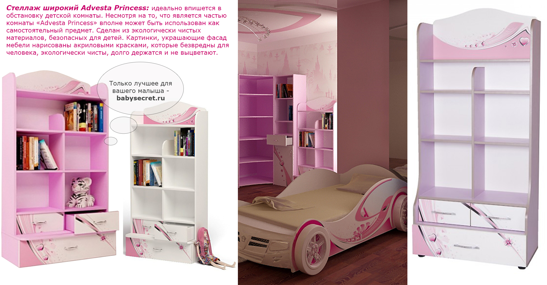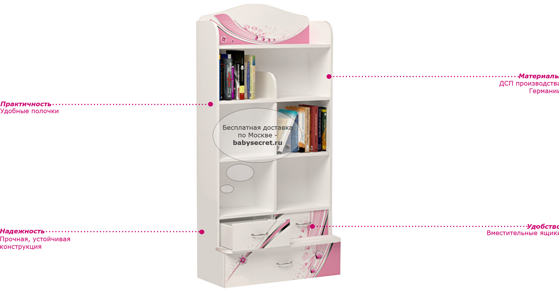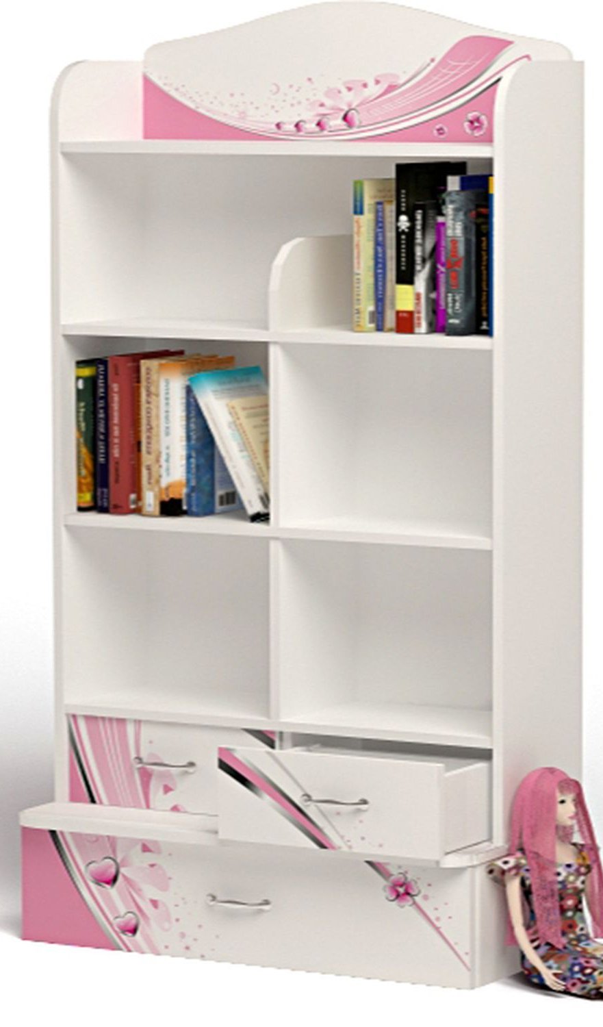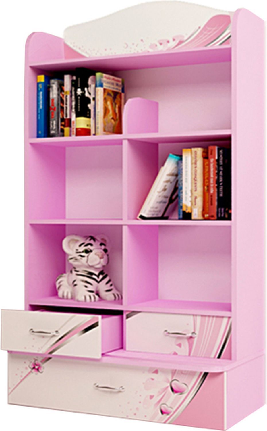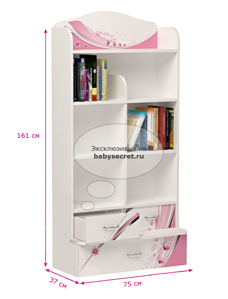 Приятные стеллажа : сделан из экологически чистых материалов, безопасных для детей. Основой является ДСП производства Германии, где предъявляются самые строгие требования к качеству. У мебели есть преимущество, которое понравится, как детям, так и взрослым. Детскую мебель можно красиво оформить специальными картинками, которые изготовлены из прочных и долговечных материалов, позволяющих проводить влажную уборку. Картинки, украшающие фасады мебели нарисованы акриловыми красками, которые безвредны для человека, экологически чисты, долго держатся и не выцветают.