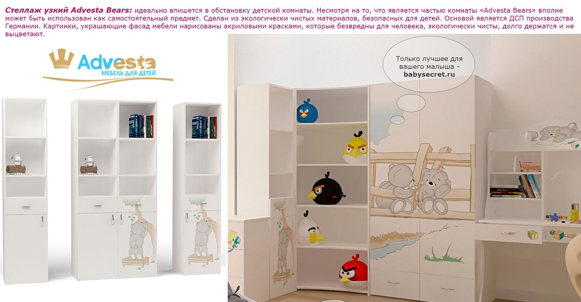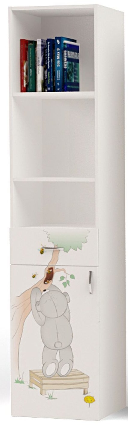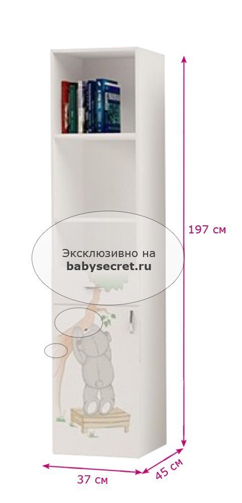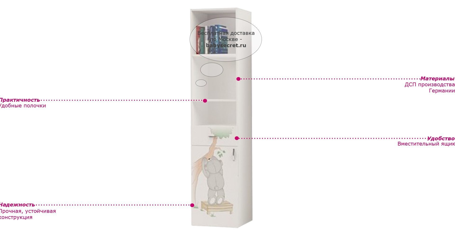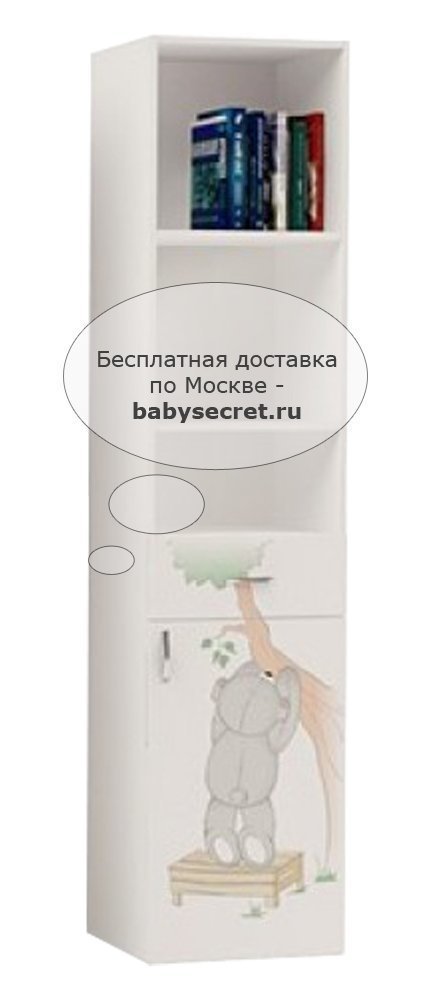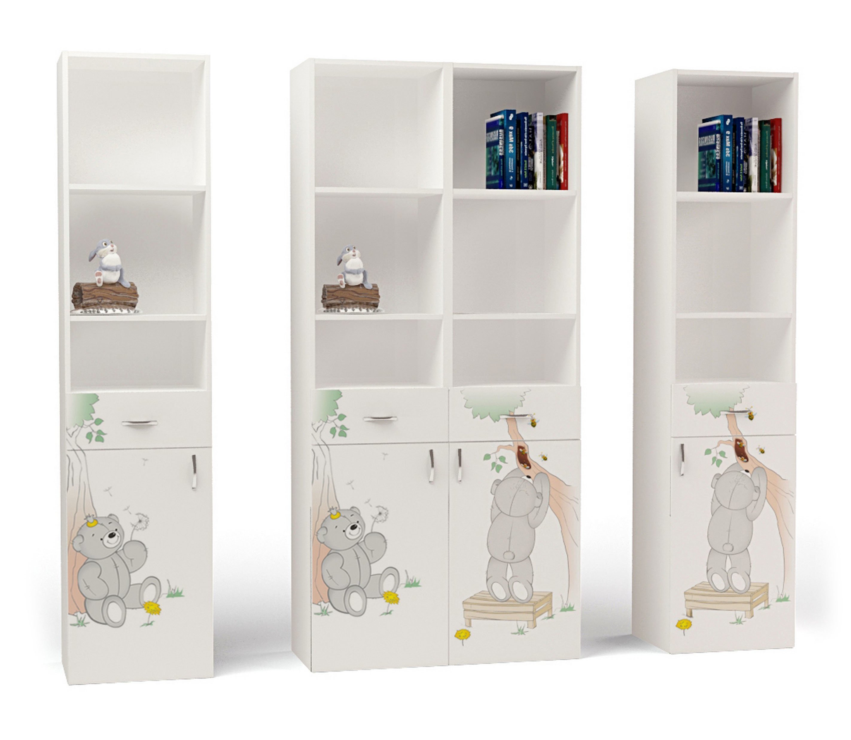 Приятные особенности стеллажаABC KingBears: сделан из экологически чистых материалов, безопасных для детей. Основой является ДСП производства Германии, где предъявляются самые строгие требования к качеству. Стеллаж сделан в двух вариантах на выбор: правый или левый (правостороннее открытие двери или левостороннее).У мебели есть преимущество, которое понравится, как детям, так и взрослым. Детскую мебель можно красиво оформить специальными картинками, которые изготовлены из прочных и долговечных материалов, позволяющих проводить влажную уборку. Картинки, украшающие фасады мебели нарисованы акриловыми красками, которые безвредны для человека, экологически чисты, долго держатся и не выцветают.
