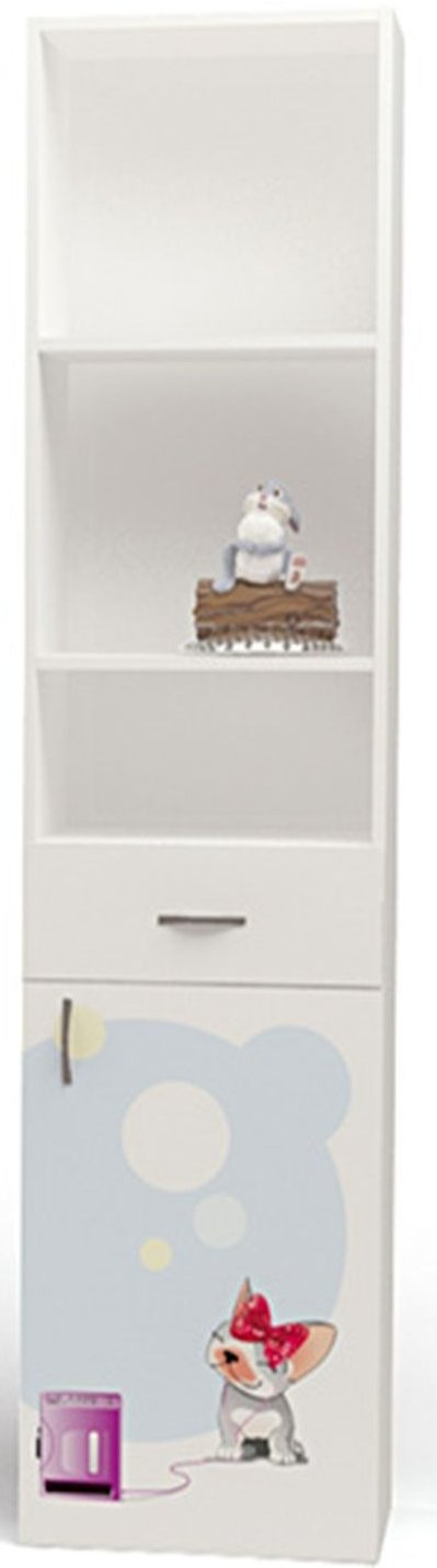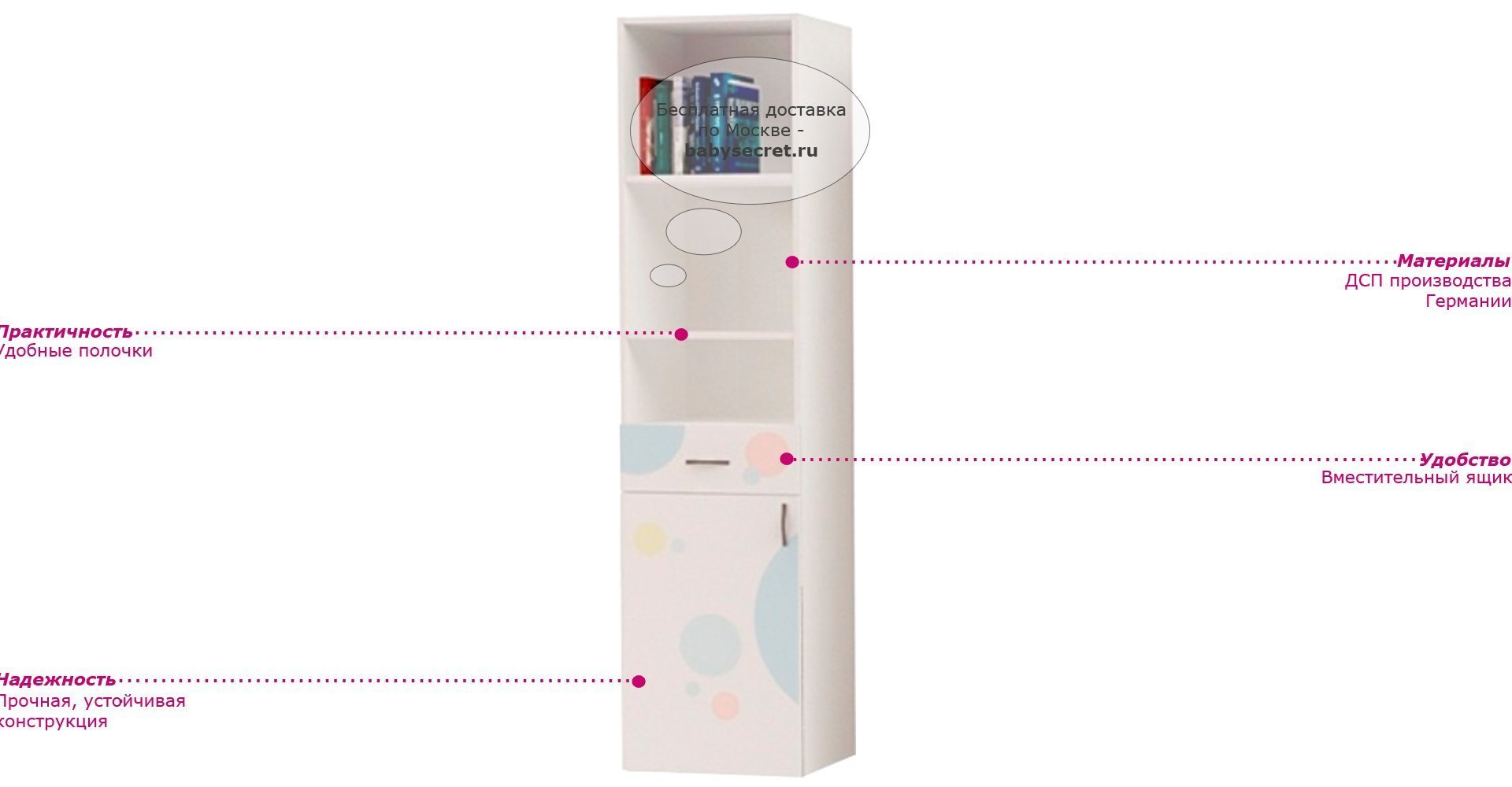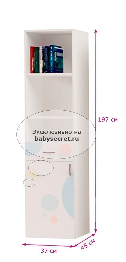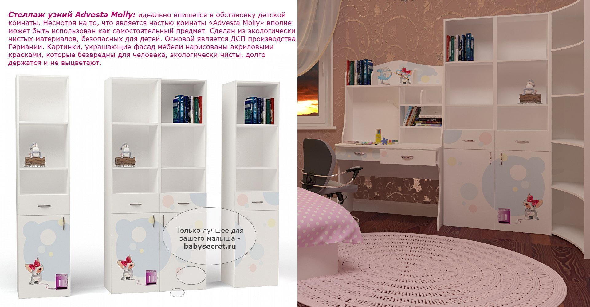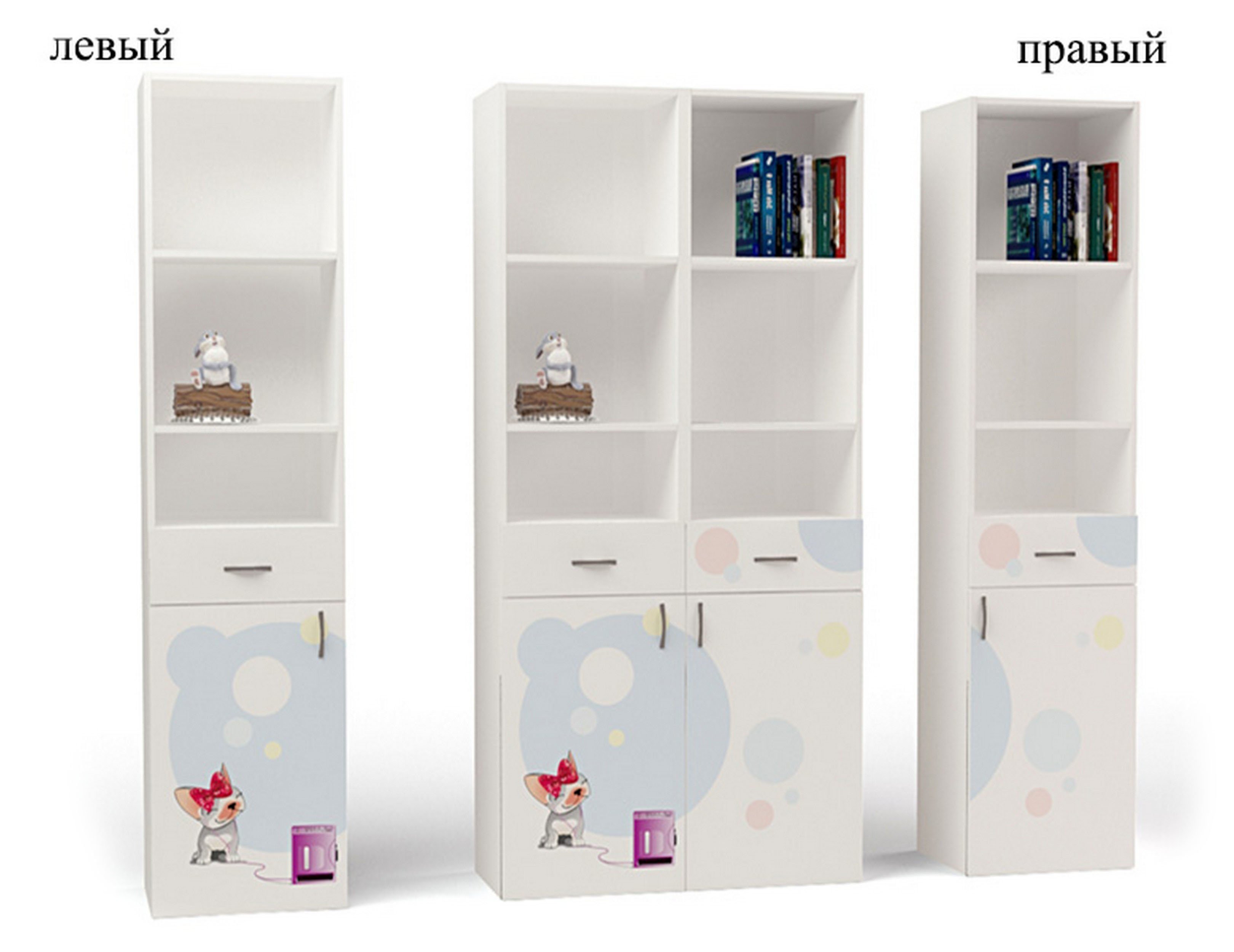 Приятные особенности стеллажаABC KingMolly: сделан из экологически чистых материалов, безопасных для детей. Основой является ДСП производства Германии, где предъявляются самые строгие требования к качеству. Стеллаж сделан в двух вариантах на выбор: правый или левый (правостороннее открытие двери или левостороннее).У мебели есть преимущество, которое понравится, как детям, так и взрослым. Детскую мебель можно красиво оформить специальными картинками, которые изготовлены из прочных и долговечных материалов, позволяющих проводить влажную уборку. Картинки, украшающие фасады мебели нарисованы акриловыми красками, которые безвредны для человека, экологически чисты, долго держатся и не выцветают.