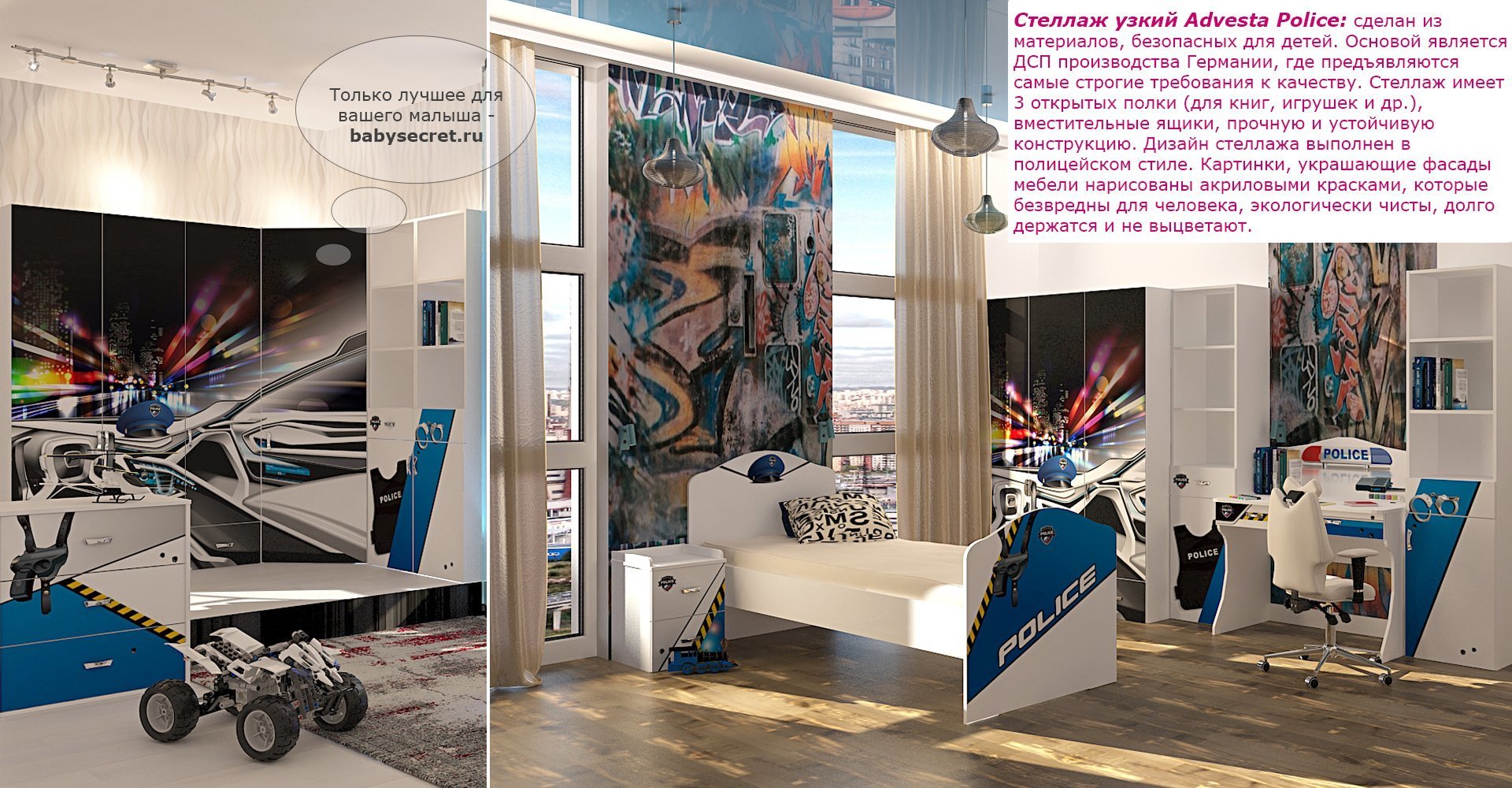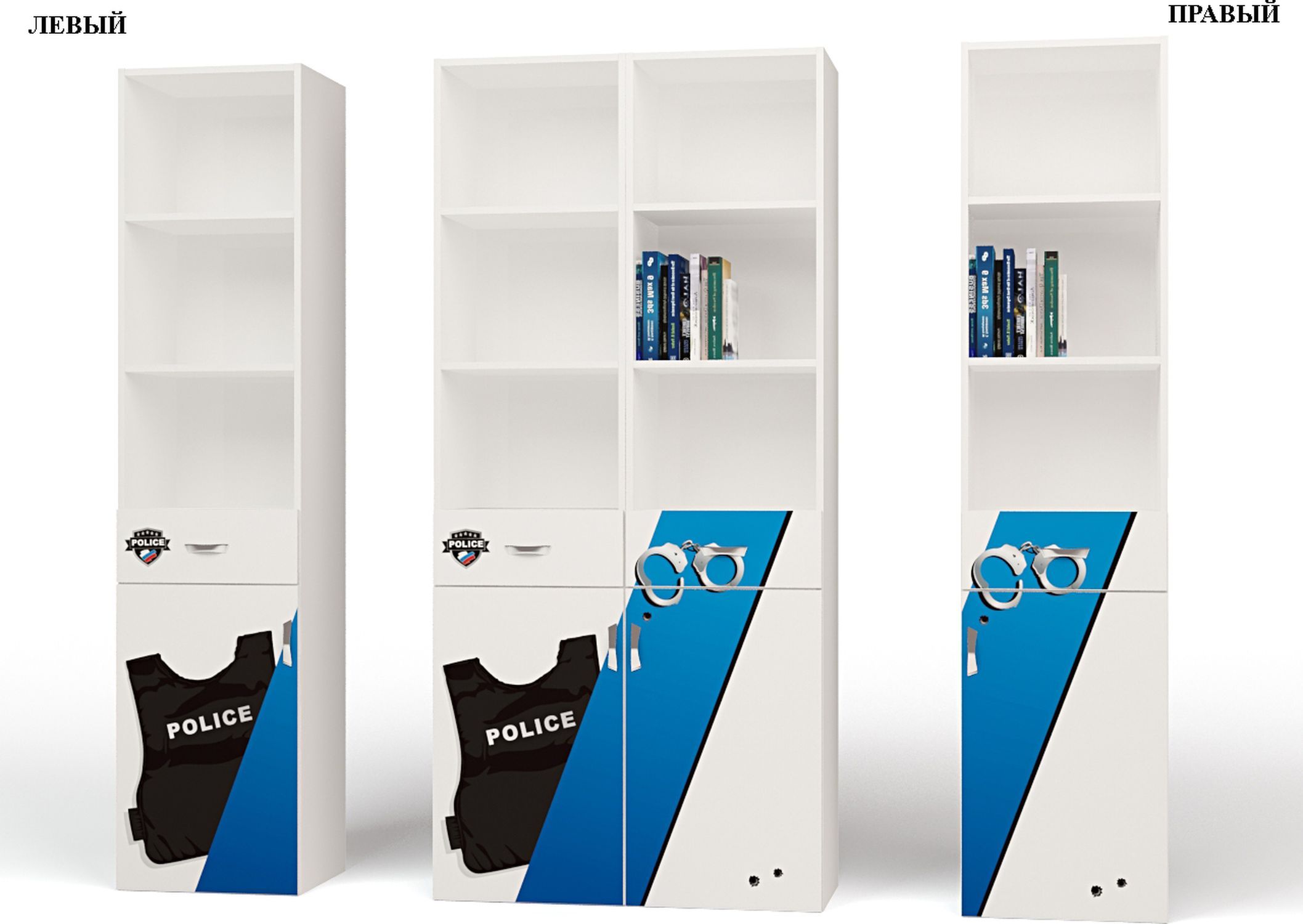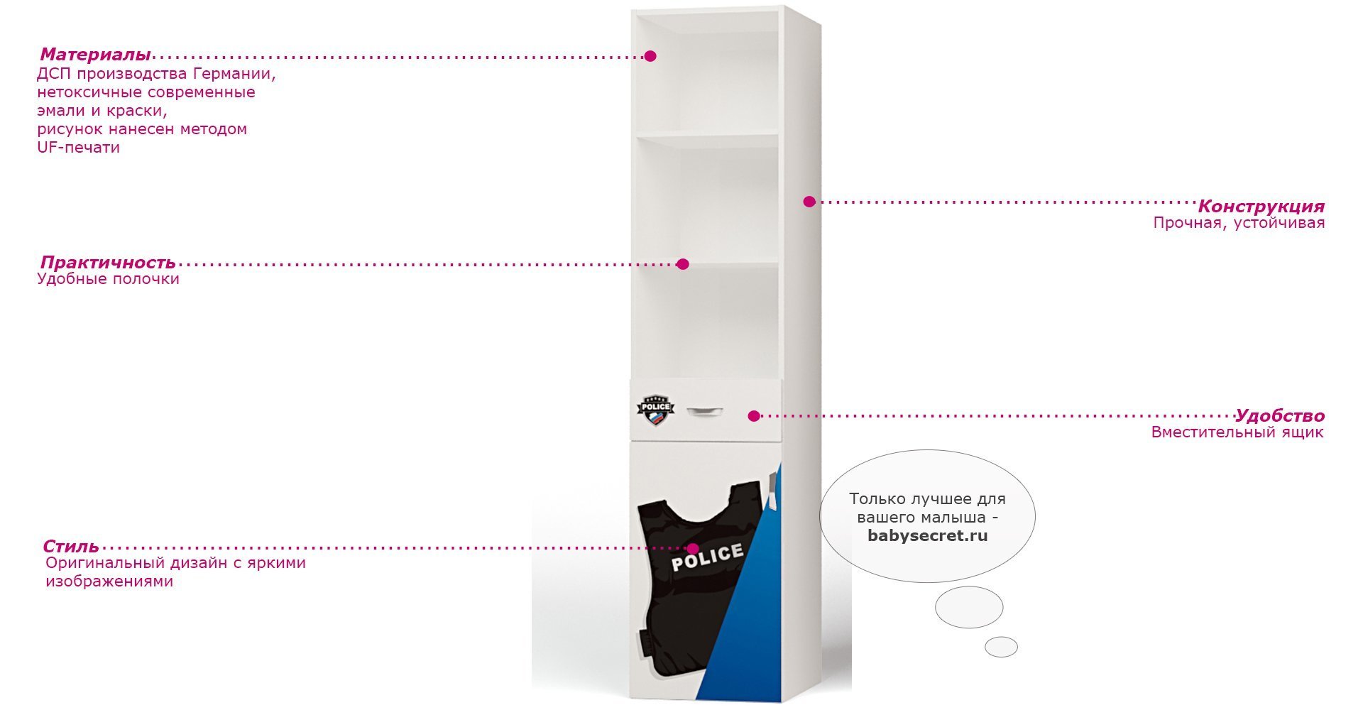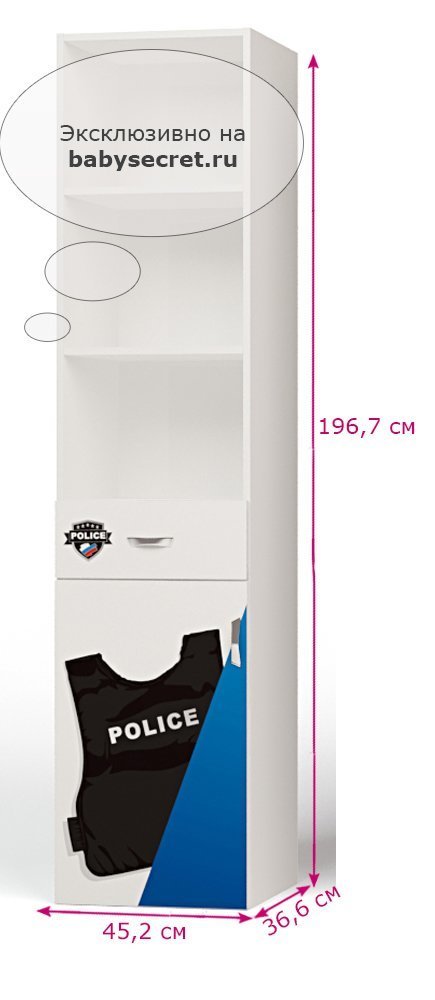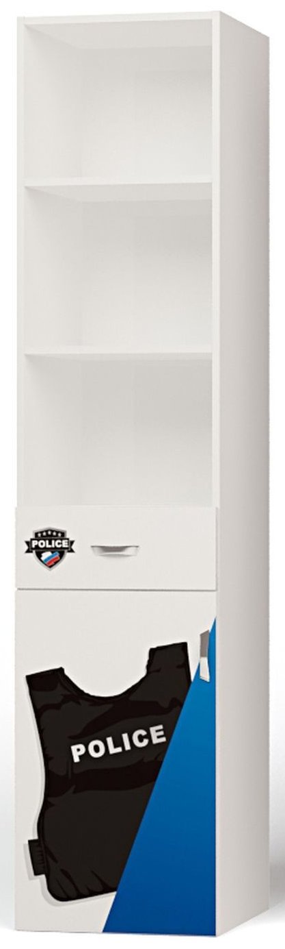 Приятные особенности стеллажаABC KingPolice: сделан из экологически чистых материалов, безопасных для детей. Основой является ДСП производства Германии, где предъявляются самые строгие требования к качеству. Стеллаж имеет 3 открытых полки (для книг, игрушек и др.), вместительные ящики, прочную и устойчивую конструкцию. Дизайн стеллажа выполнен в полицейском стиле. Картинки, украшающие фасады мебели нарисованы акриловыми красками, которые безвредны для человека, экологически чисты, долго держатся и не выцветают.