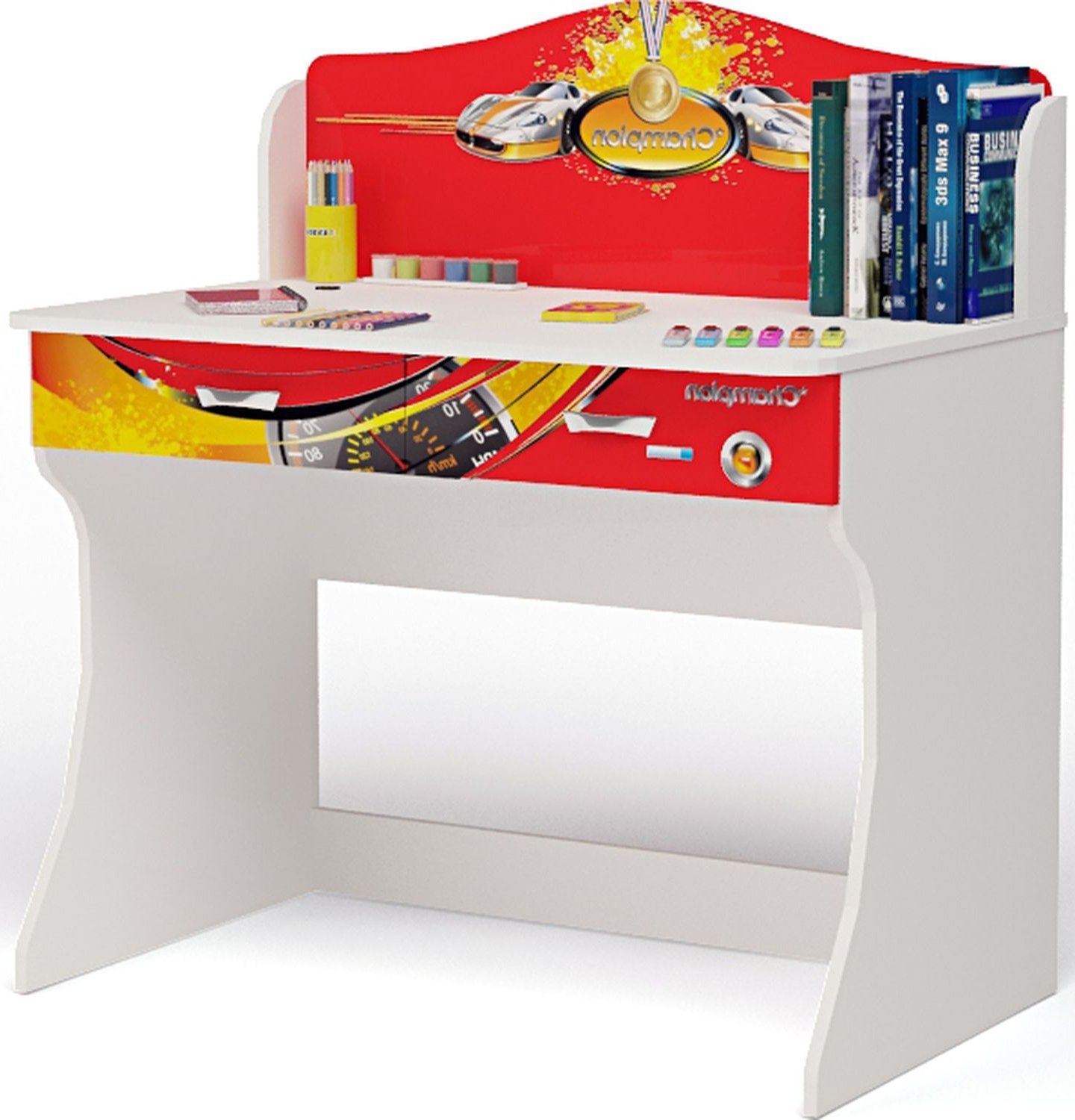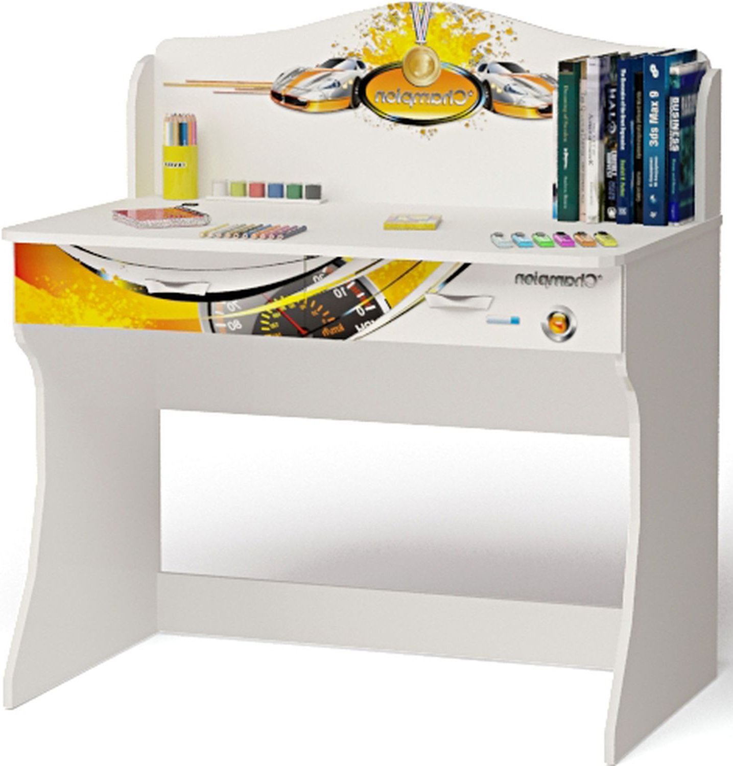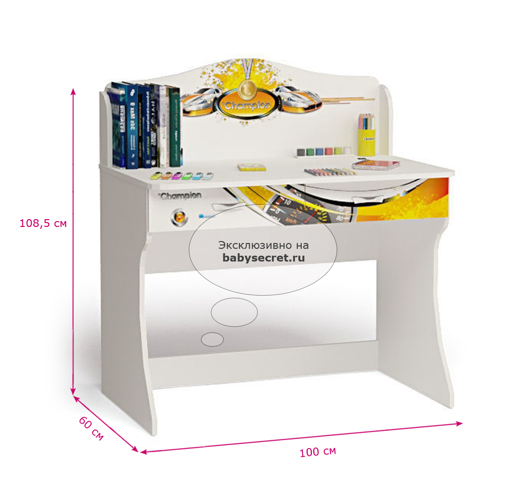 Приятные особенности стола Champion: дизайн стола оформлен в общем стиле комнаты, что делает его приятным дополнением. Корпус сделан из экологически чистых материалов, безопасных для детей. Основой является ДСП производства Германии, где предъявляются самые строгие требования к качеству. У мебели есть преимущество, которое понравится, как детям, так и взрослым. Детскую мебель можно красиво оформить специальными картинками, которые изготовлены из прочных и долговечных материалов, позволяющих проводить влажную уборку. Картинки, украшающие фасады мебели нарисованы акриловыми красками, которые безвредны для человека, экологически чисты, долго держатся и не выцветают.