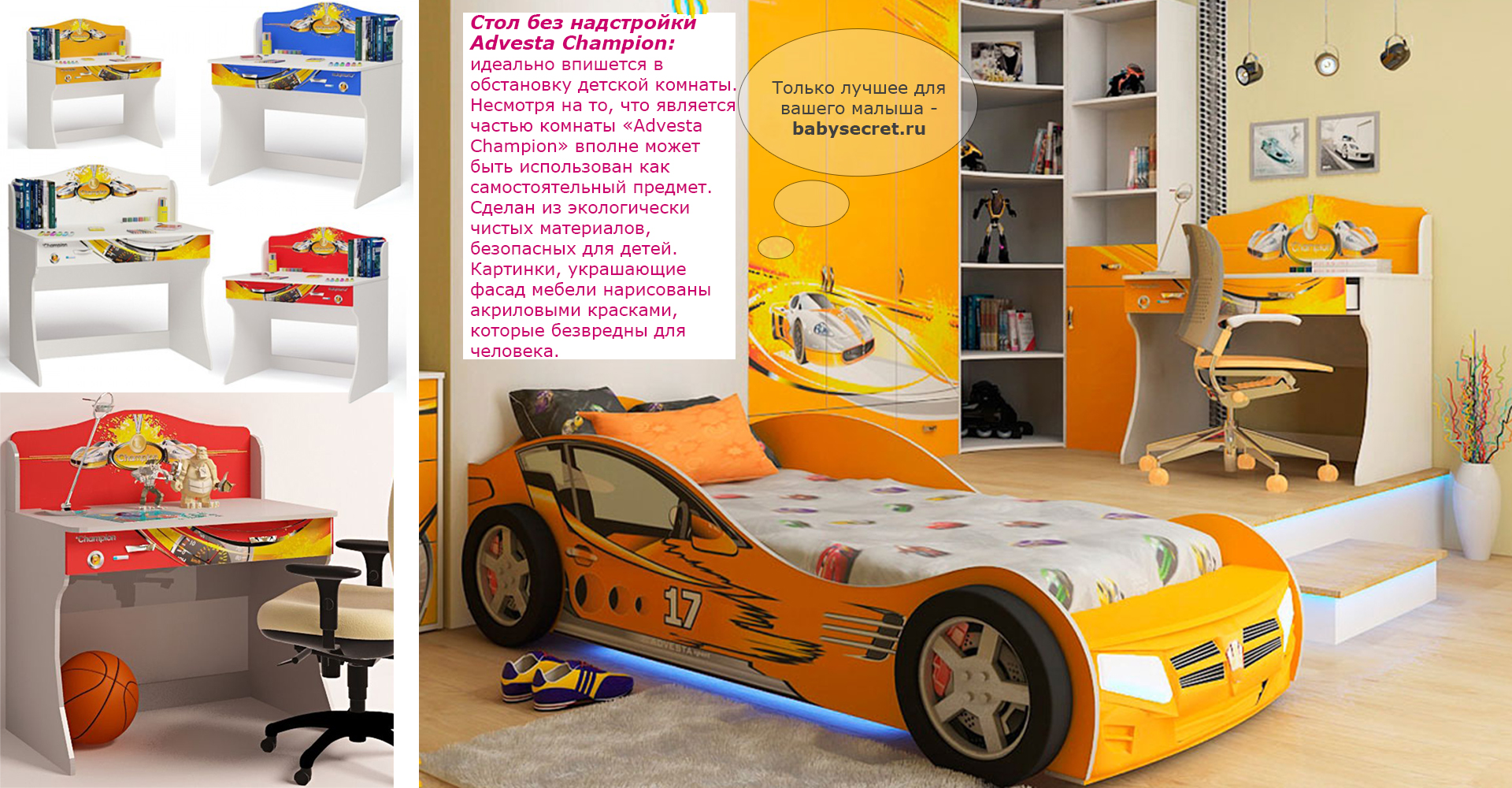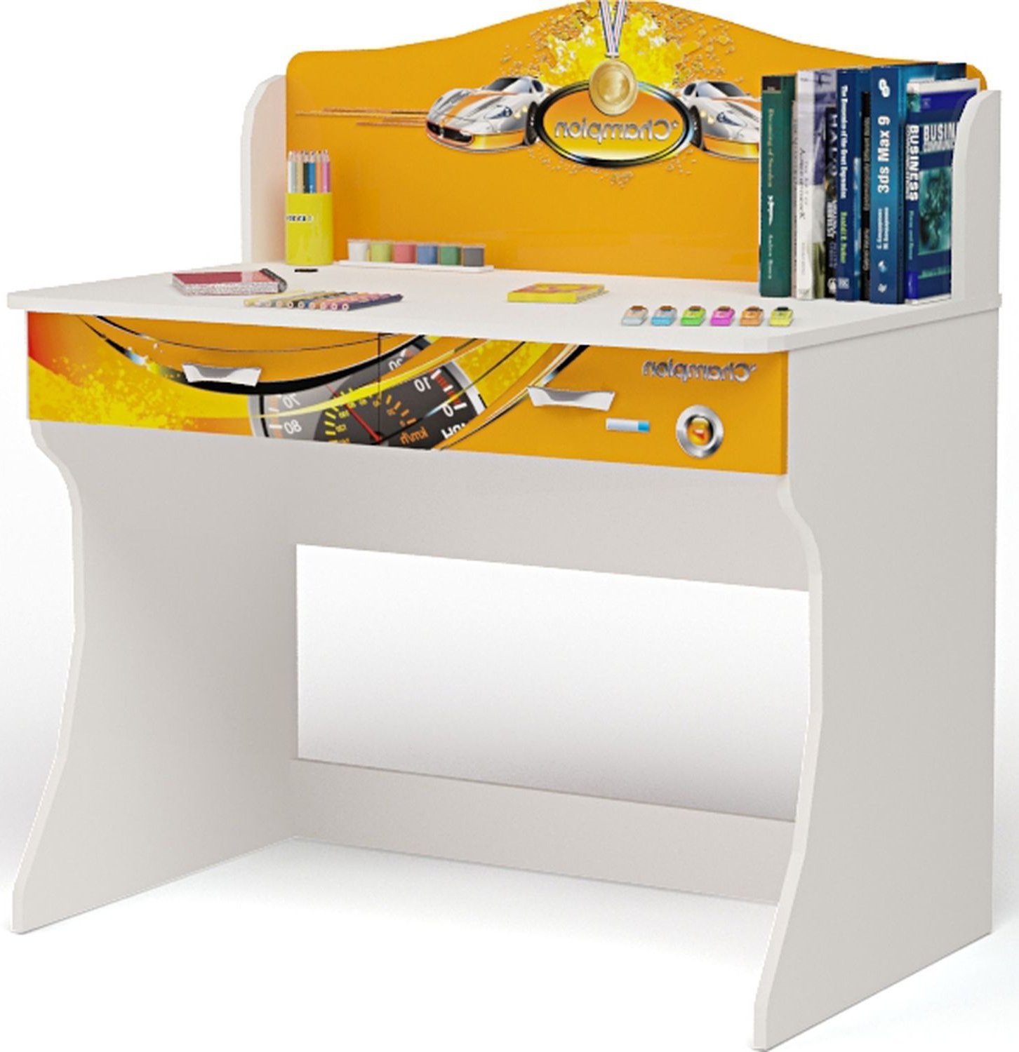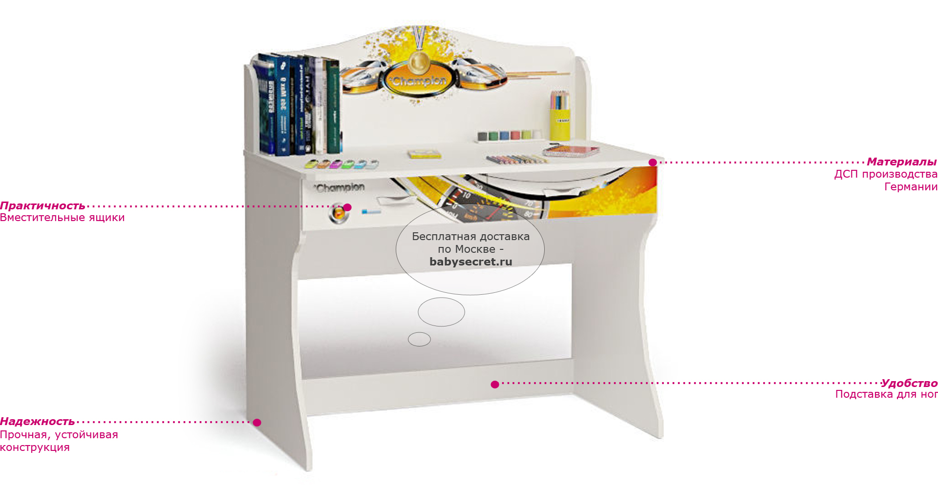 Приятные особенности стола Champion: дизайн стола оформлен в общем стиле комнаты, что делает его приятным дополнением. Корпус сделан из экологически чистых материалов, безопасных для детей. Основой является ДСП производства Германии, где предъявляются самые строгие требования к качеству. У мебели есть преимущество, которое понравится, как детям, так и взрослым. Детскую мебель можно красиво оформить специальными картинками, которые изготовлены из прочных и долговечных материалов, позволяющих проводить влажную уборку. Картинки, украшающие фасады мебели нарисованы акриловыми красками, которые безвредны для человека, экологически чисты, долго держатся и не выцветают.