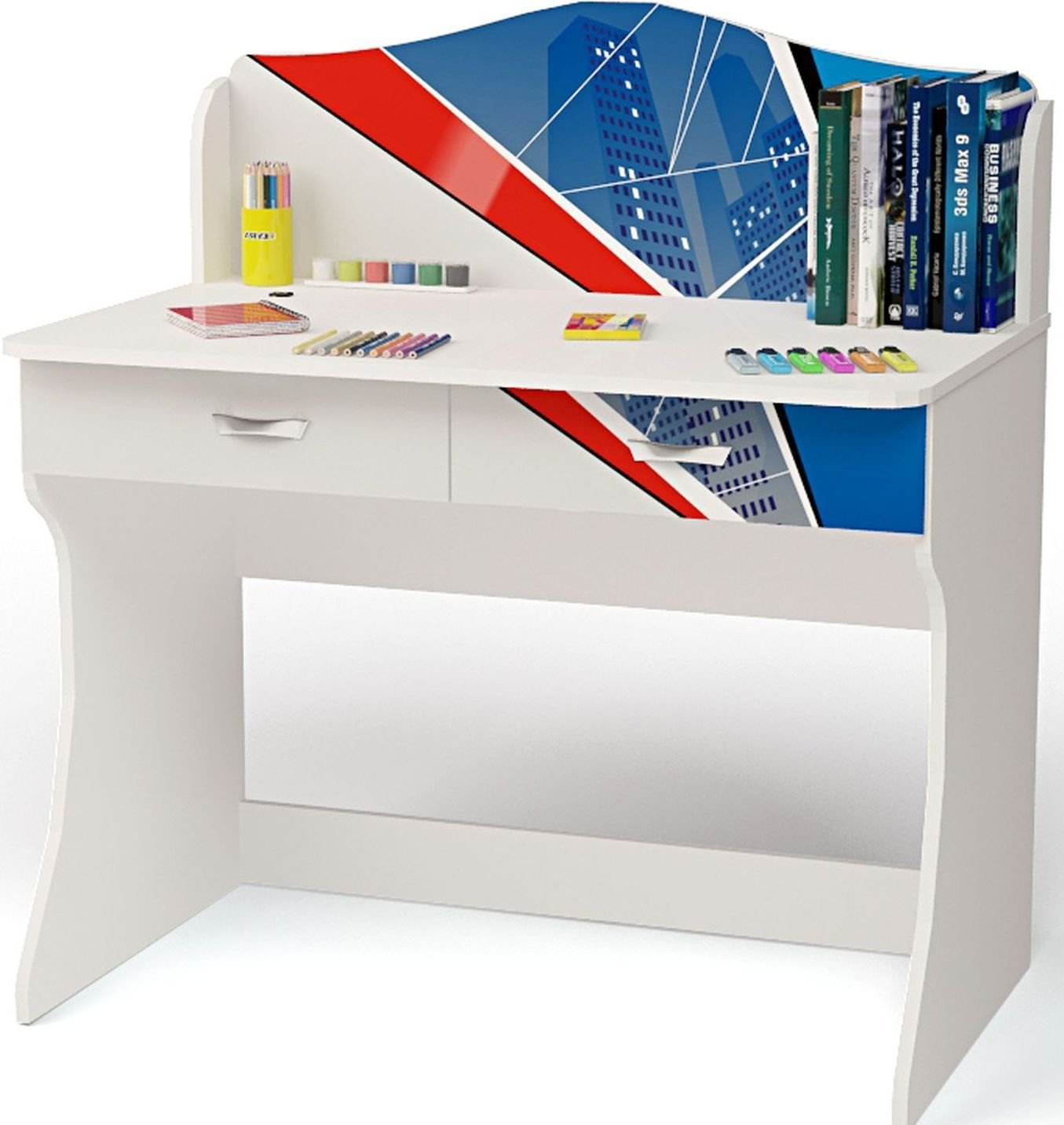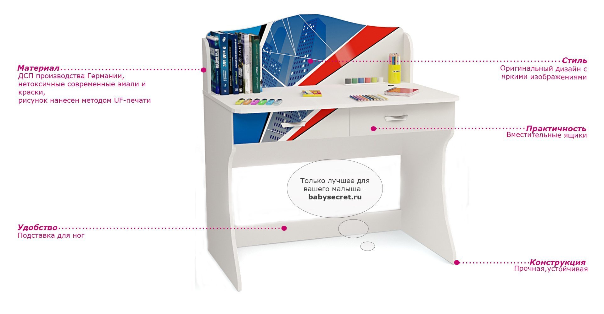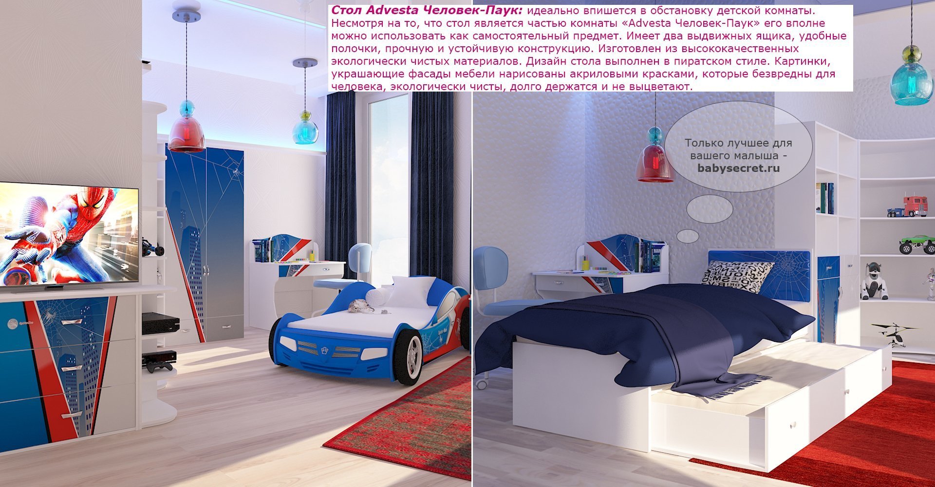 Приятные особенности стола Человек-Паук: идеально впишется в обстановку детской комнаты. Несмотря на то, что стол является частью комнаты «Человек-Паук» его вполне можно использовать как самостоятельный предмет. Имеет два выдвижных ящика, удобные полочки, прочную и устойчивую конструкцию. Изготовлен из высококачественных экологически чистых материалов. Дизайн стола выполнен в пиратском стиле. Картинки, украшающие фасады мебели нарисованы акриловыми красками, которые безвредны для человека, экологически чисты, долго держатся и не выцветают.